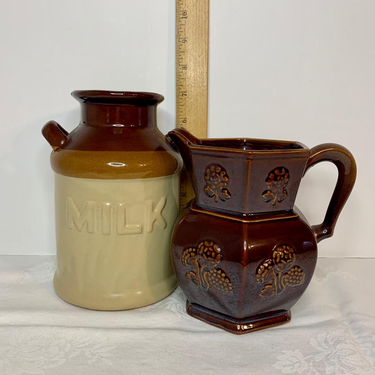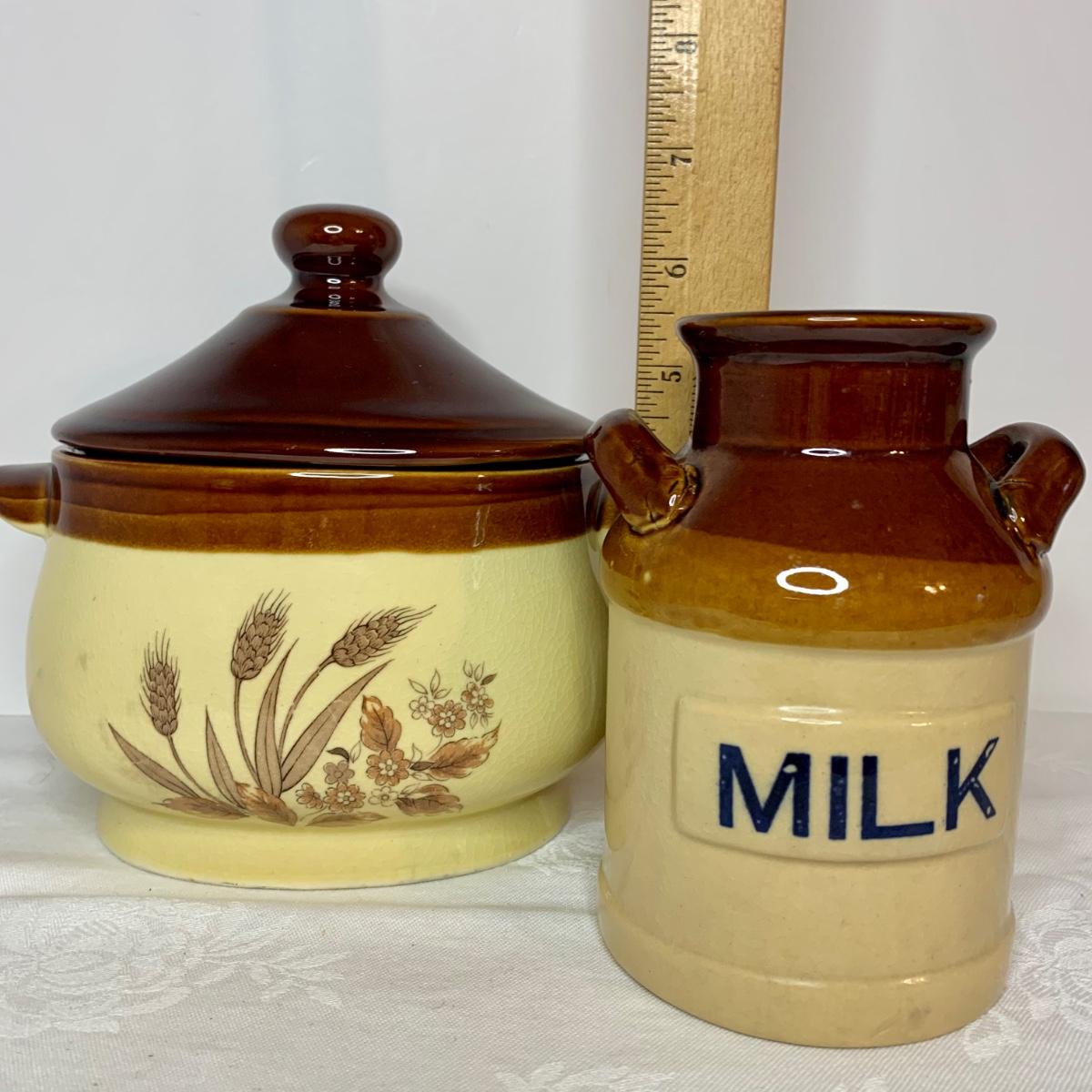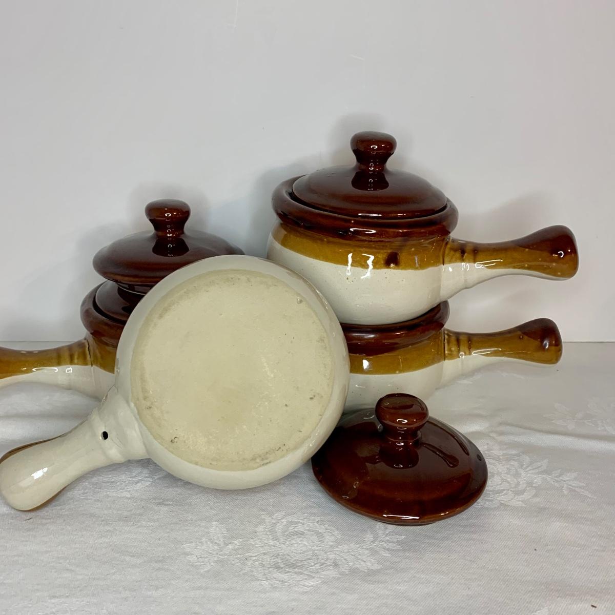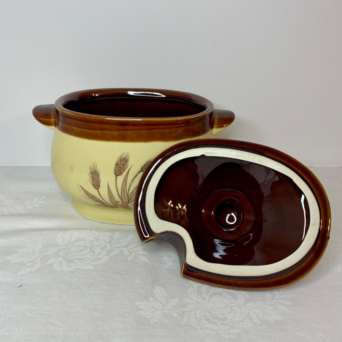 LOT 21: Country Crocks in Browns, Yellows & Tan: Soup Bowls, Pitcher Utensil Holders