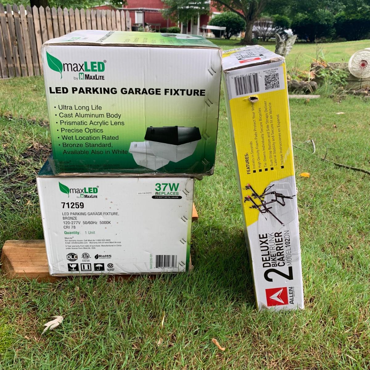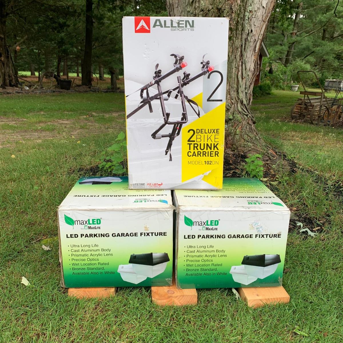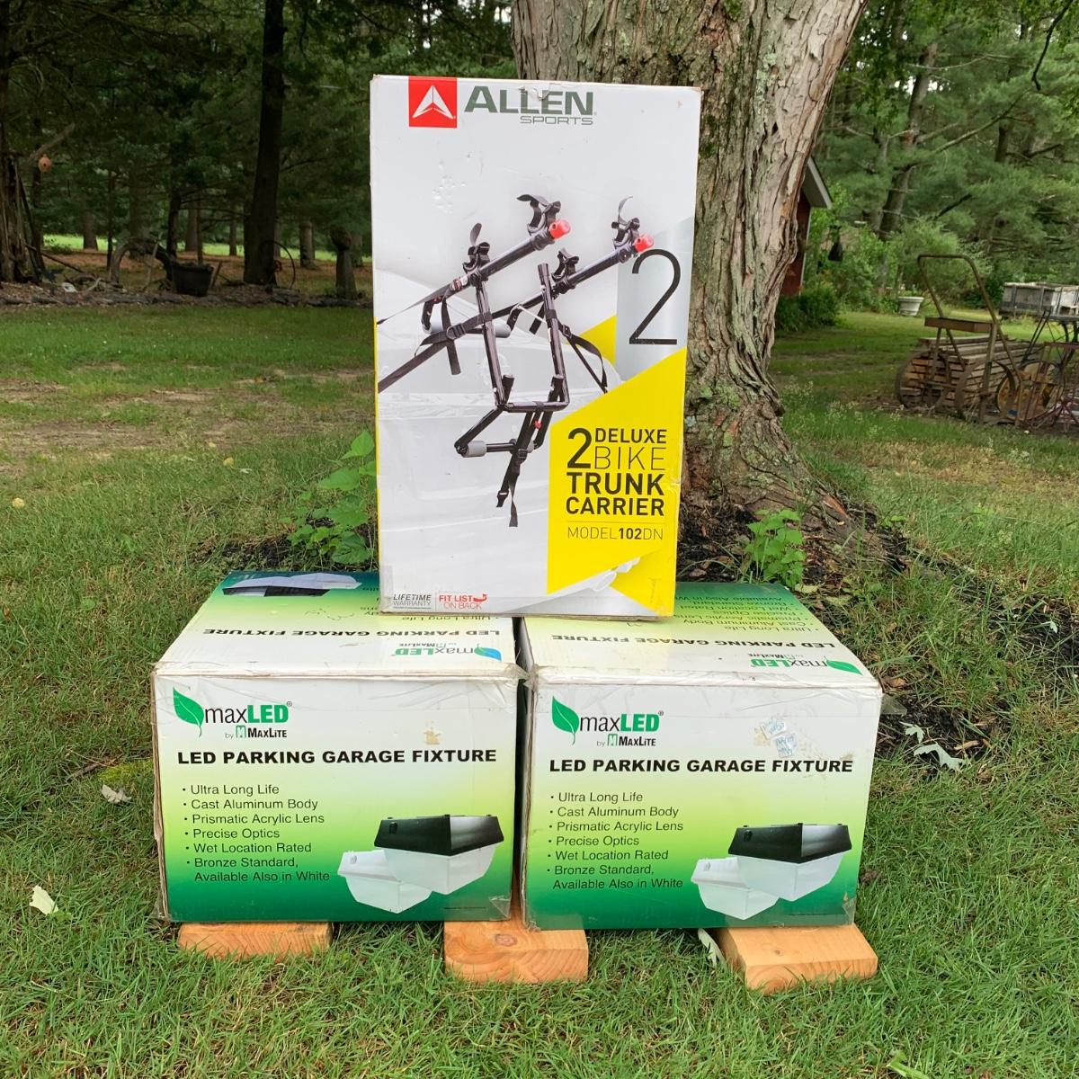 LOT 45: New in Box: 2 Bike Trunk Carrier & Max Lite Garage Fixtures