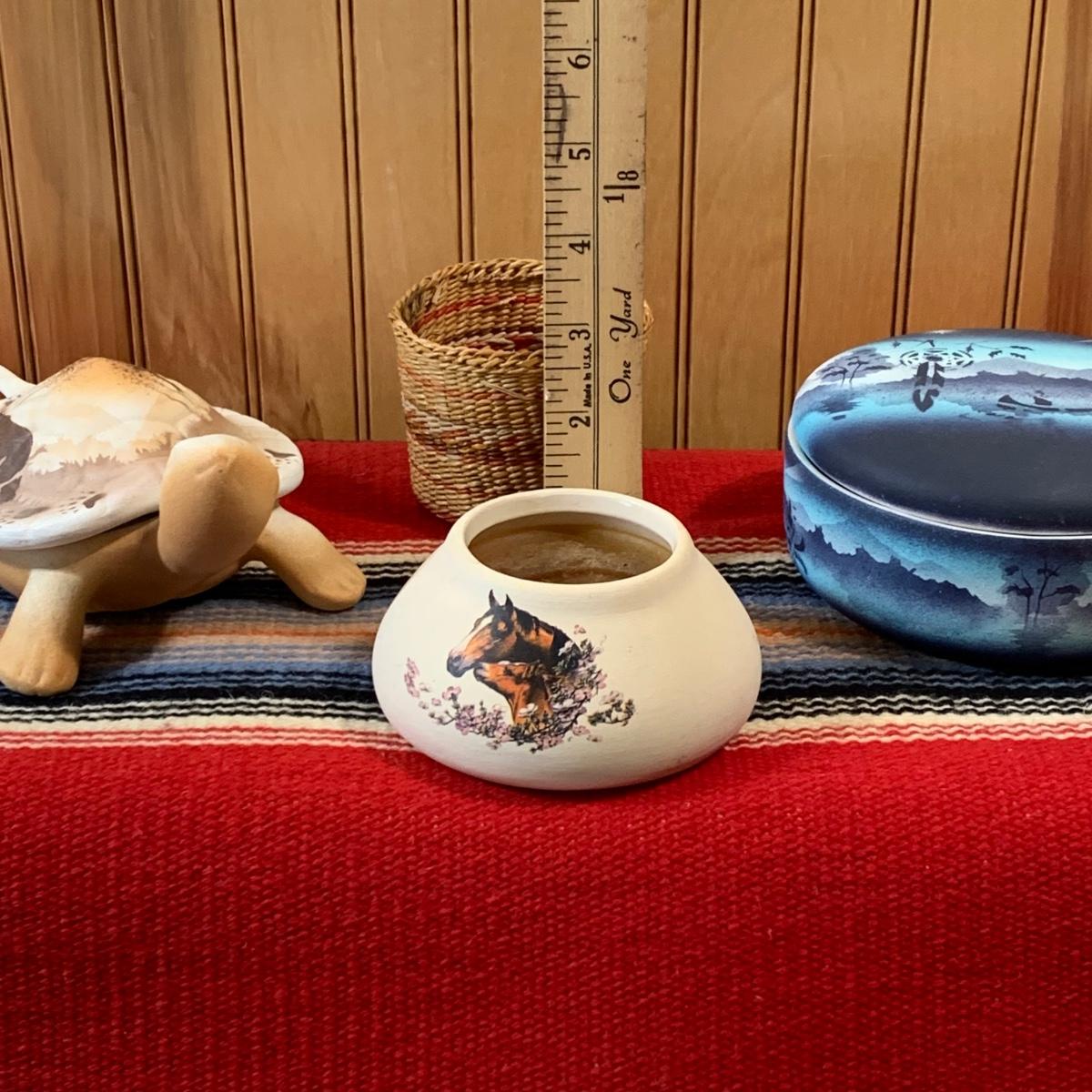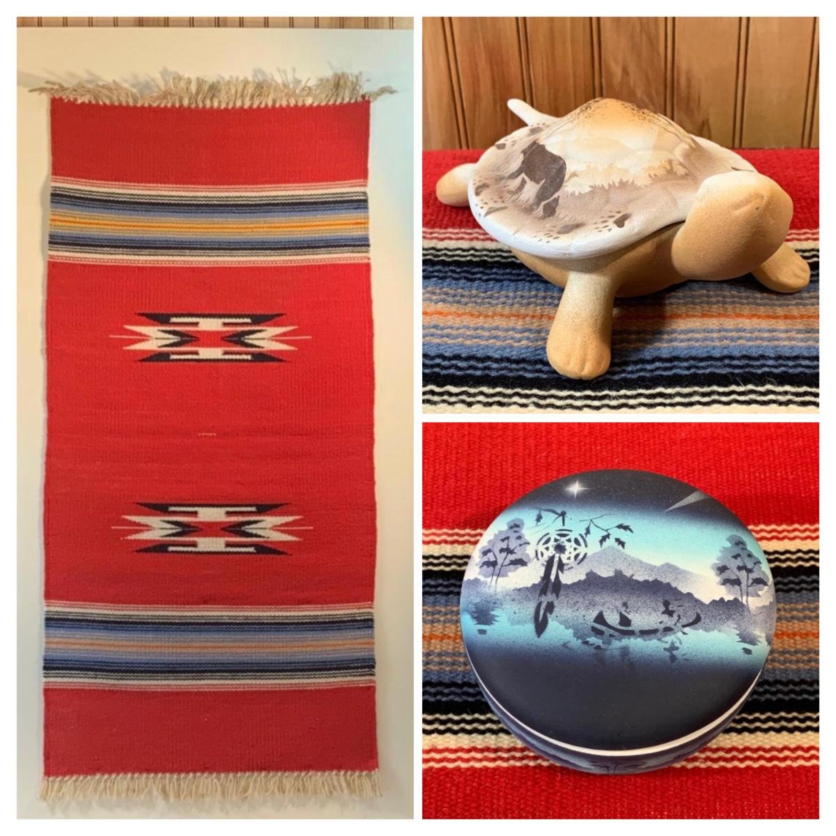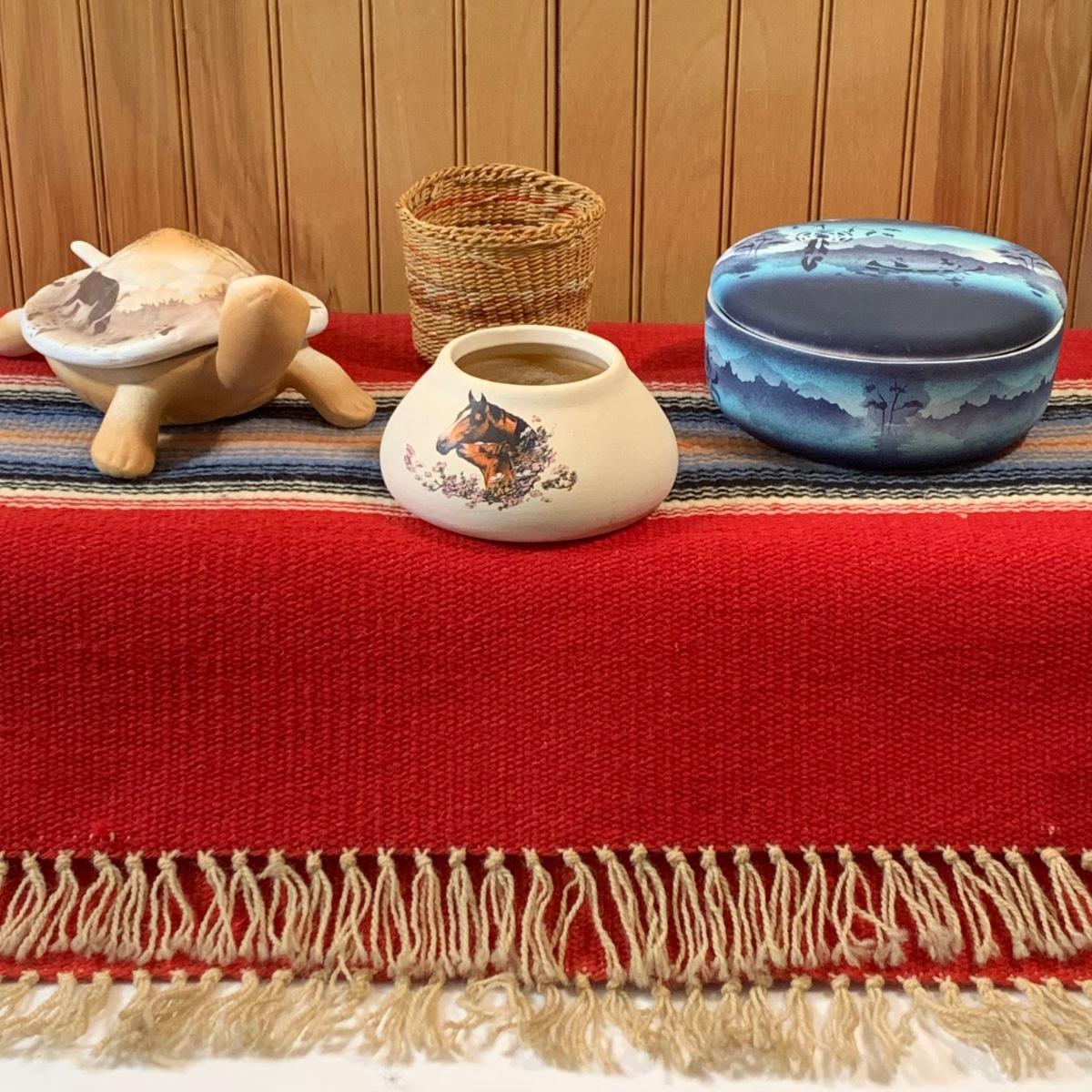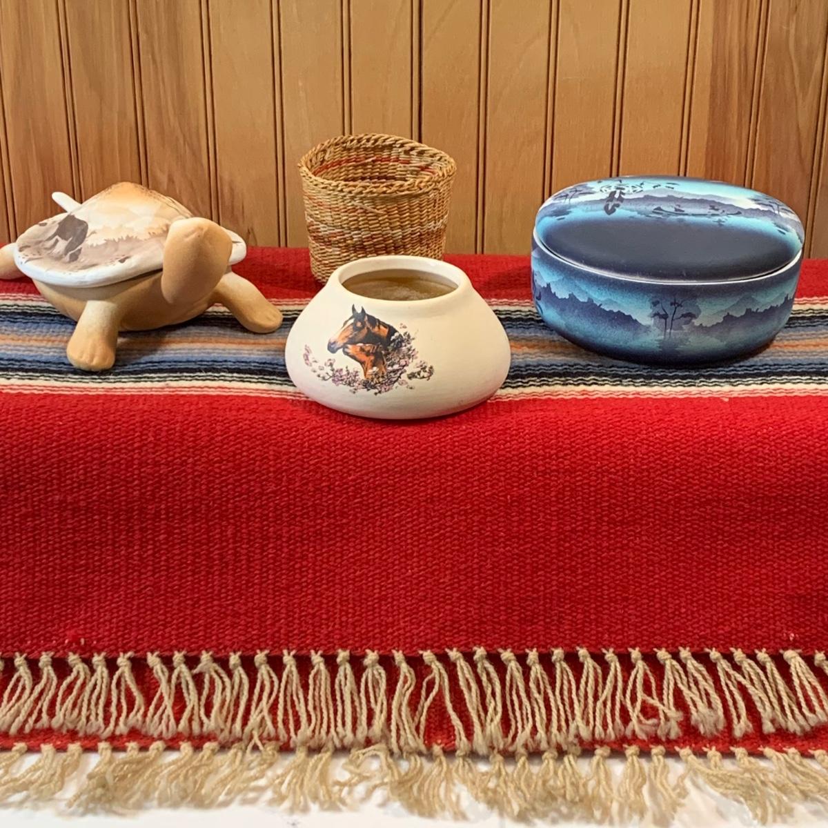 LOT 55: Southwest Collection: Cedar Mesa Pottery, Trinket Basket & Woven Red Tapestry