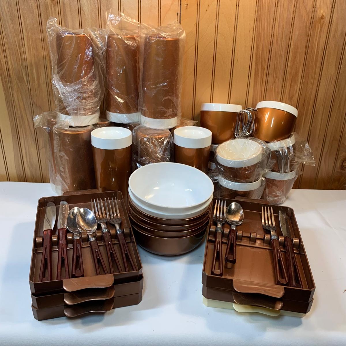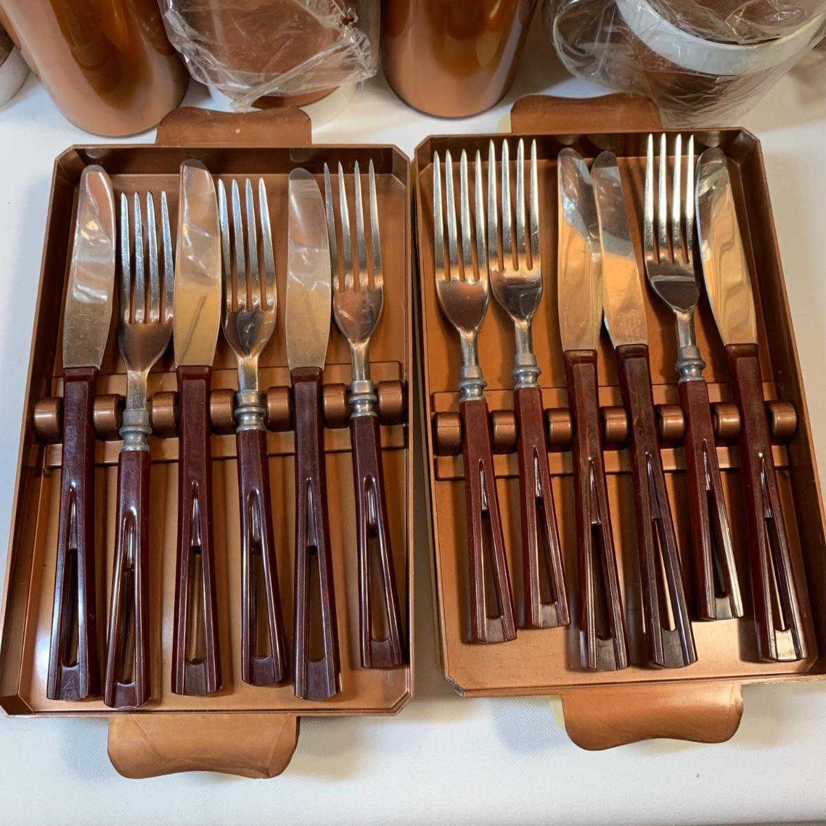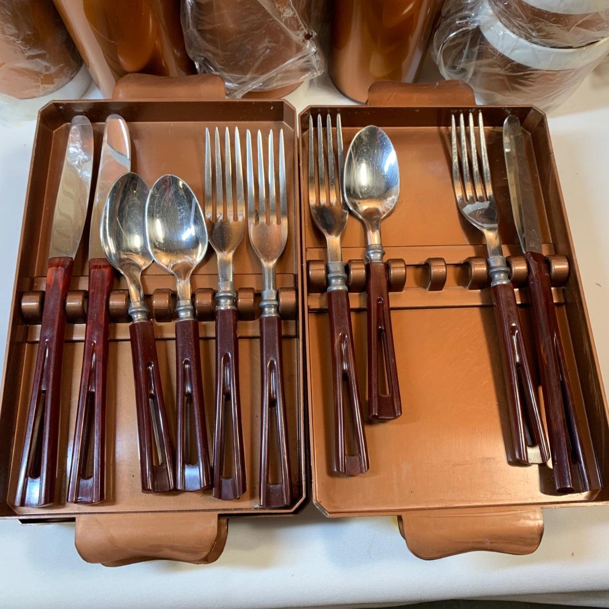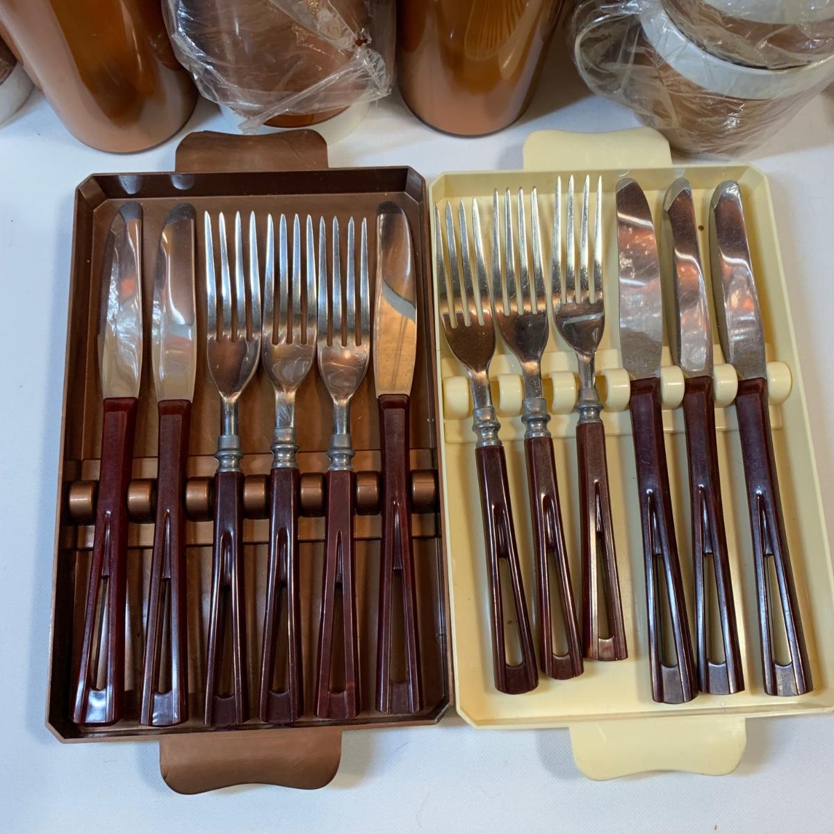 LOT 63:  Vintage MCM Stanhome Stainless Bakelite Handles Forks Spoons Knives in Original Trays, Vintage Thermo-Serv Tumblers & Cups, Gotham Ware Bowls
