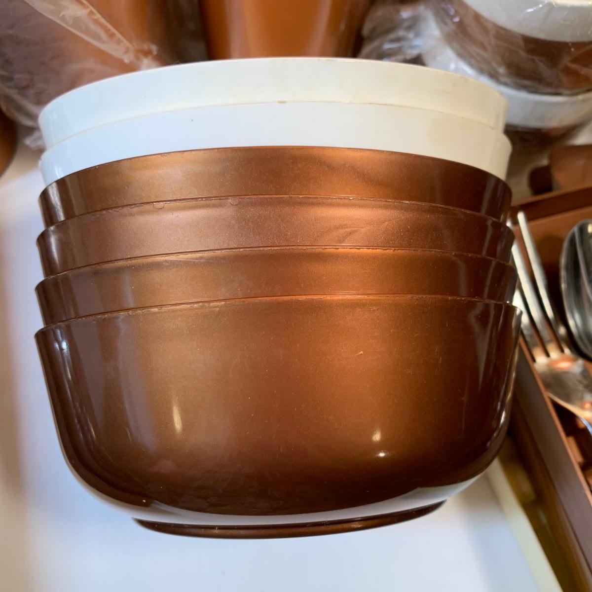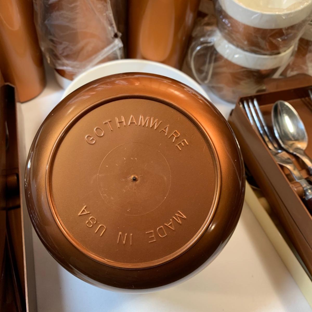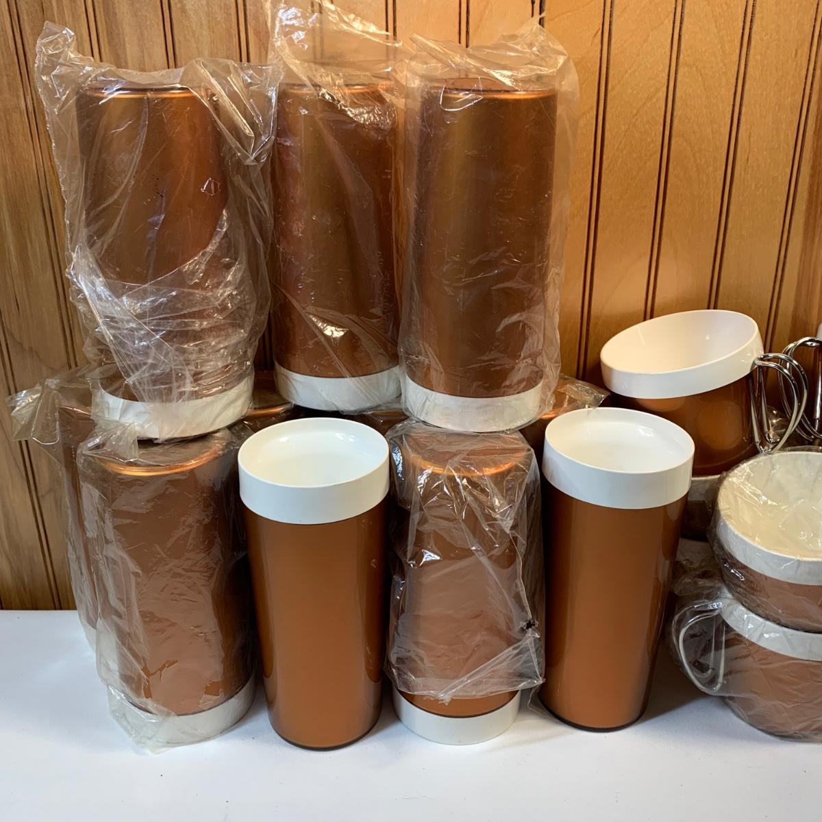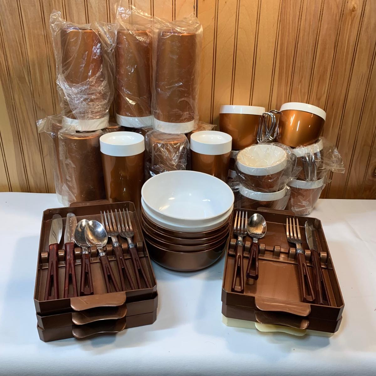 LOT 63:  Vintage MCM Stanhome Stainless Bakelite Handles Forks Spoons Knives in Original Trays, Vintage Thermo-Serv Tumblers & Cups, Gotham Ware Bowls