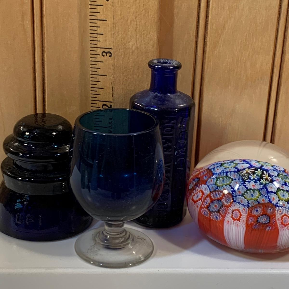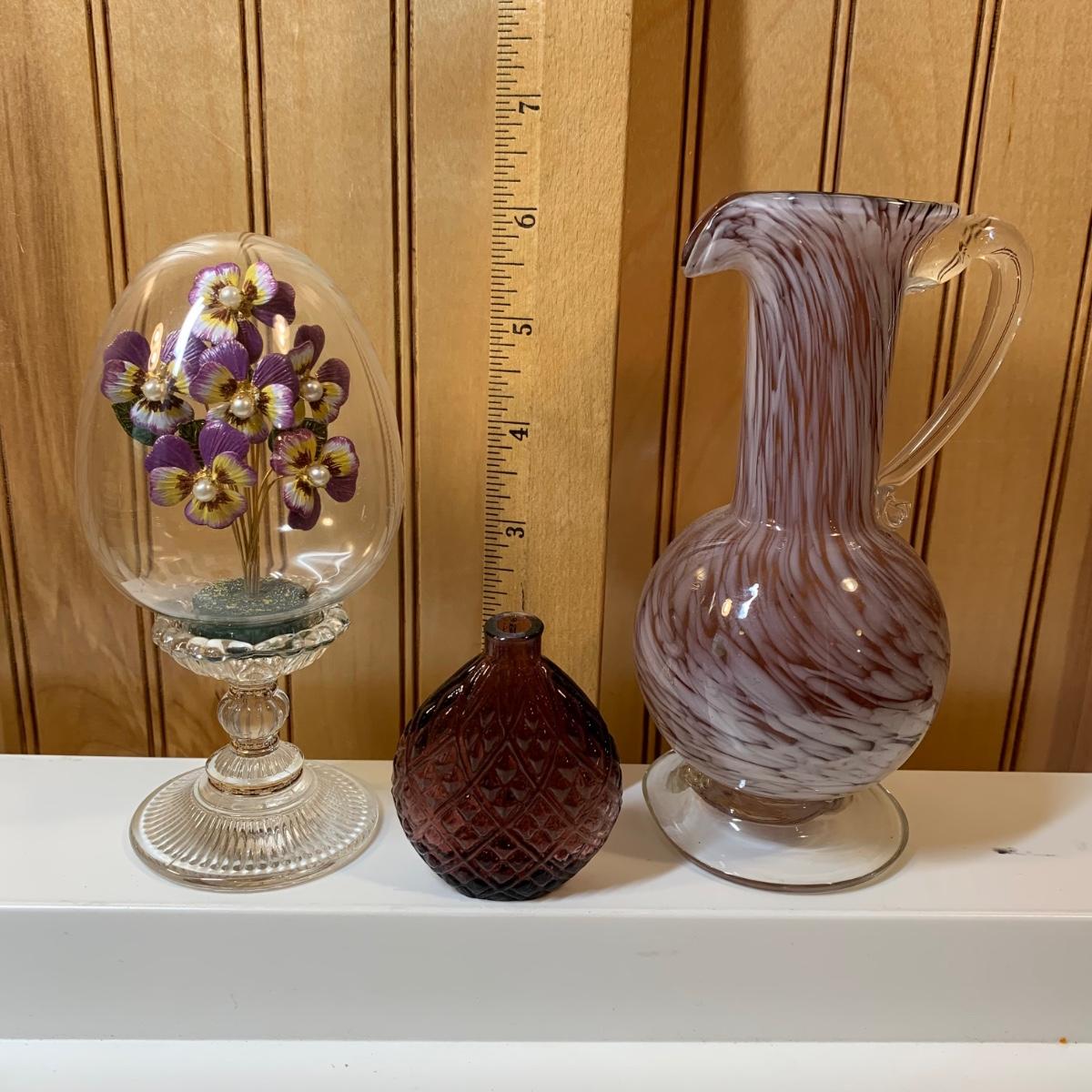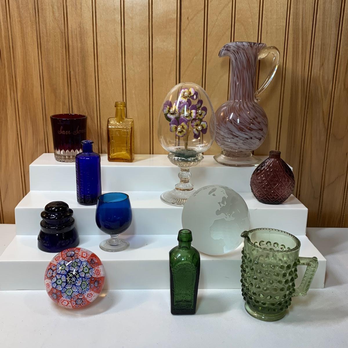 LOT 70: Crafted in Italy Paper Weight, Miniature Wheaton Bottles, TFM Pansy/Purple Flower Bouquet Glass Egg, Cobalt Blue Glass, Hand Blown Pitcher & More