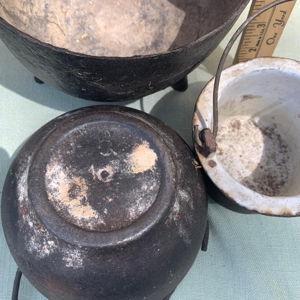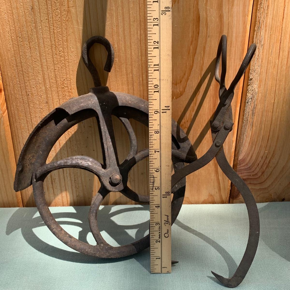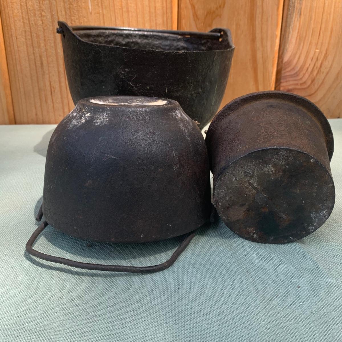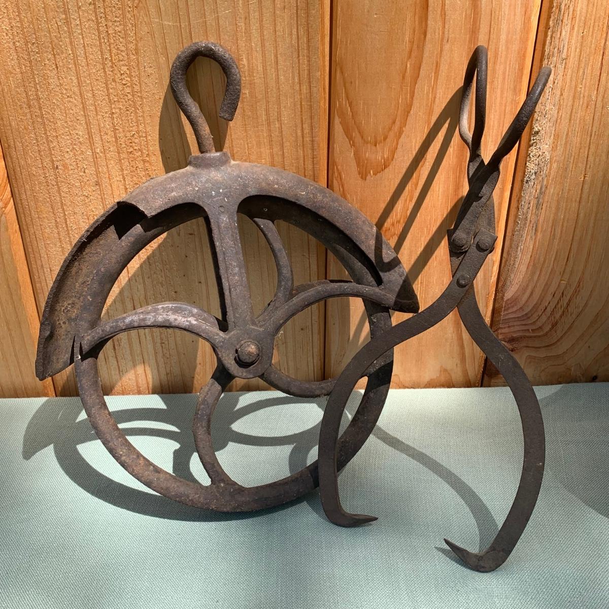 LOT 73: Antique Tools: Cast Iron Melting Pots, Irons, Pulley & More