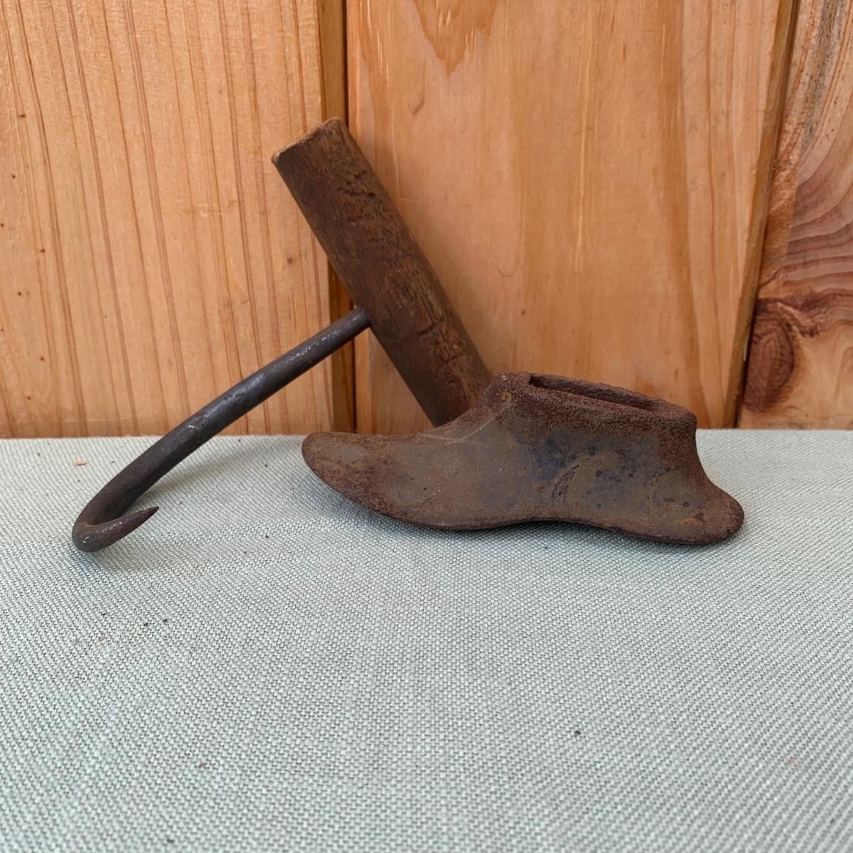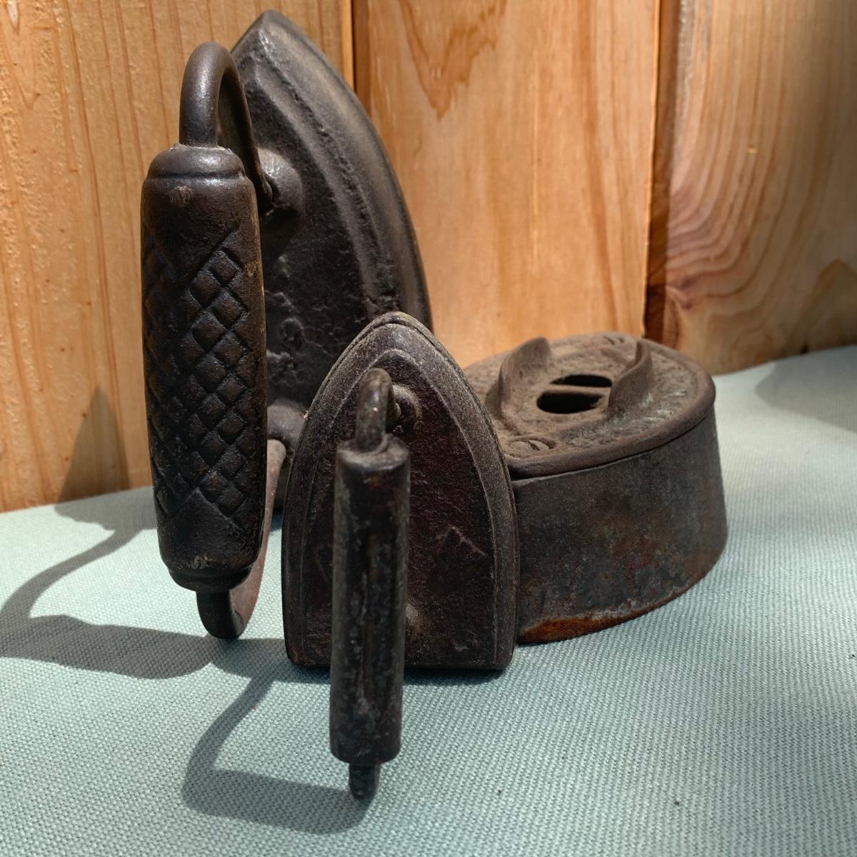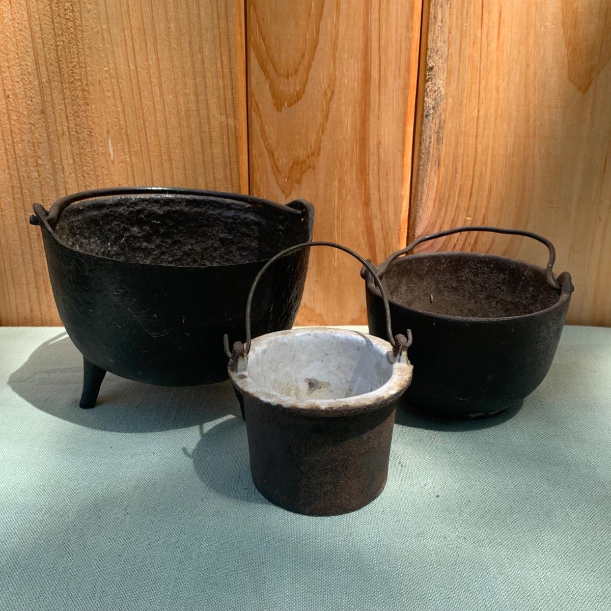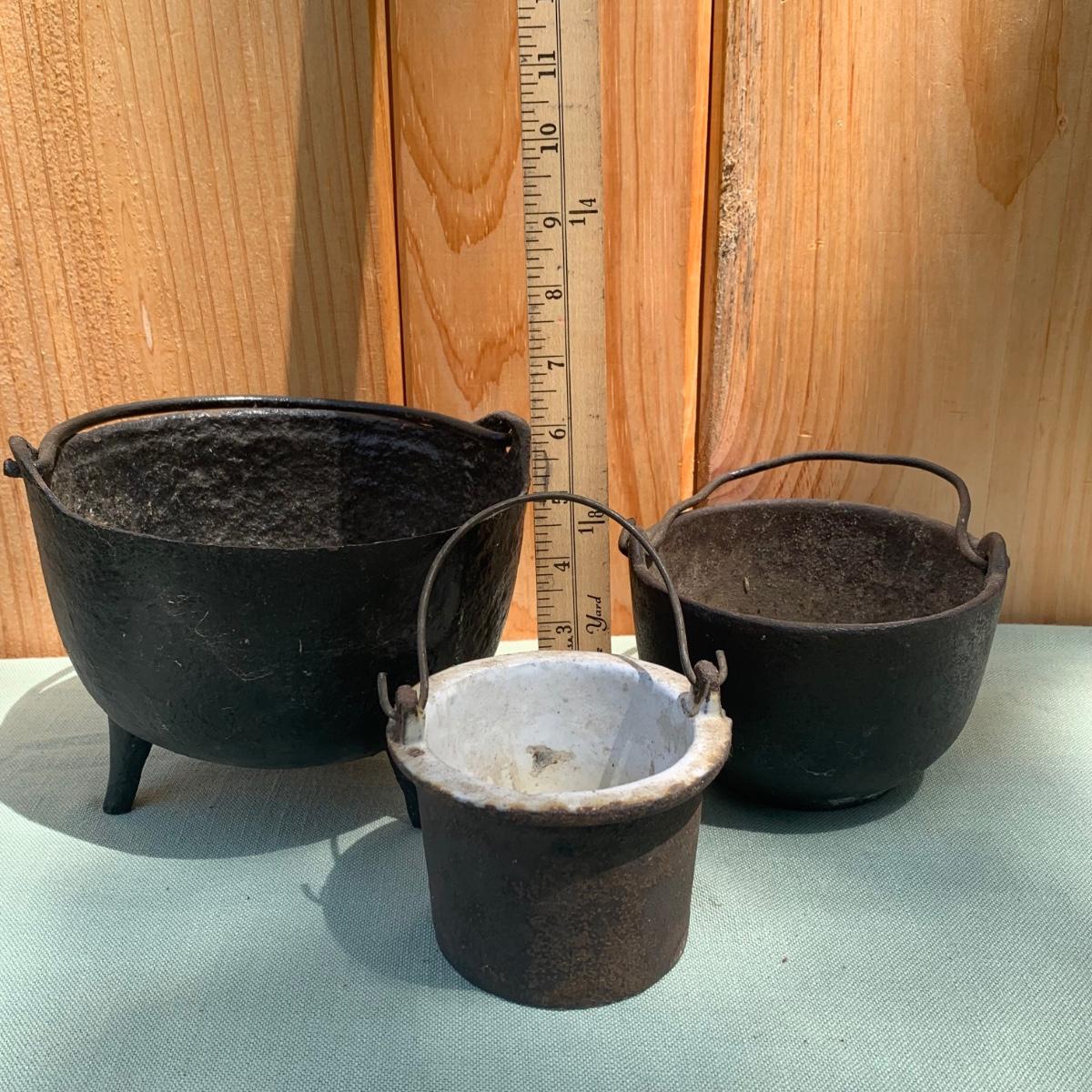LOT 73: Antique Tools: Cast Iron Melting Pots, Irons, Pulley & More