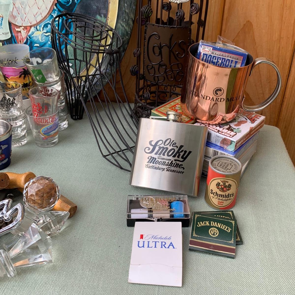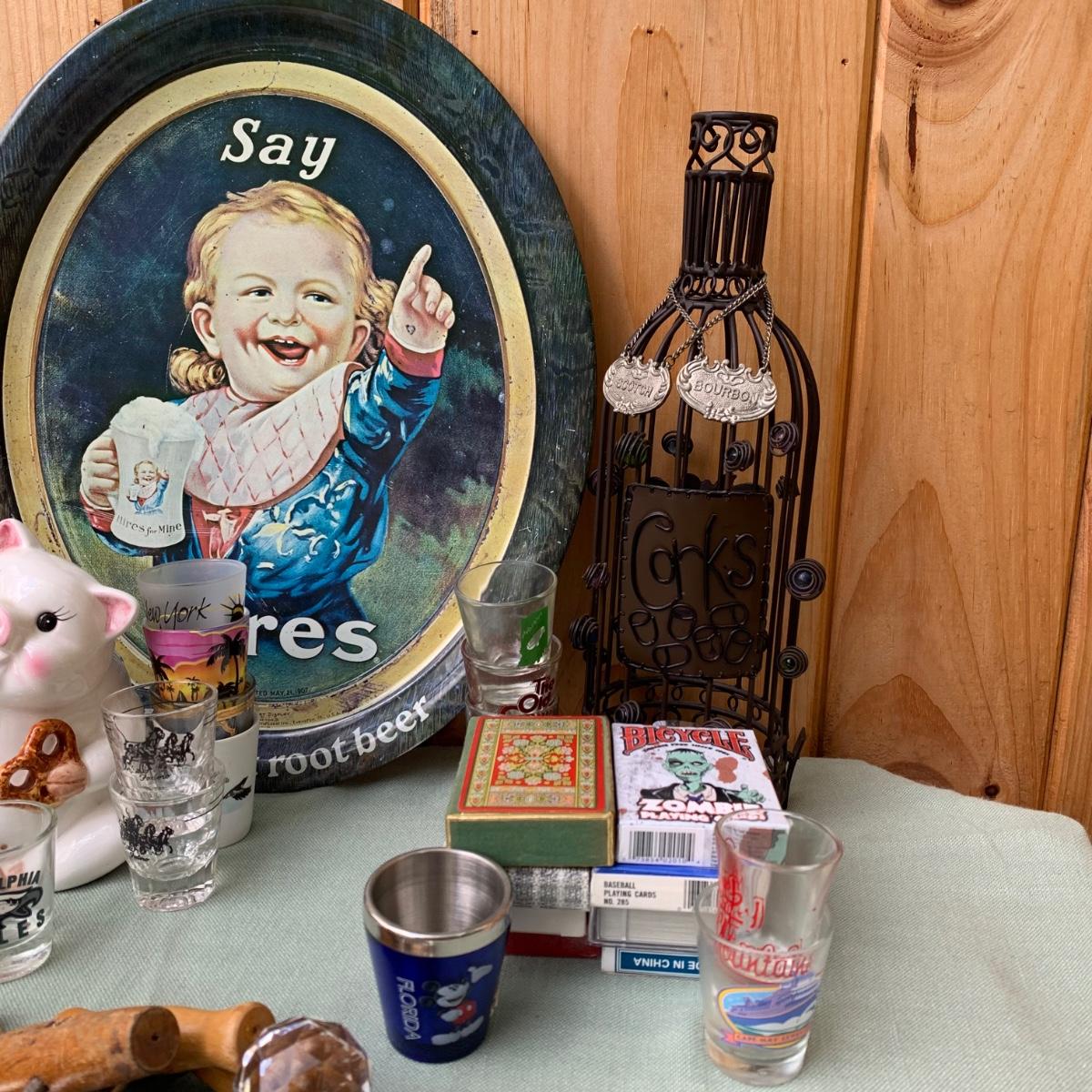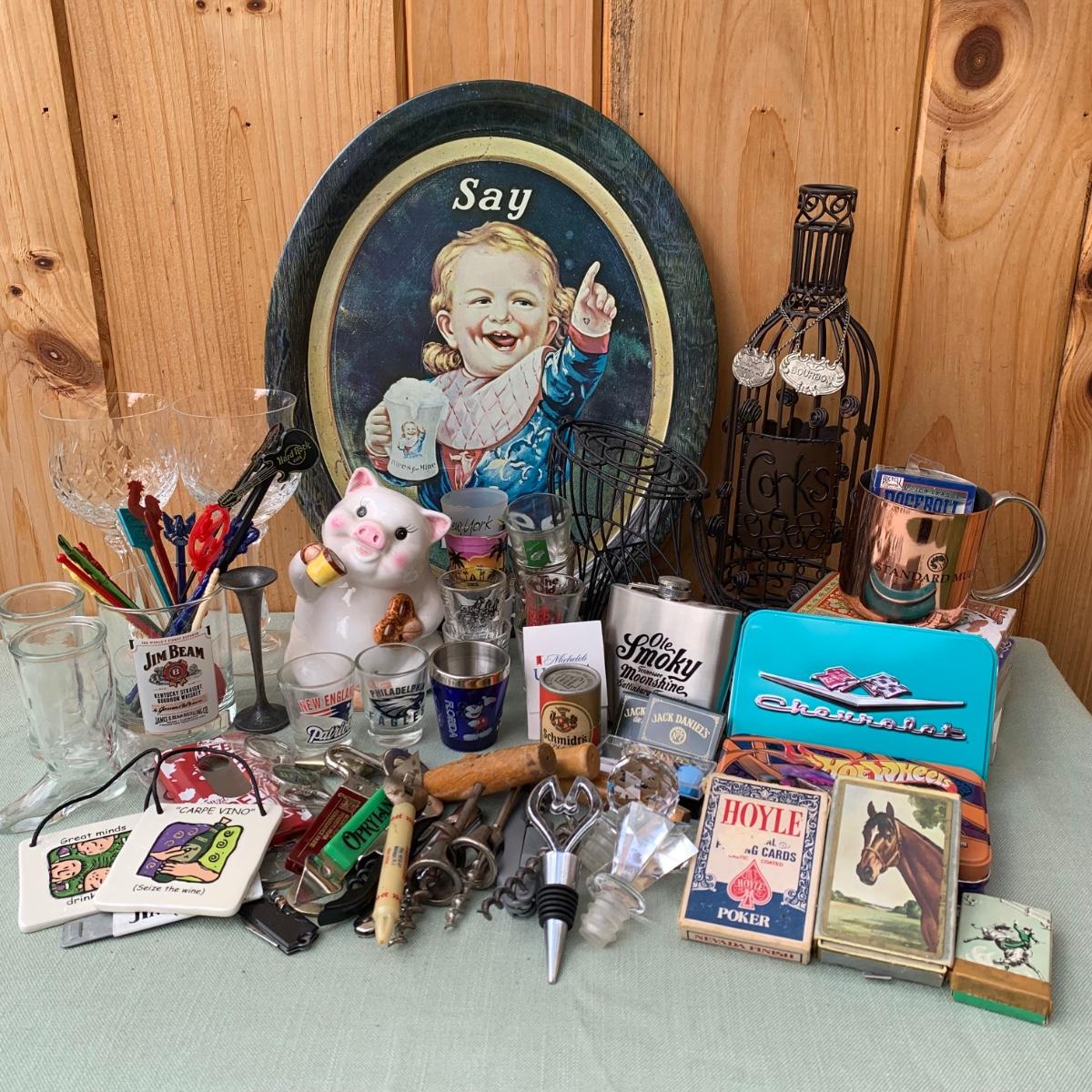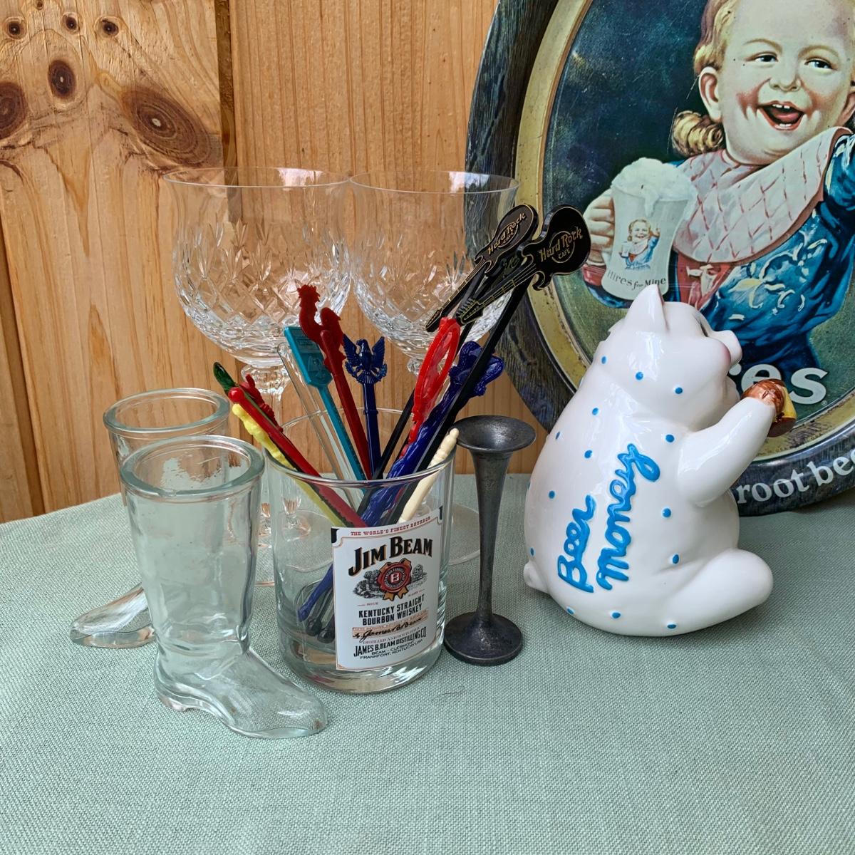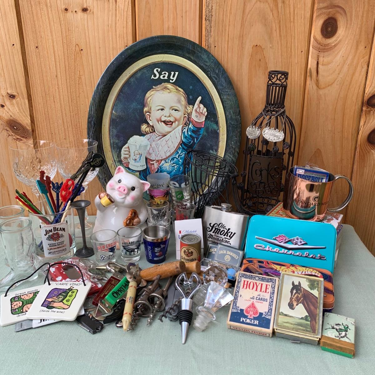 LOT 79: Barware Collection: Hires Rootbeer Tray, Moscow Mule Mugs, Wine Glasses, Cork Holders, Beer Fund Piggy Bank and More