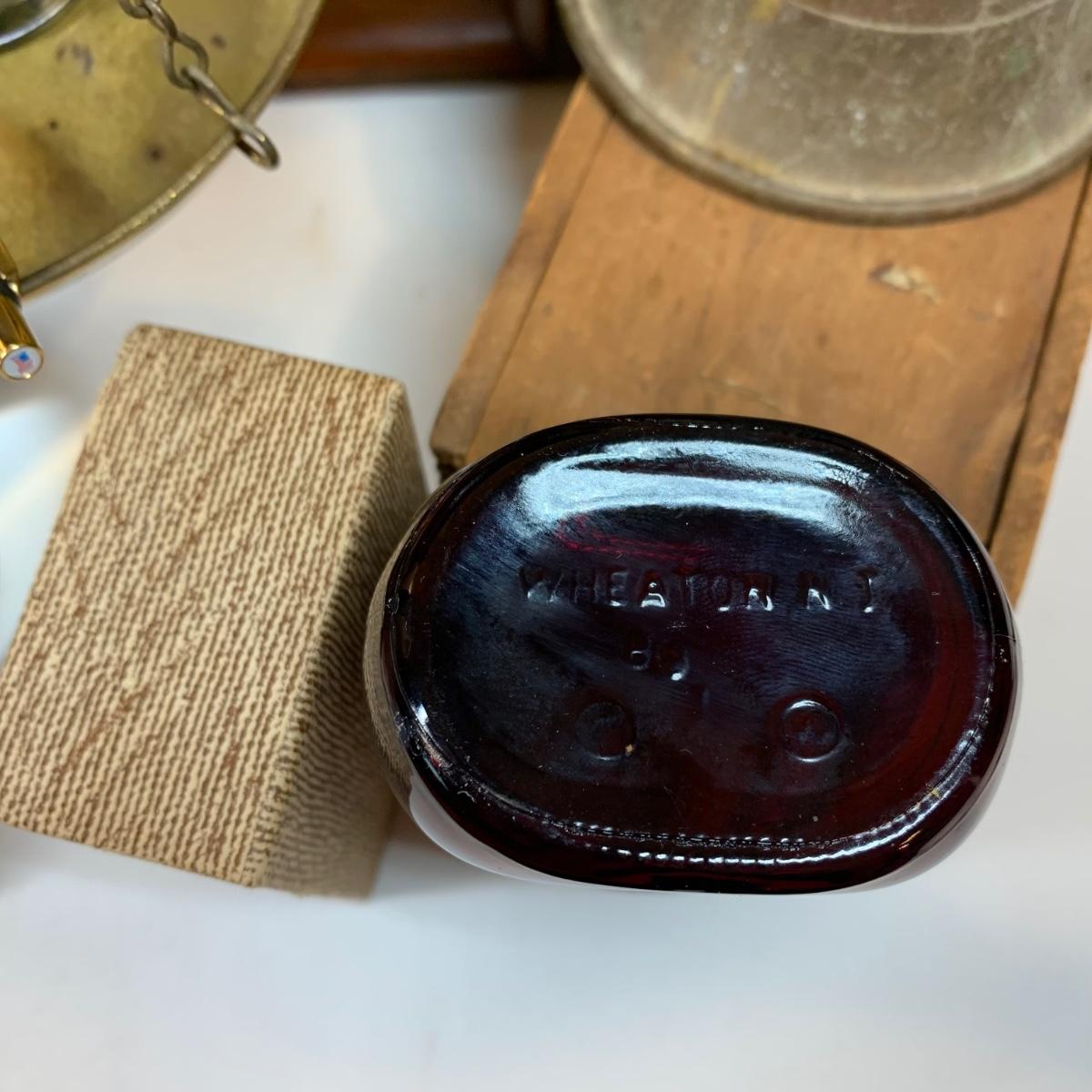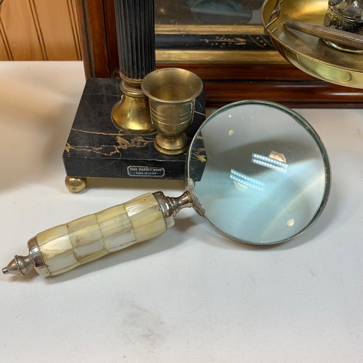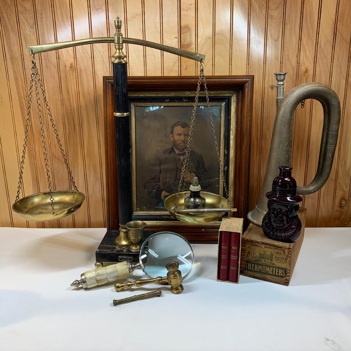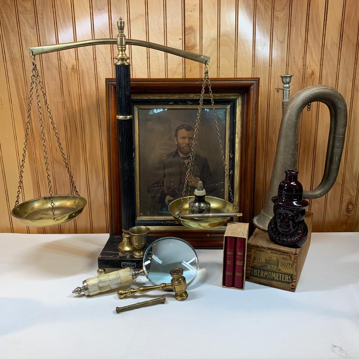 LOT 84: Vintage Military Bugle Horn, Balance Scale Decor w/Marble Base, Magnifying Glass w/Mother of Pearl Handle, Parker Mechanical Pencil, Wheaton Pocahantas Bottle & More