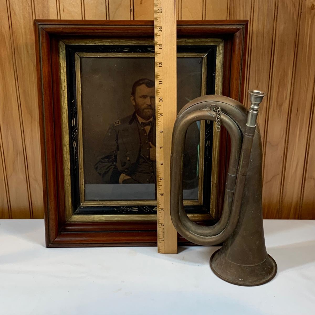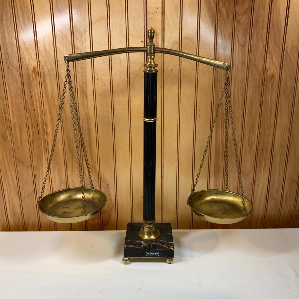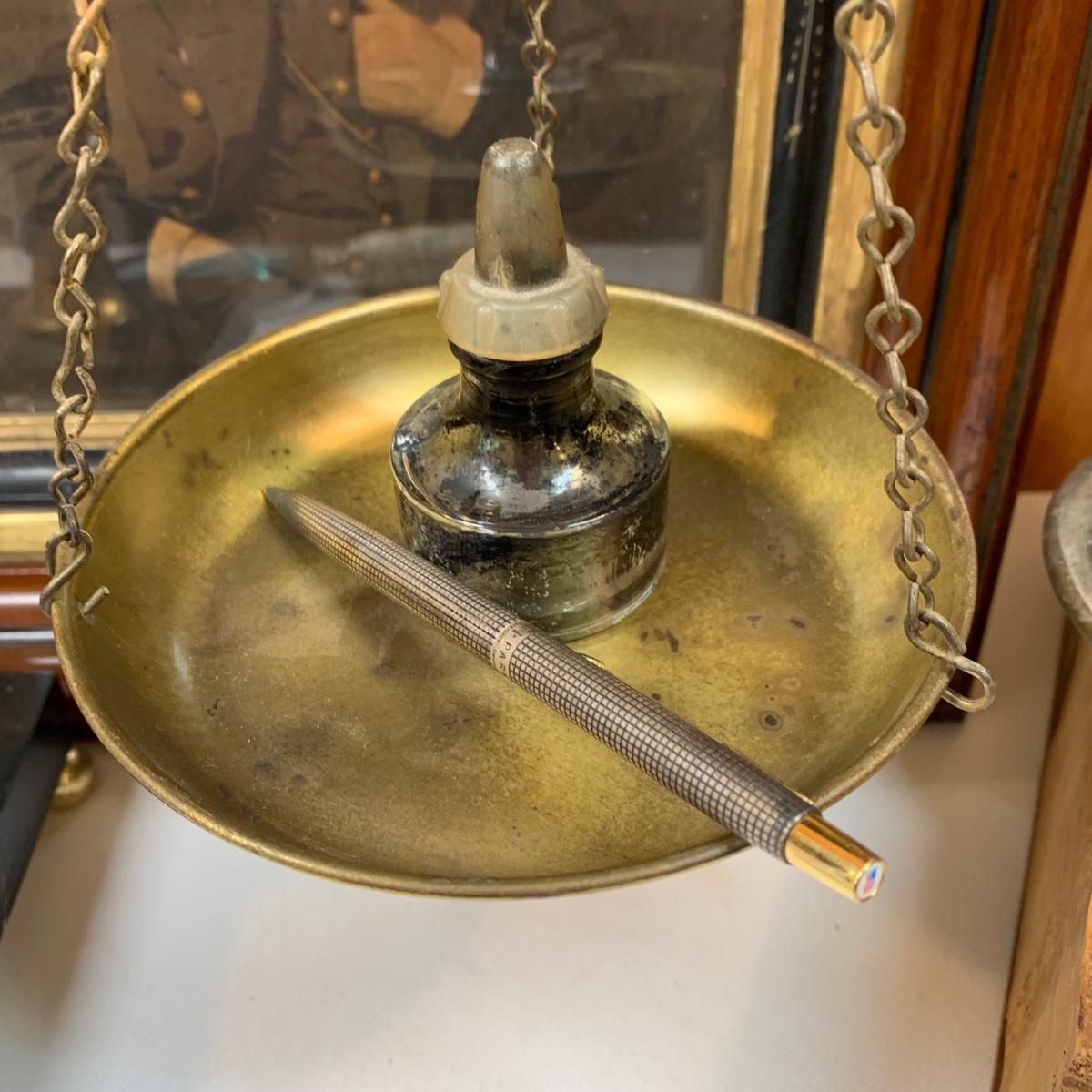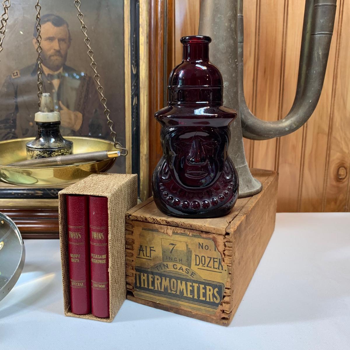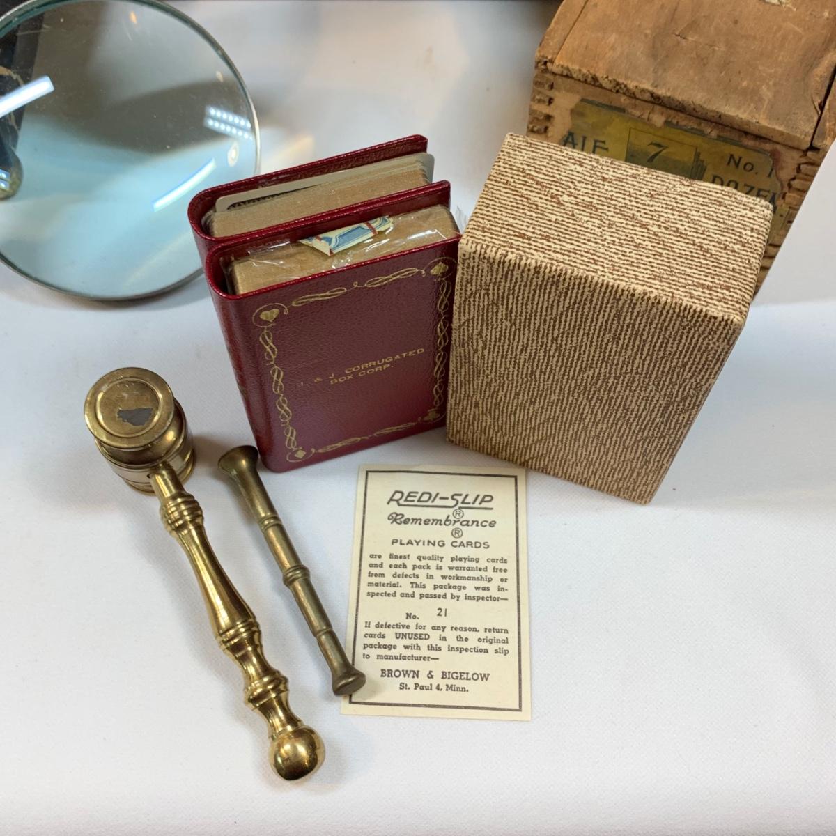 LOT 84: Vintage Military Bugle Horn, Balance Scale Decor w/Marble Base, Magnifying Glass w/Mother of Pearl Handle, Parker Mechanical Pencil, Wheaton Pocahantas Bottle & More