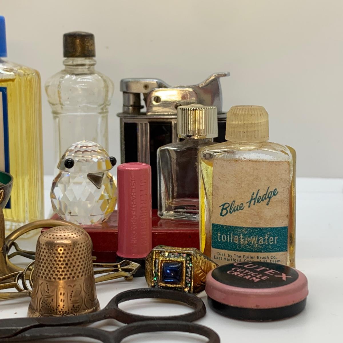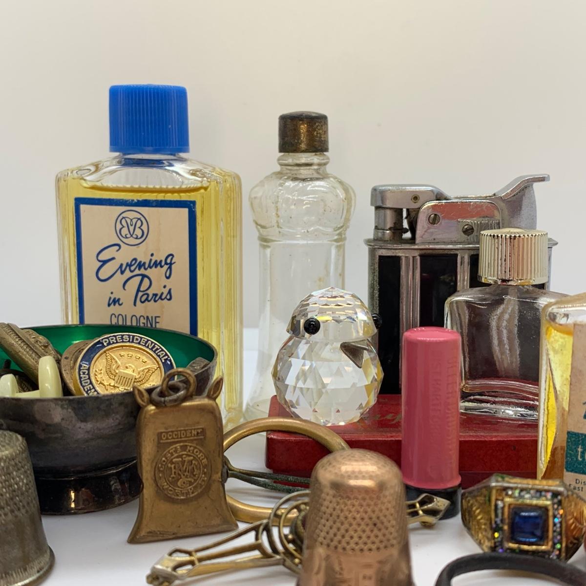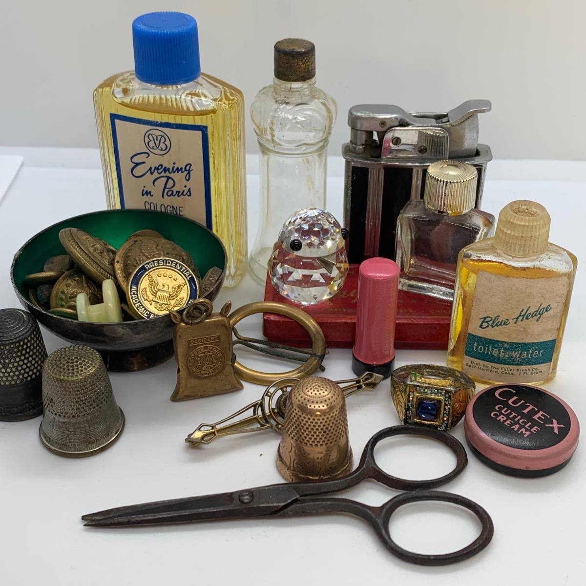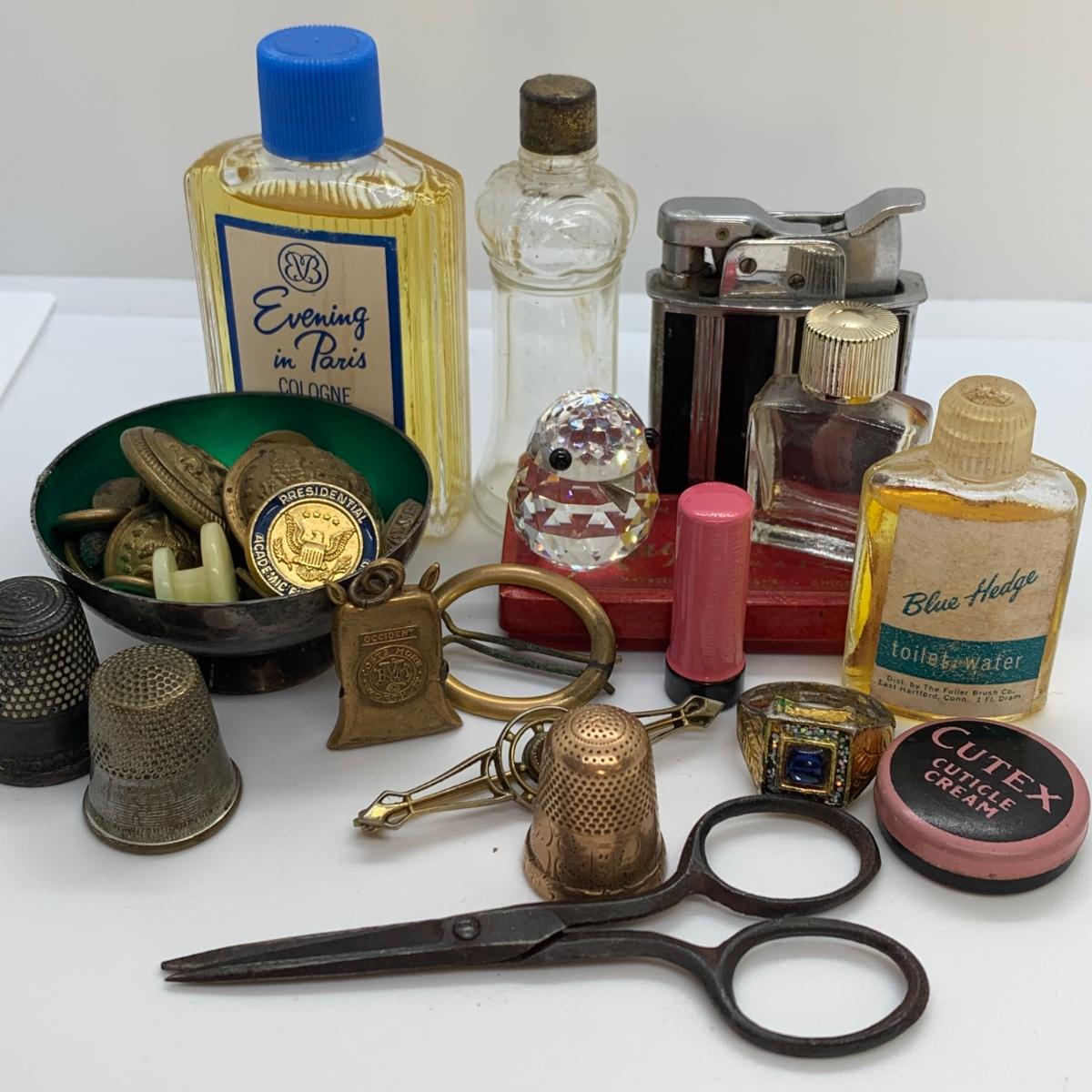 LOT 93: Vintage Miniature Collection: Perfume Bottles, Thimbles, Charm, Buttons, Crystal Bird, Lighter, Maybelline Mascara
