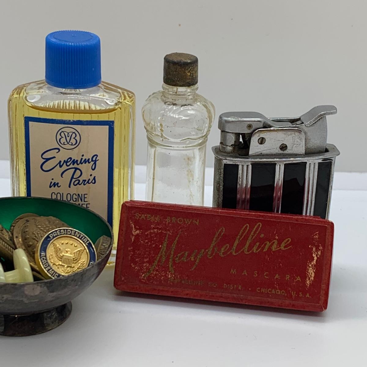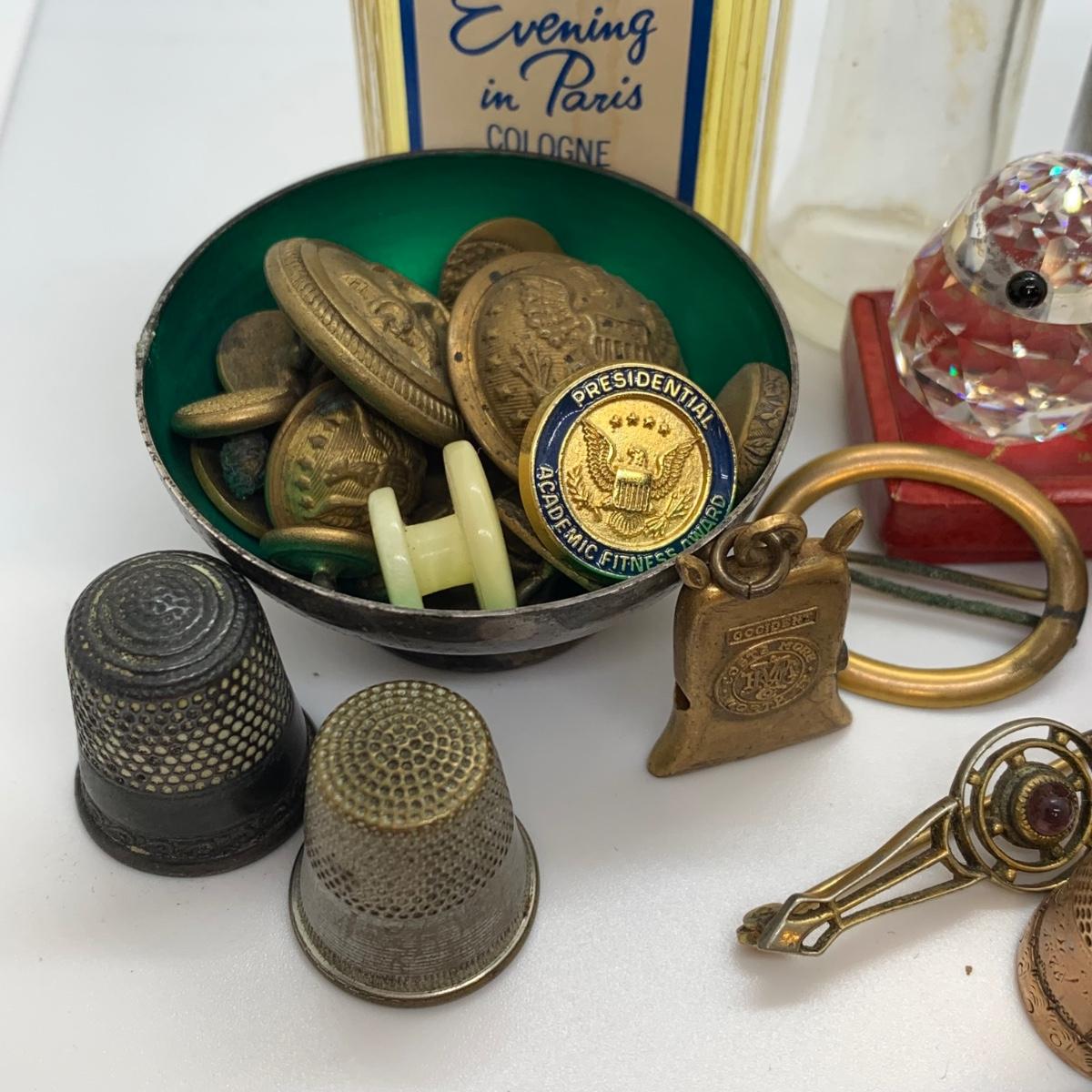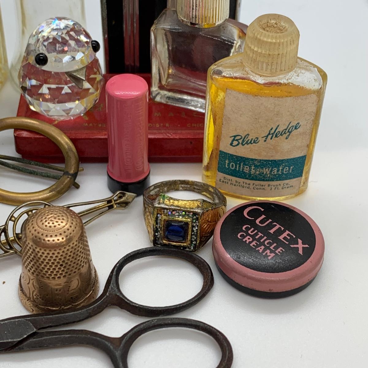LOT 93: Vintage Miniature Collection: Perfume Bottles, Thimbles, Charm, Buttons, Crystal Bird, Lighter, Maybelline Mascara