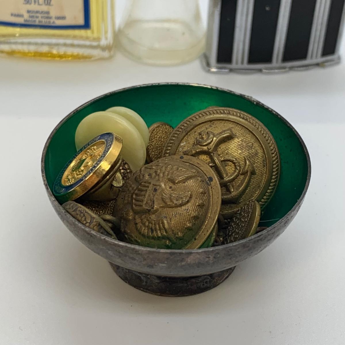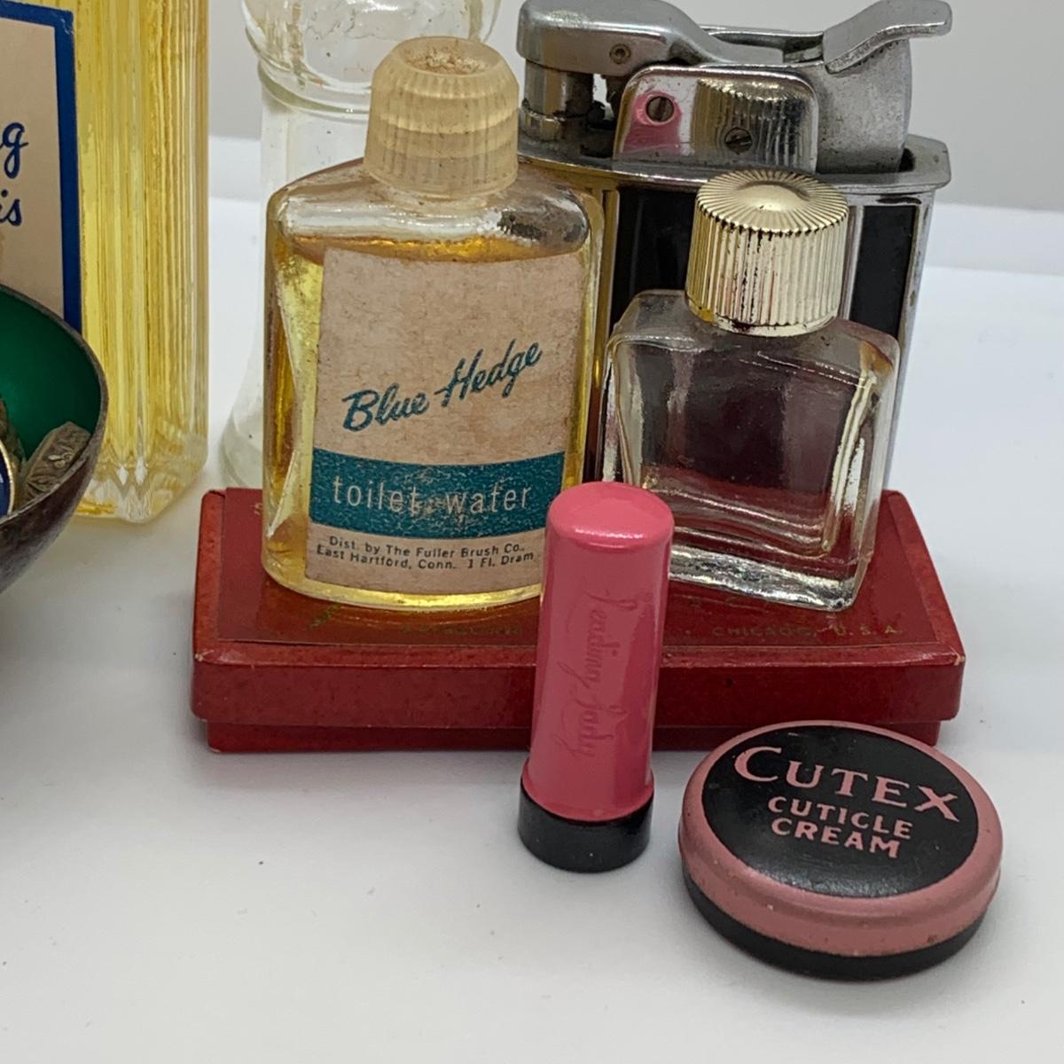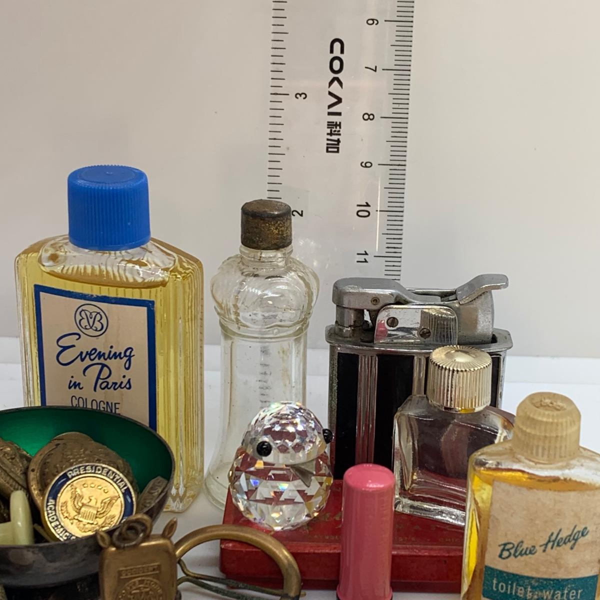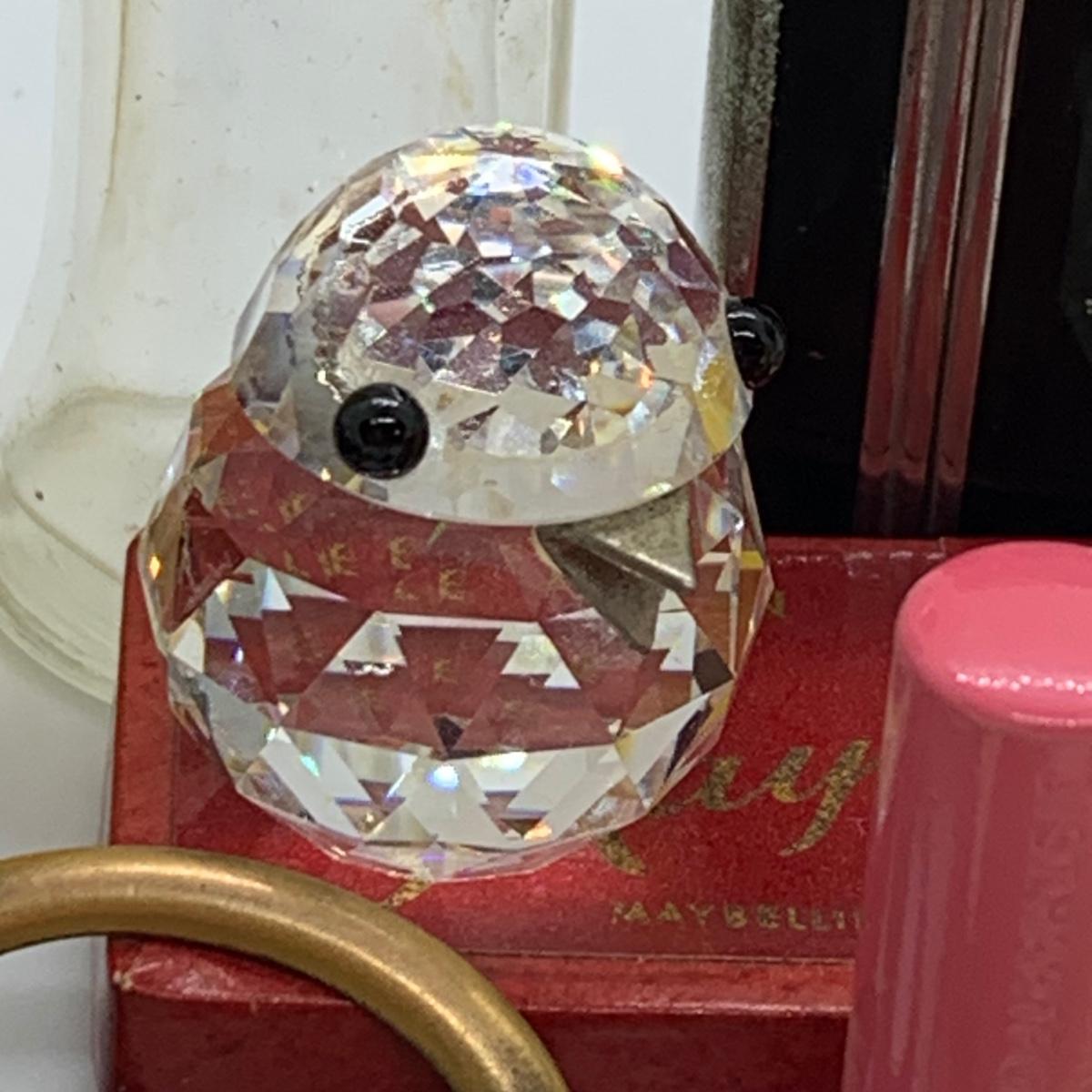 LOT 93: Vintage Miniature Collection: Perfume Bottles, Thimbles, Charm, Buttons, Crystal Bird, Lighter, Maybelline Mascara