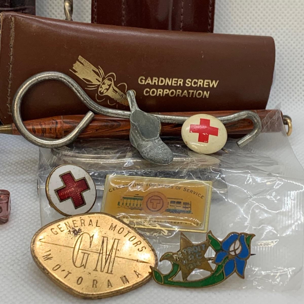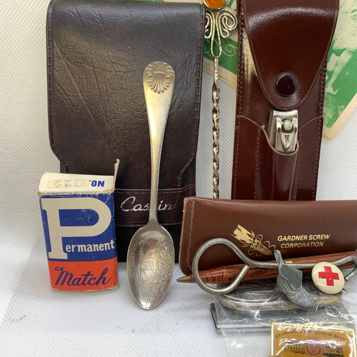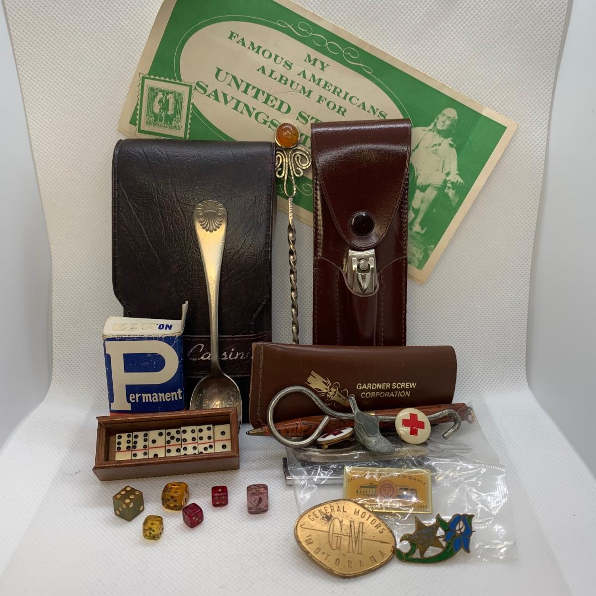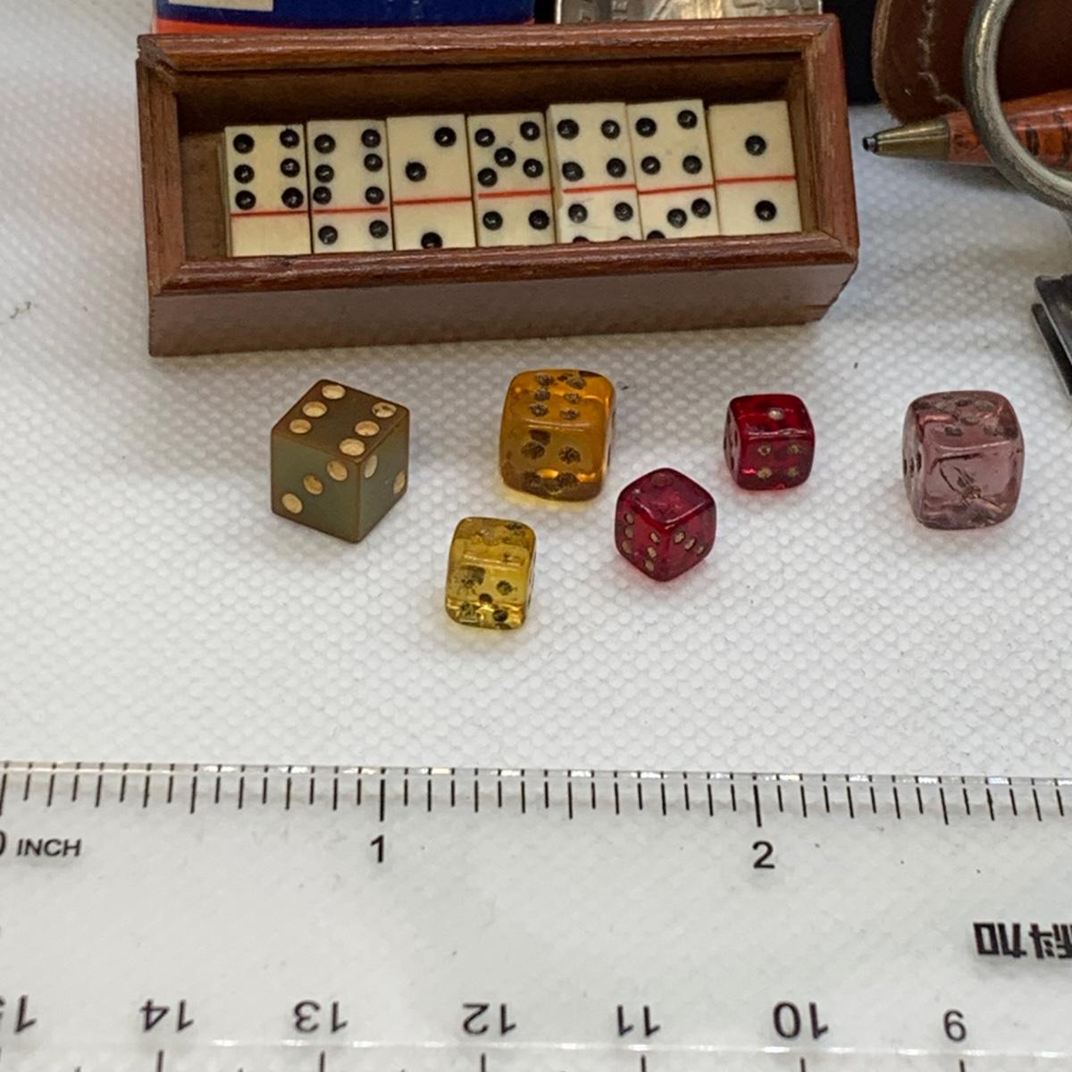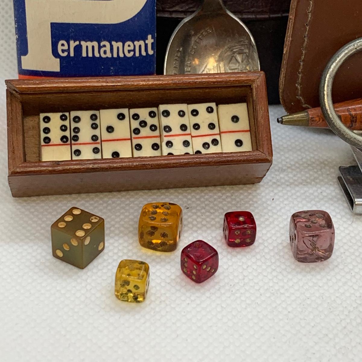 LOT 108: Vintage Miniature Dominos & Dice, Pins, Vintage Oleg Cassini 6 Piece Travel Manicure Set, Saving Stamps & More