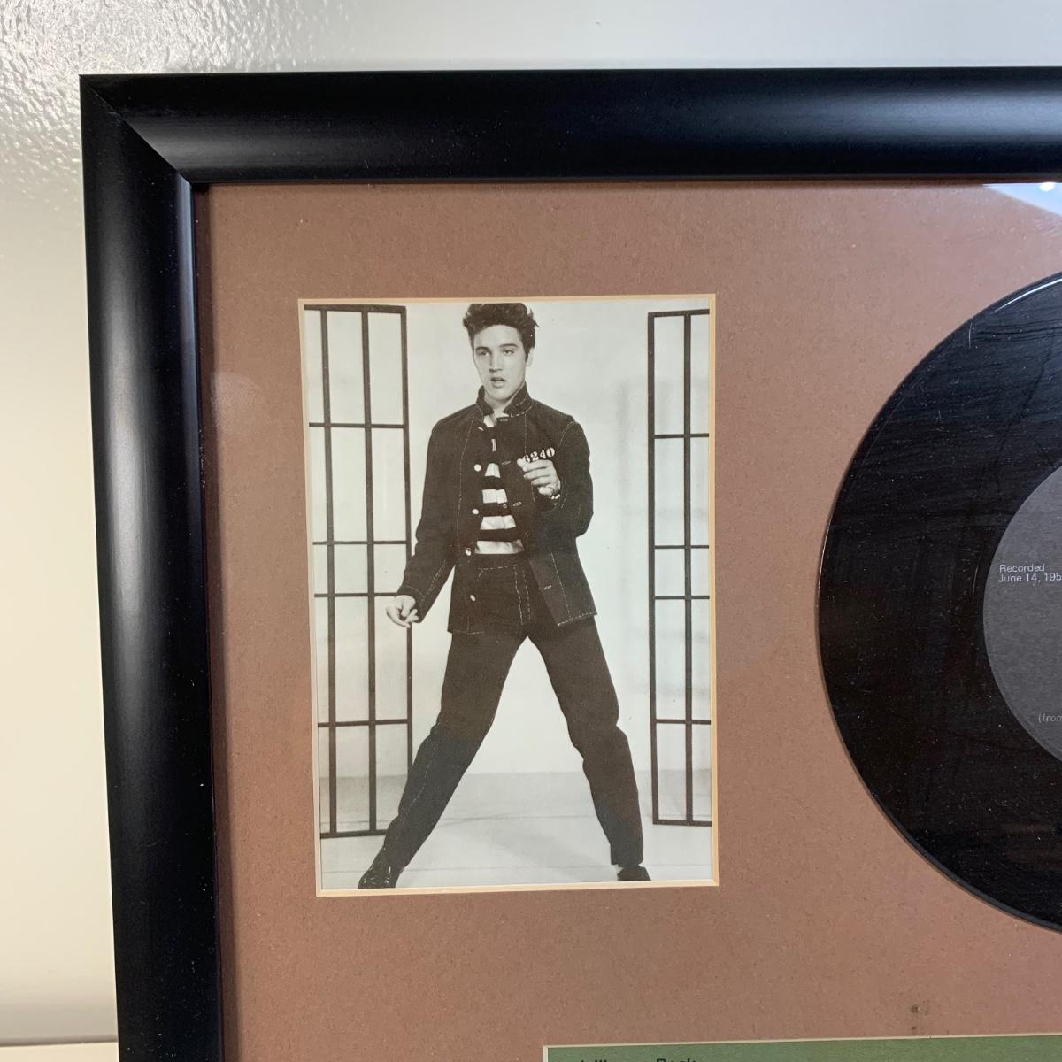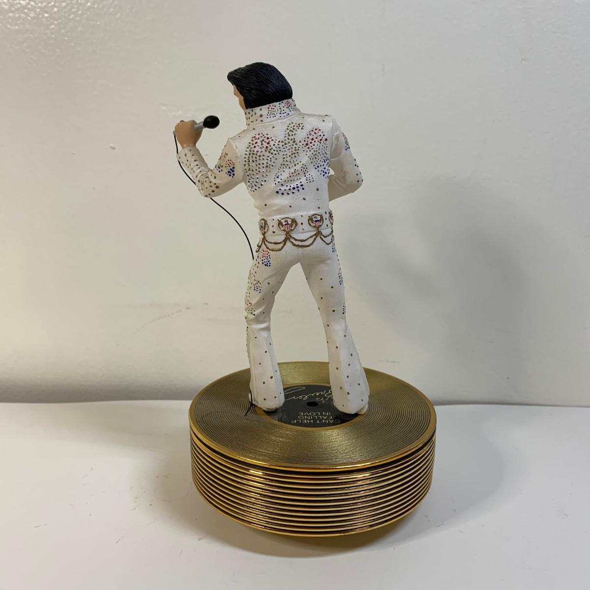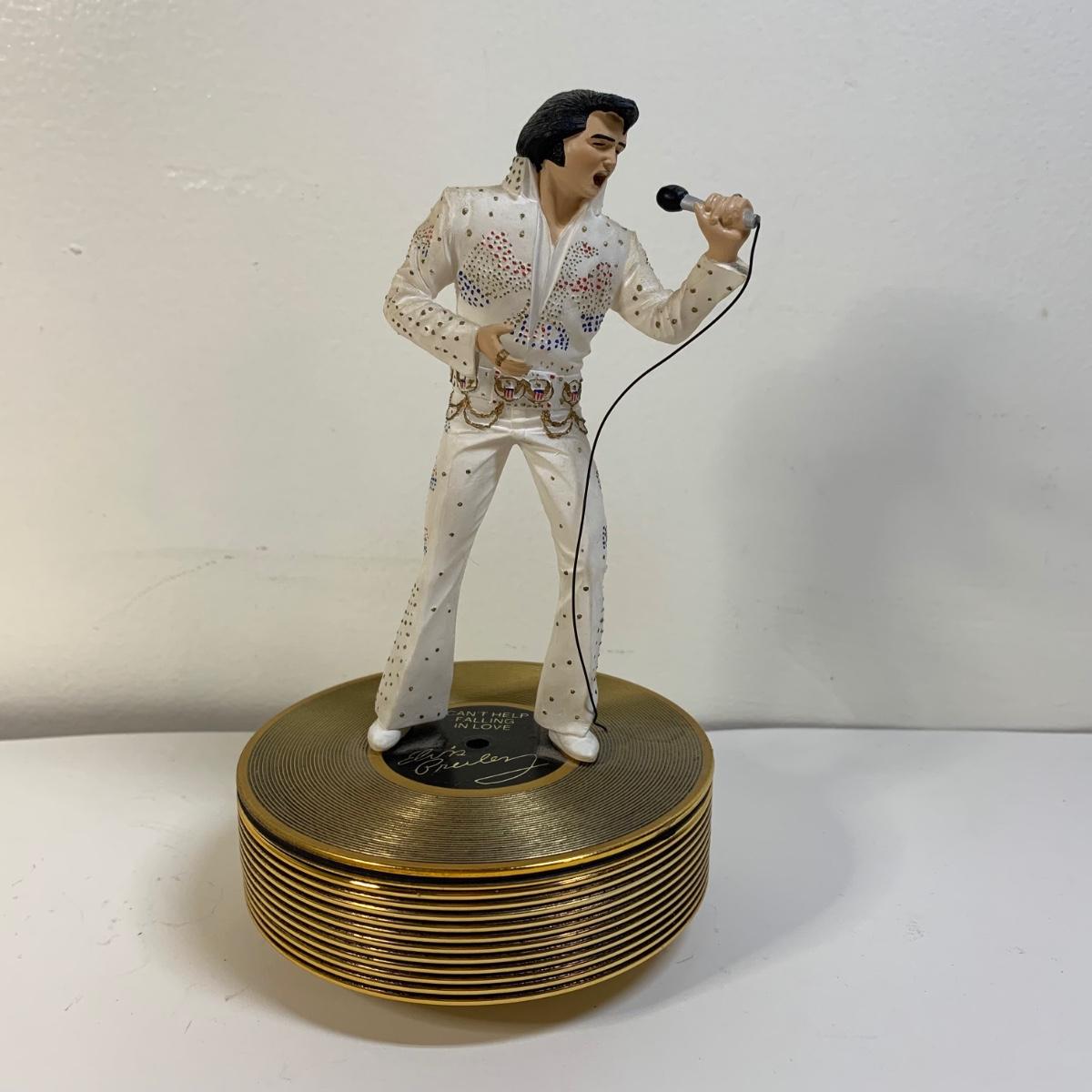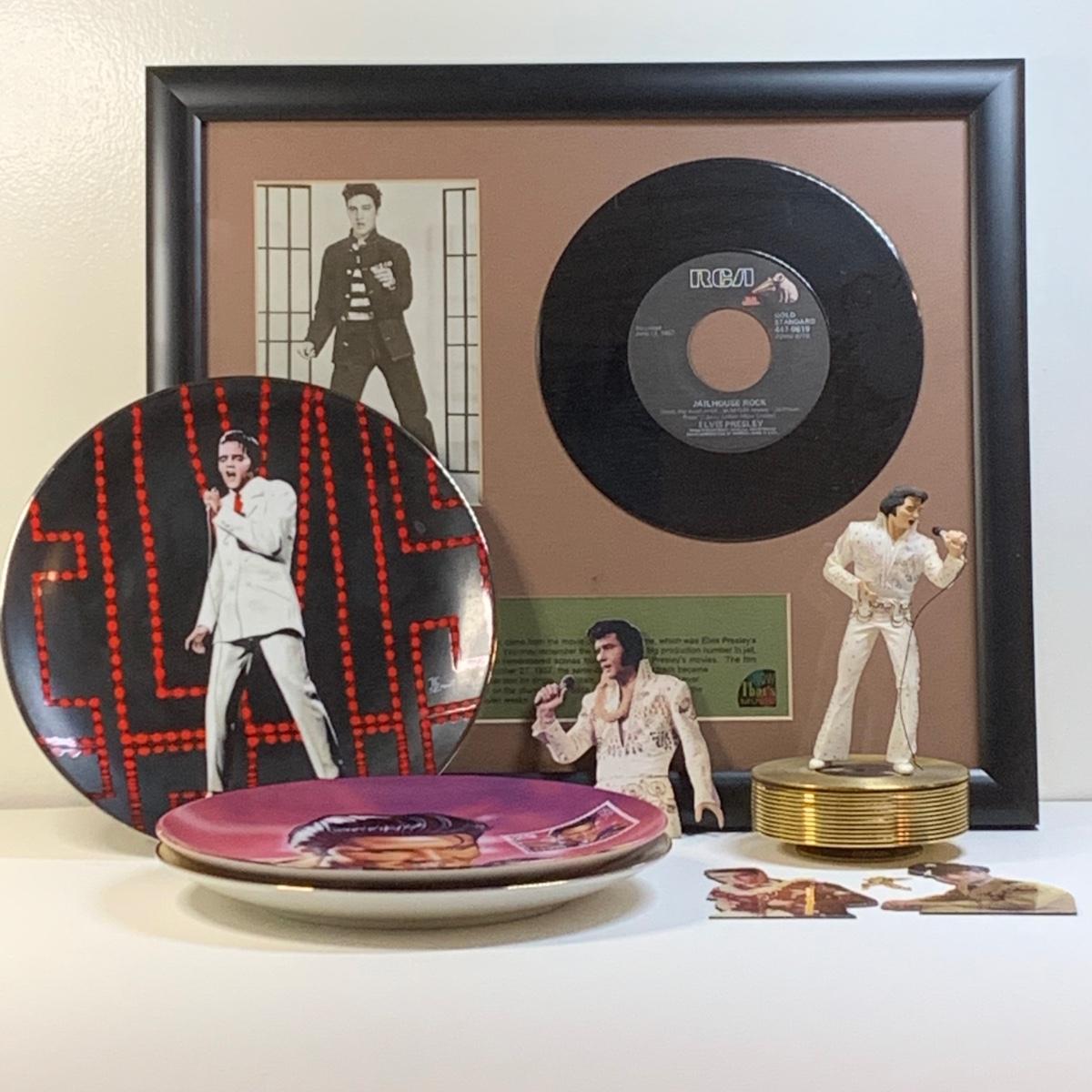 LOT 114: Elvis Collection: Framed Elvis 45 & Photo, Collectors Plates< Music Box & Goldtone Charm