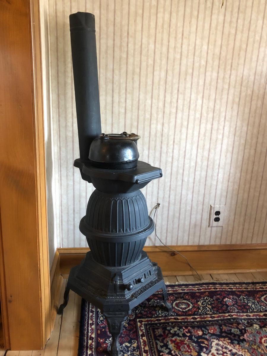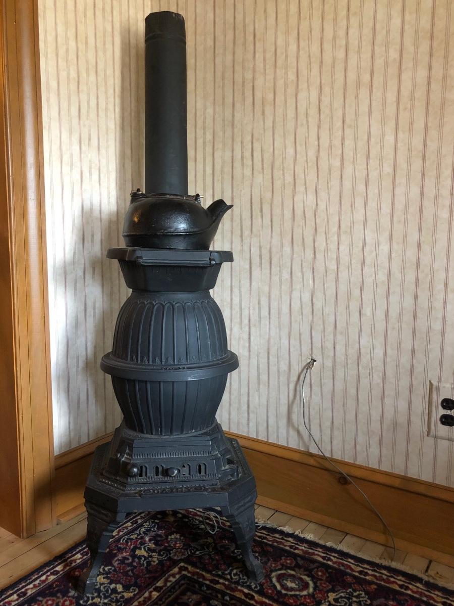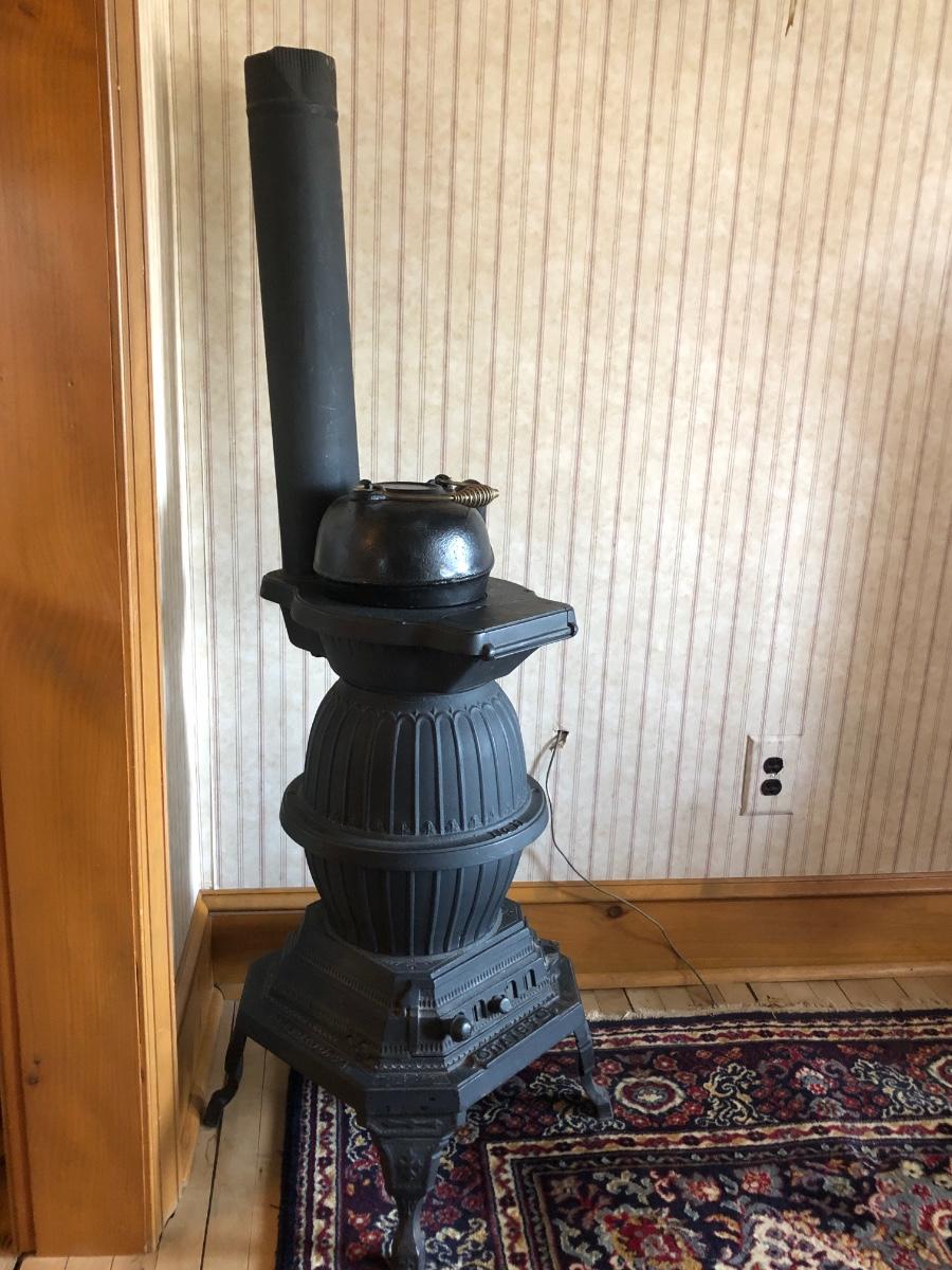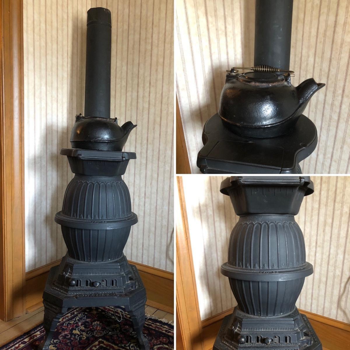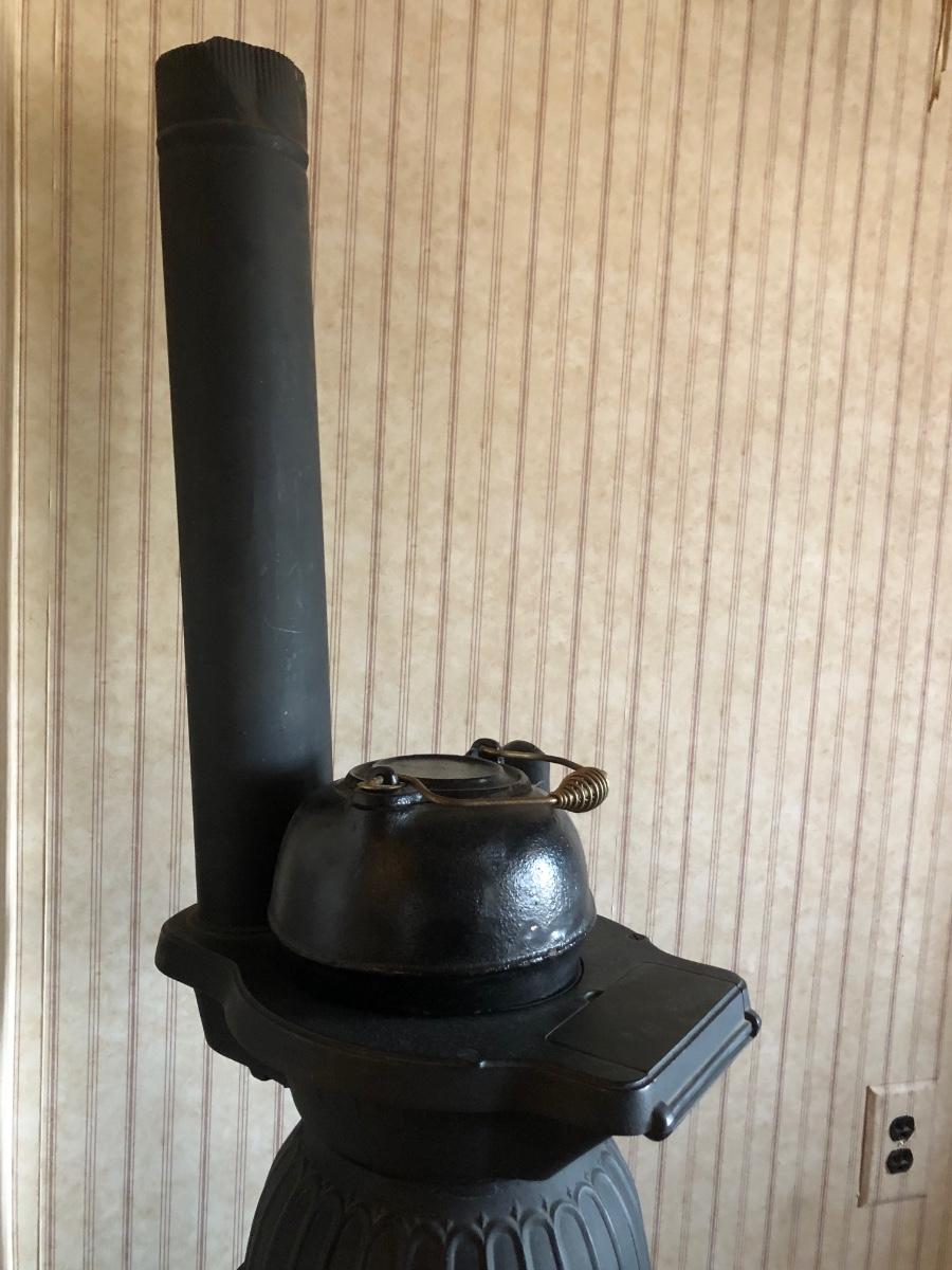 Potbelly stove made by Daisy. Includes heavy metal tea kettle. Measures 13W x 15D x 55H.