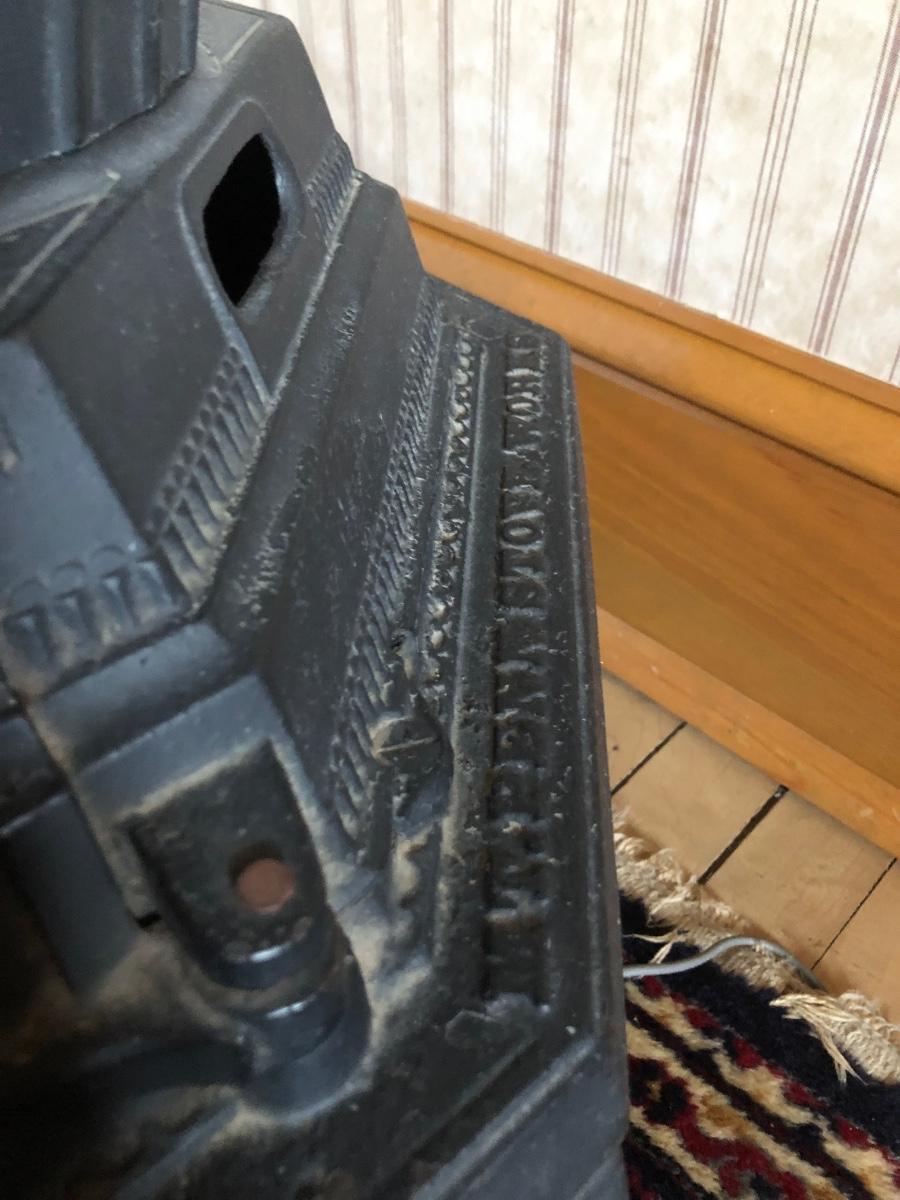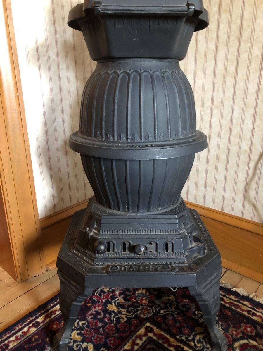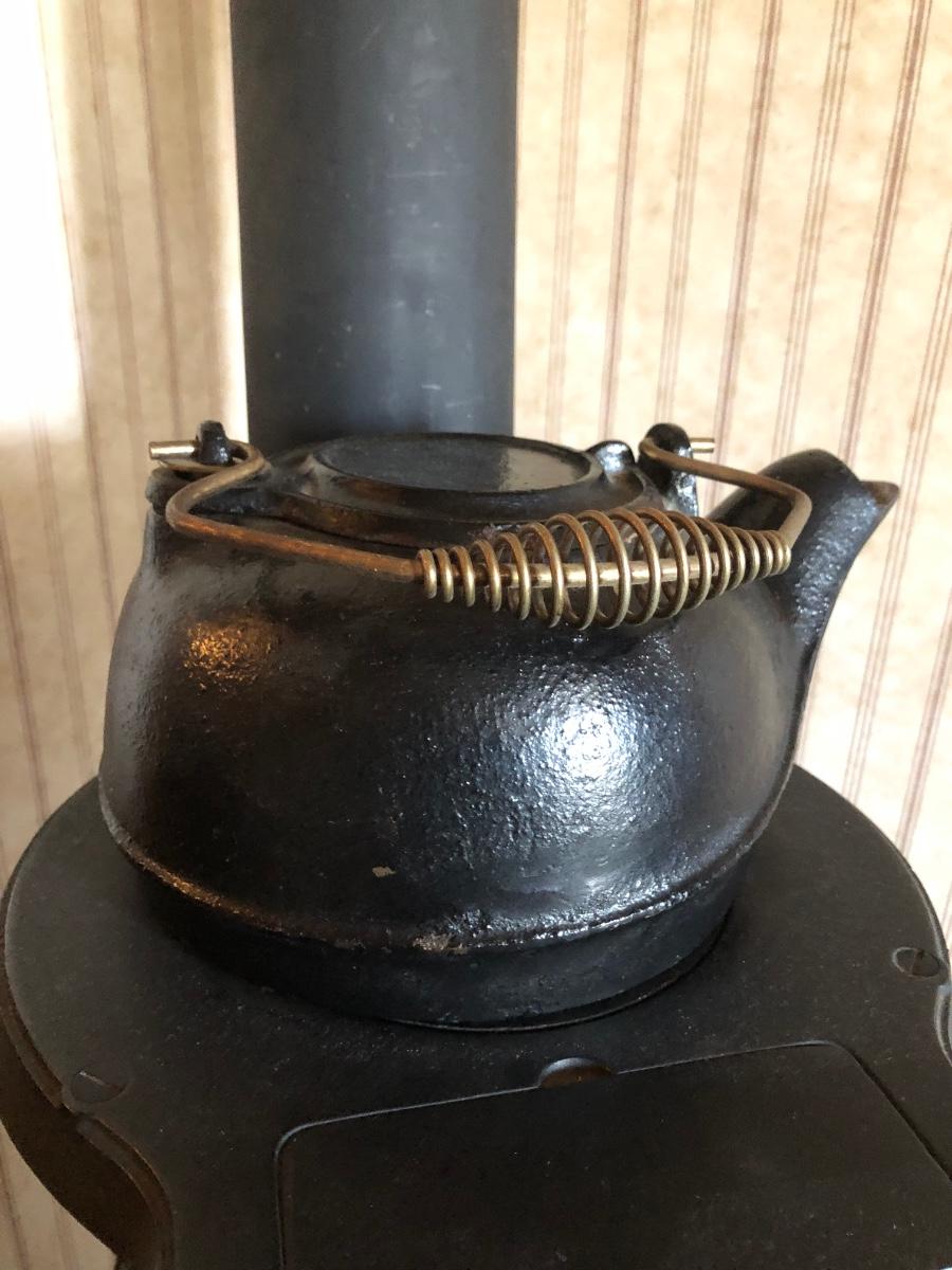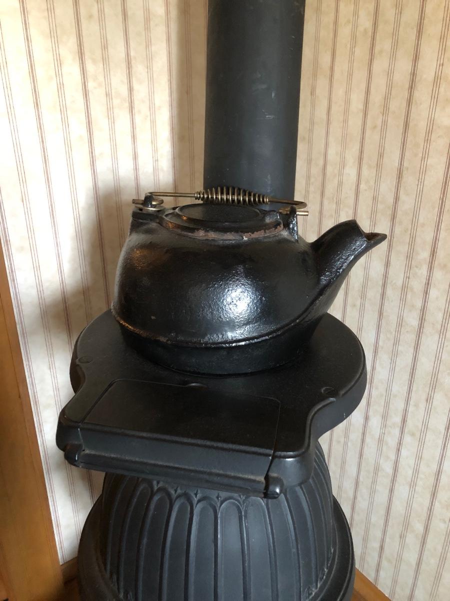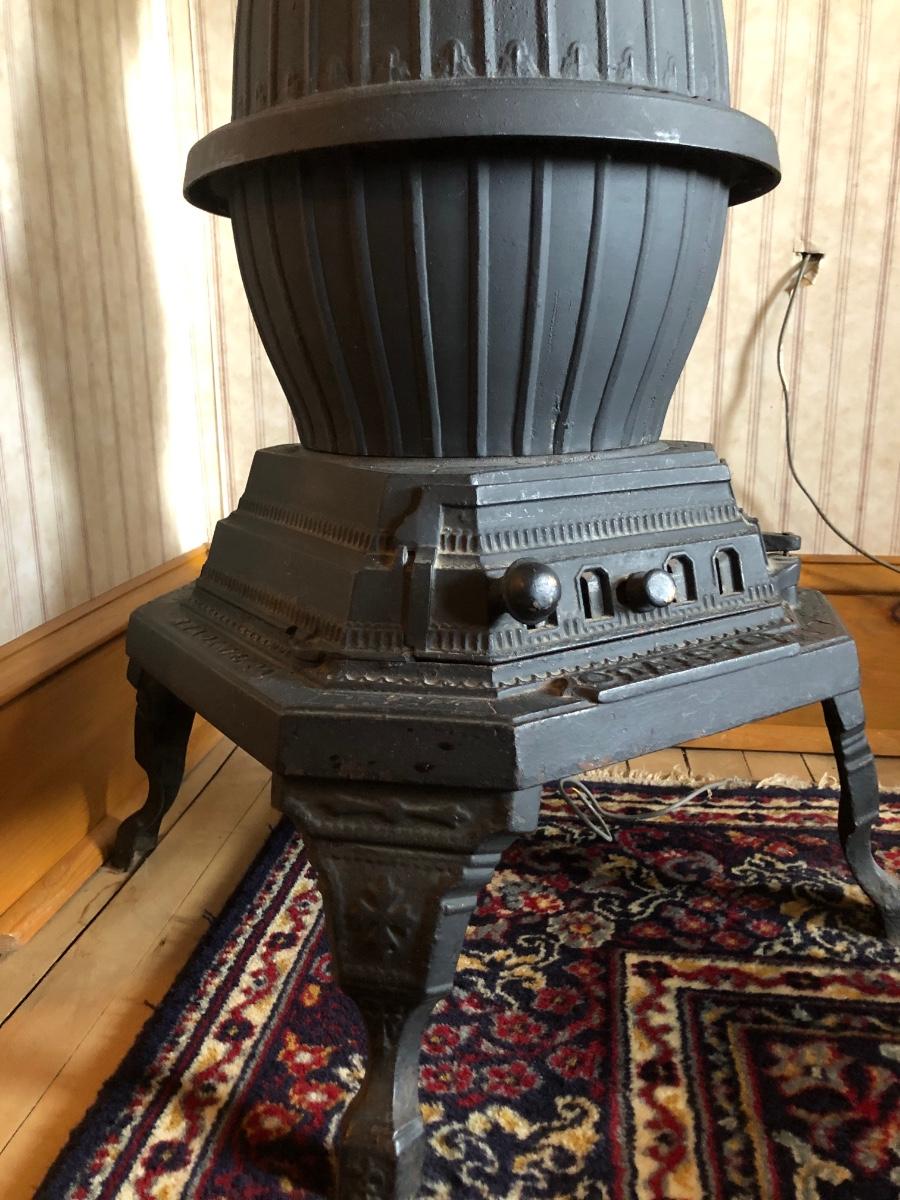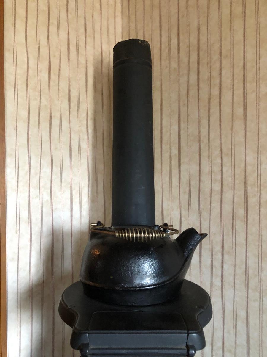 Potbelly stove made by Daisy. Includes heavy metal tea kettle. Measures 13W x 15D x 55H.