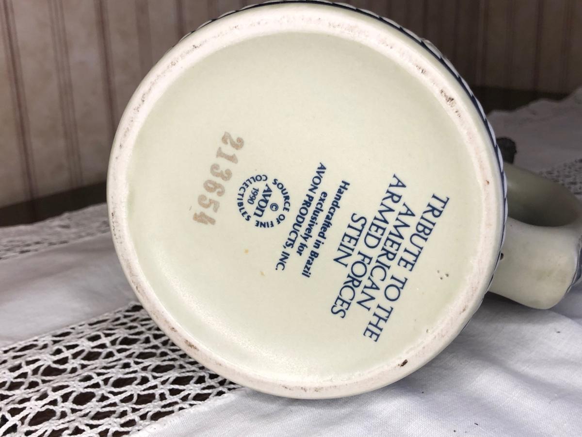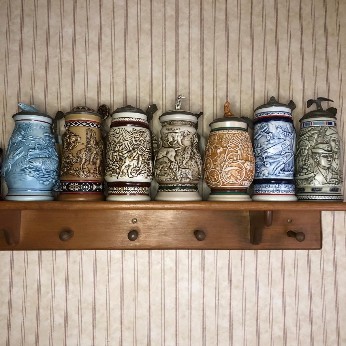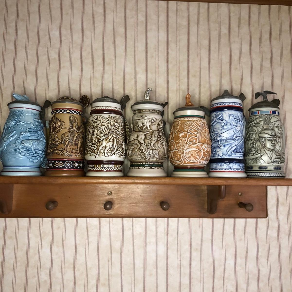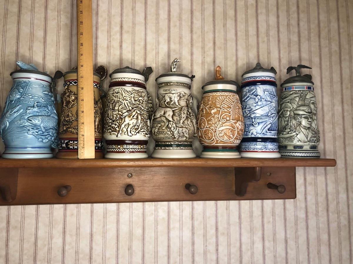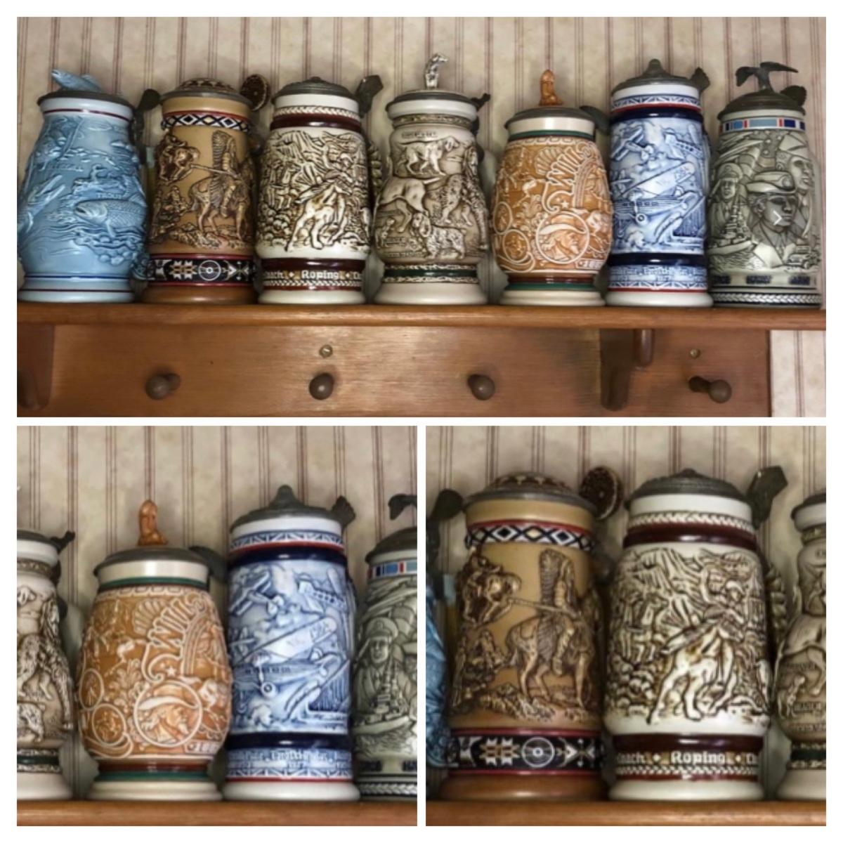 Includes seven steins made by Avon: 1990 Fishing Stein, 1988 "Indians of the American Frontier" Stein, 1980 'Cattle Drive' stein, 1991 Great Dogs of the Outdoors Stein, 1993 Tribute to the Wild West Stein, 1981 airplane stein, and 1990 Tribute to the American Armed Forces Stein.