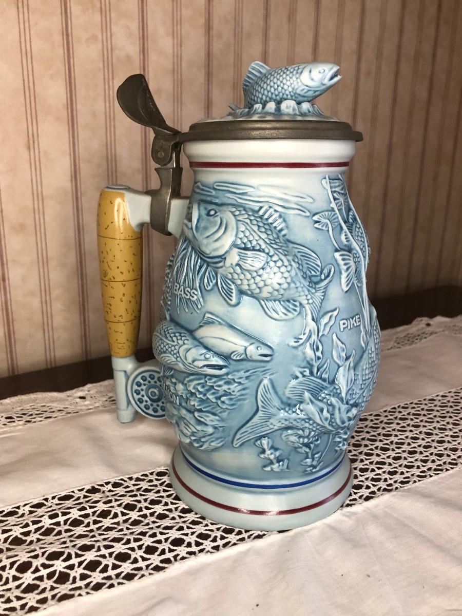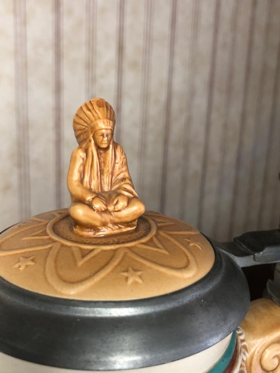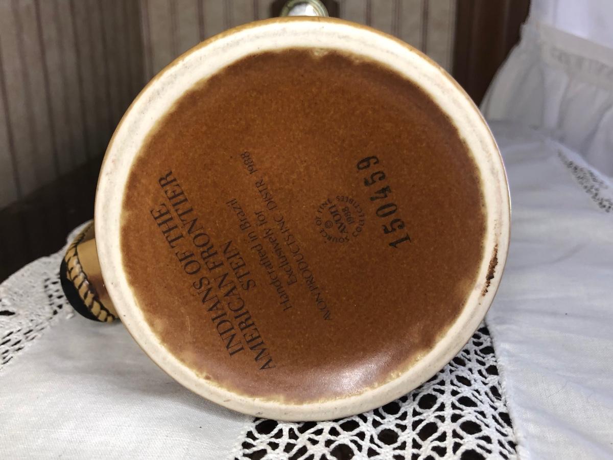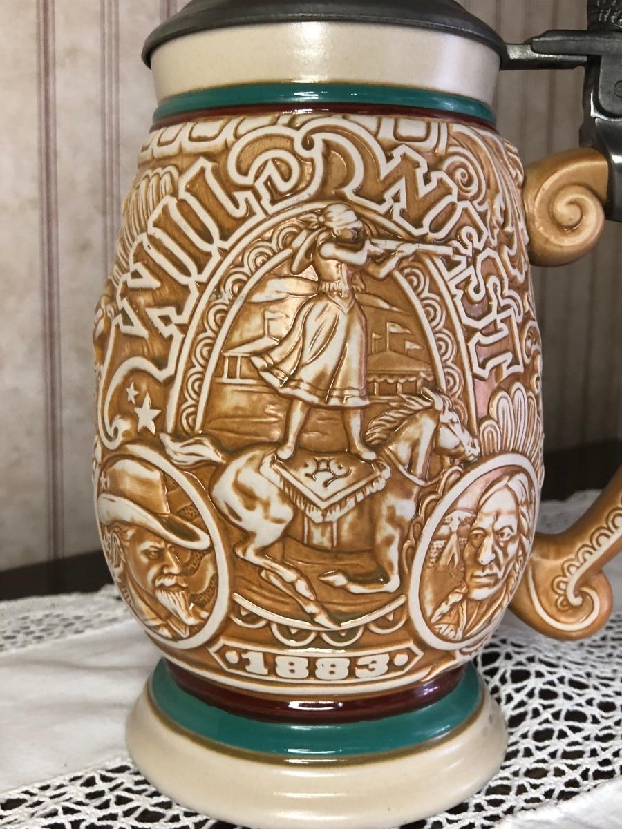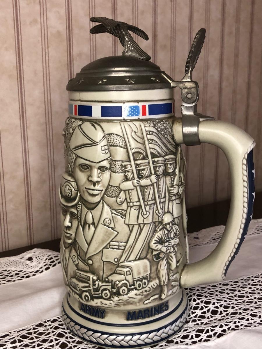 Includes seven steins made by Avon: 1990 Fishing Stein, 1988 "Indians of the American Frontier" Stein, 1980 'Cattle Drive' stein, 1991 Great Dogs of the Outdoors Stein, 1993 Tribute to the Wild West Stein, 1981 airplane stein, and 1990 Tribute to the American Armed Forces Stein.