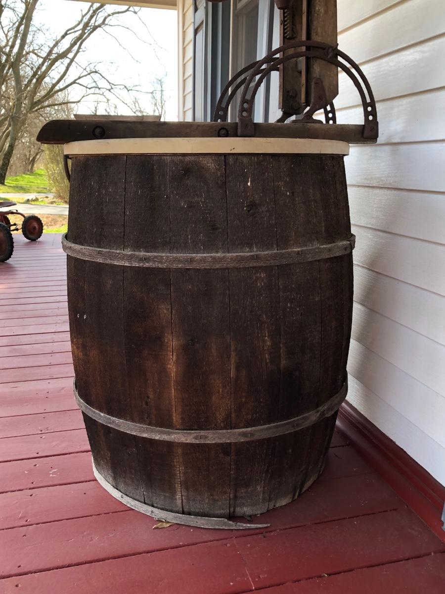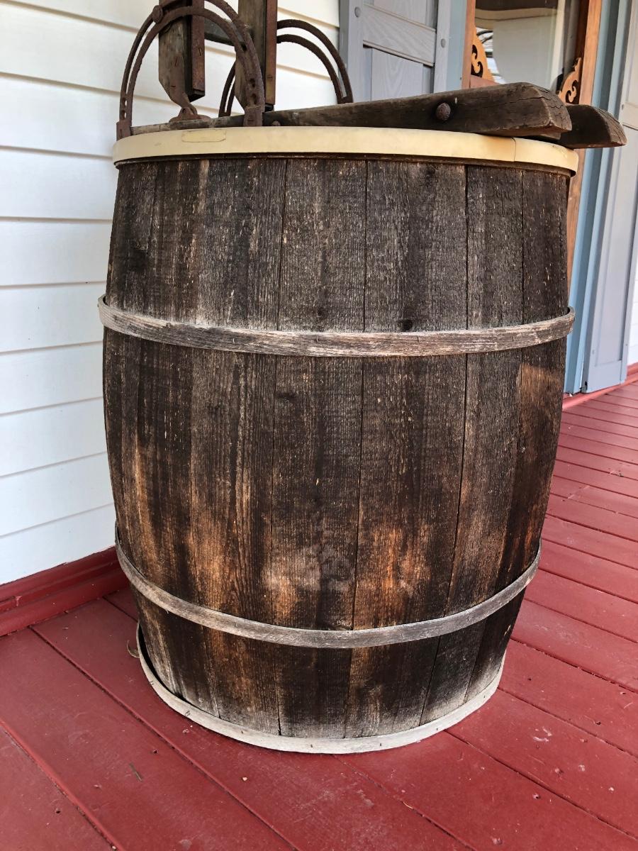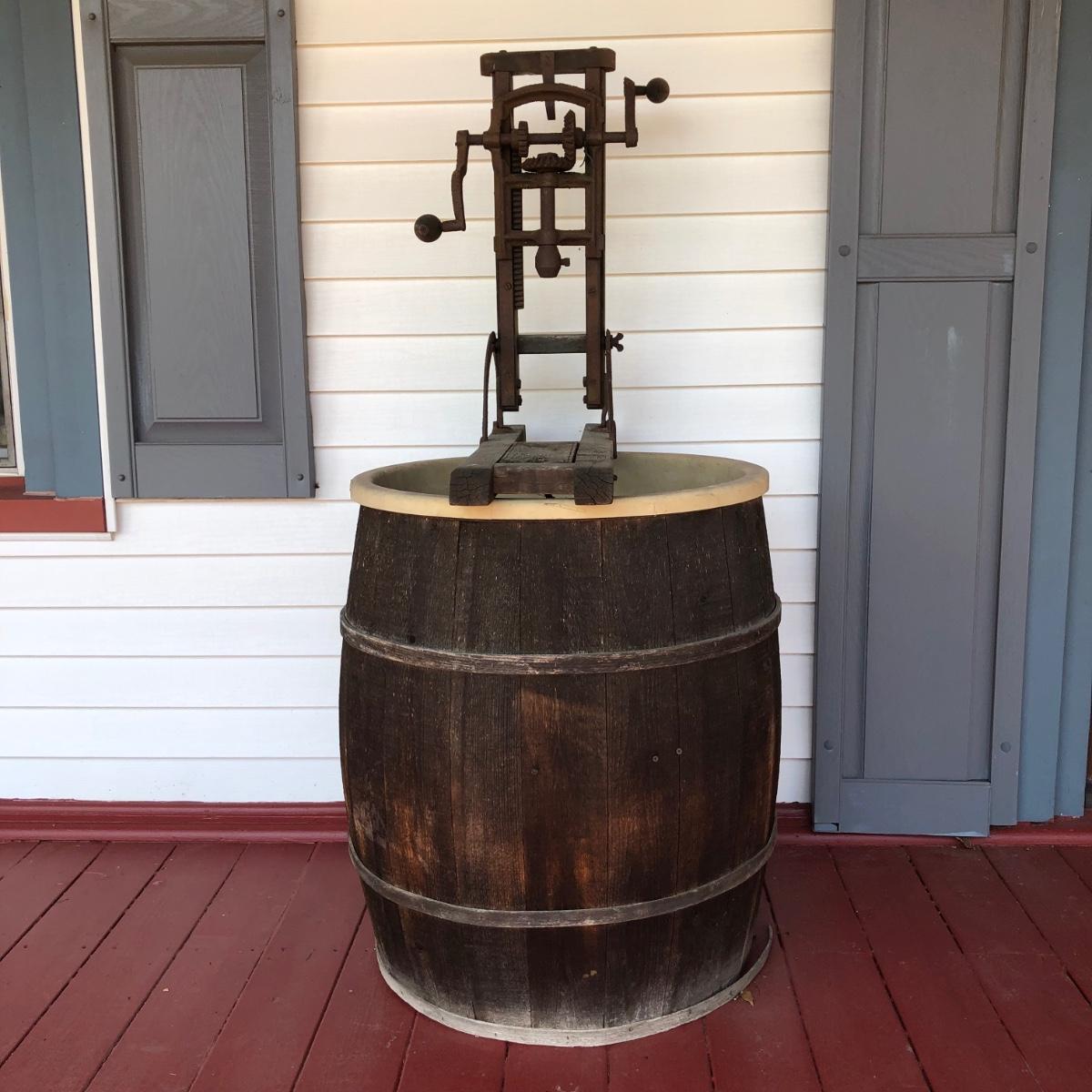 LOT 12M: Wooden Barrel Planter w/ Vintage Tool