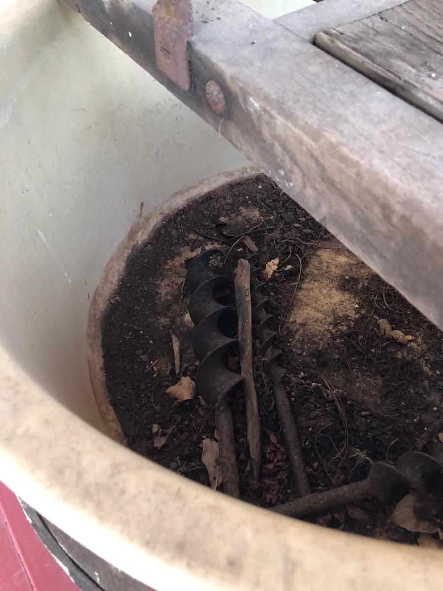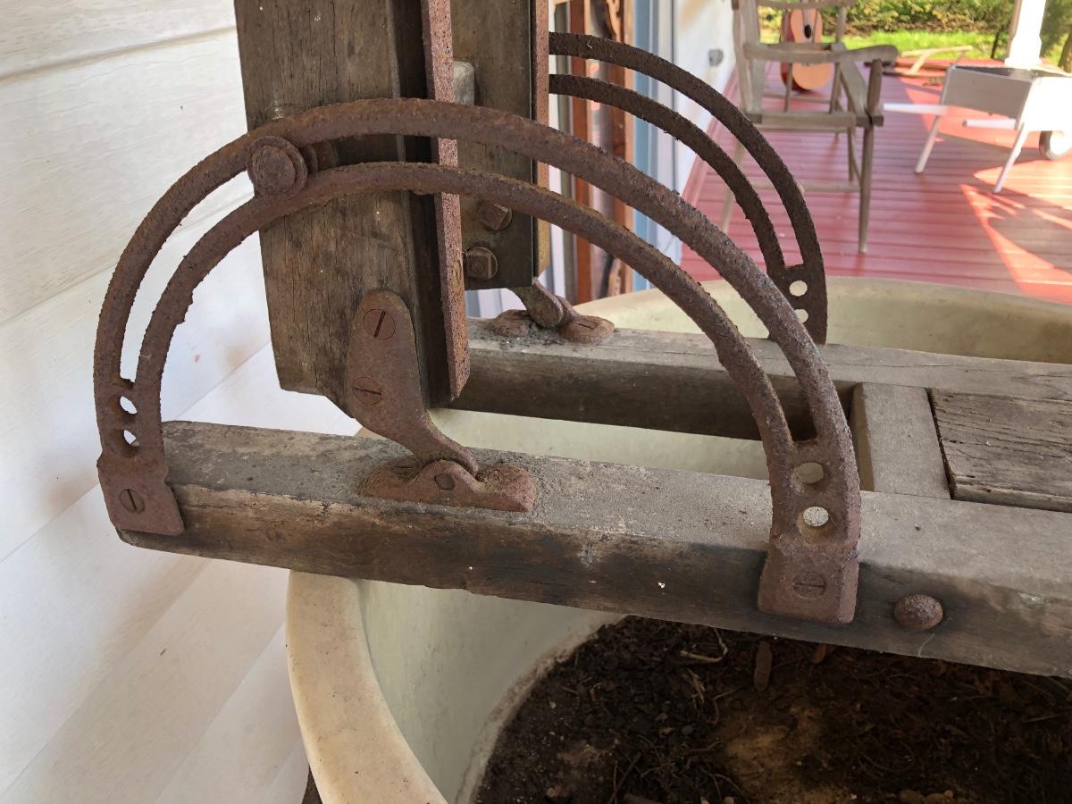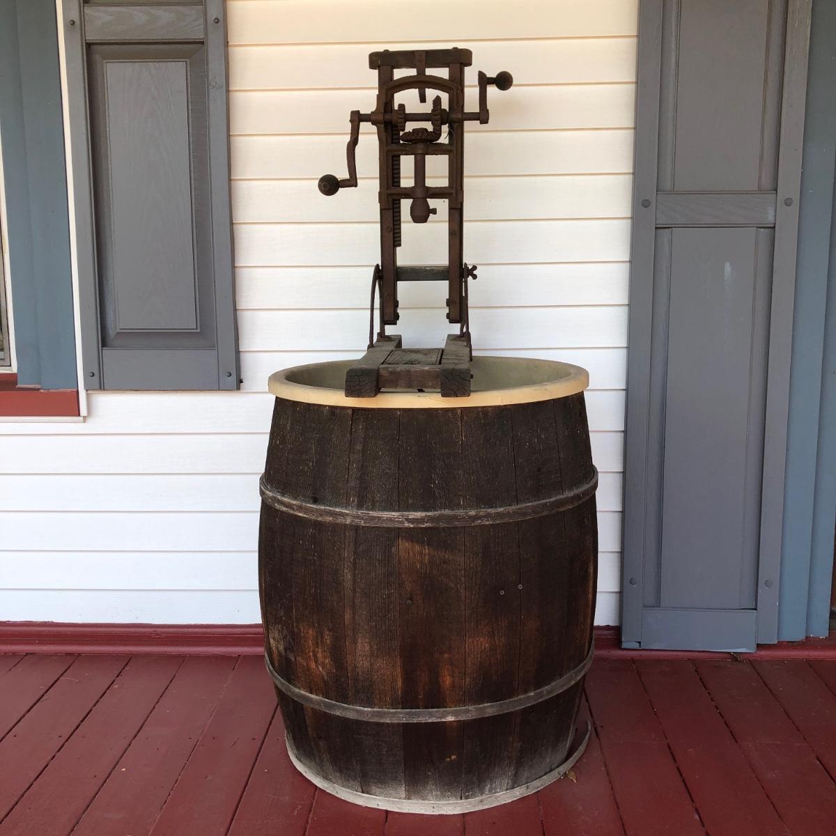 LOT 12M: Wooden Barrel Planter w/ Vintage Tool