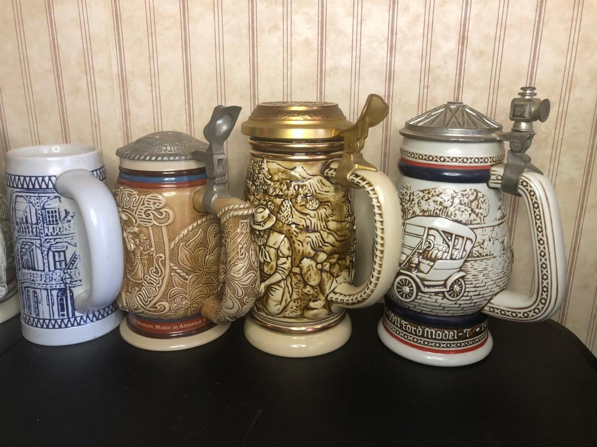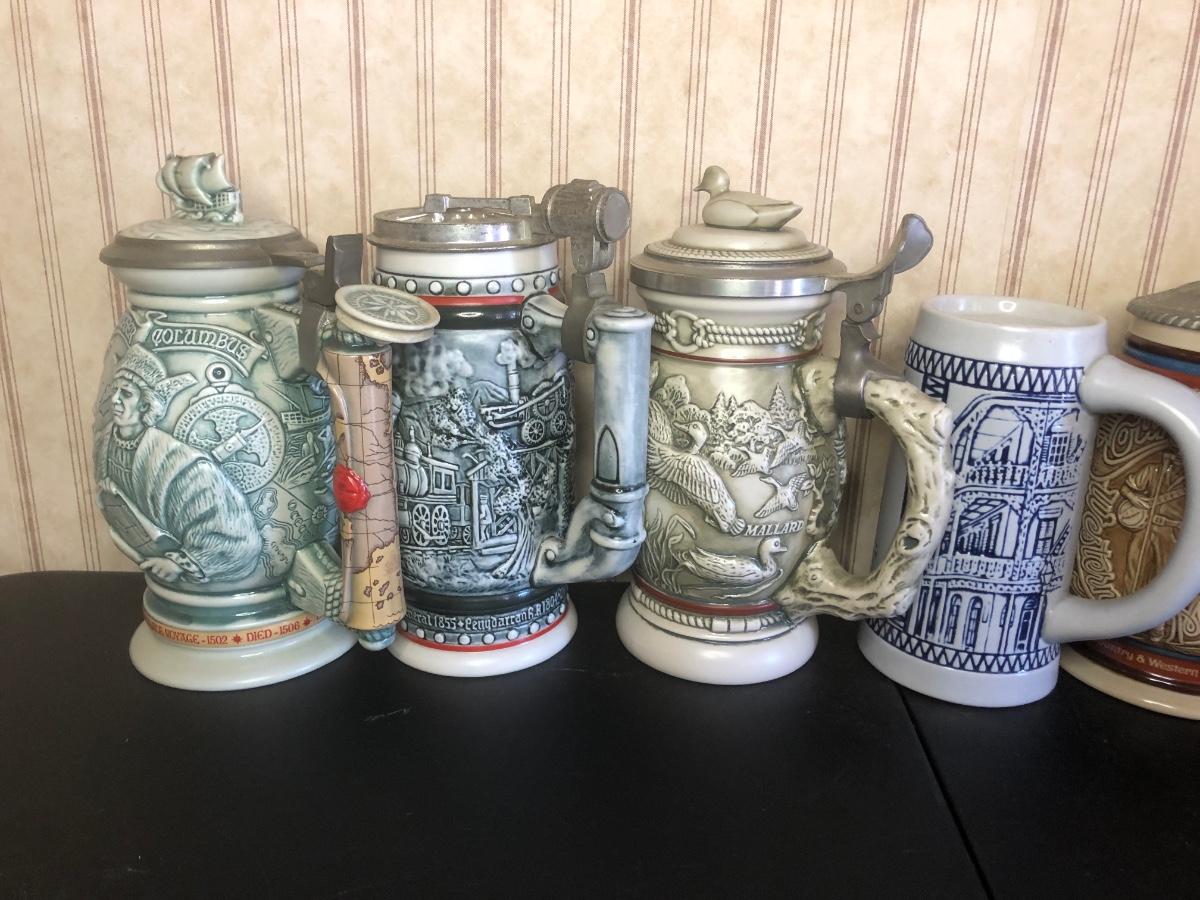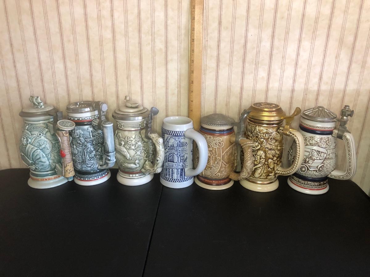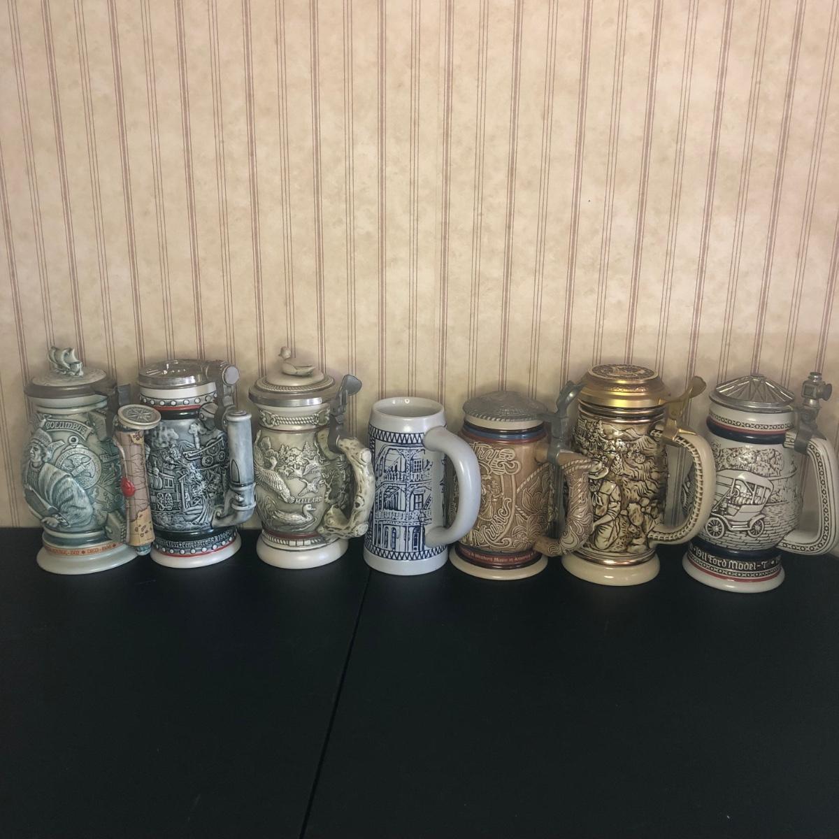 Includes seven steins: Christopher Columbus New World Stein (Avon 1992), Ducks of the American Wilderness Stein (Avon 1988), New Orleans Stein (possibly Avon), Train Stein (Avon 1982), Ford Stein (Avon 1979), Country & Western Music Stein (Avon 1994).