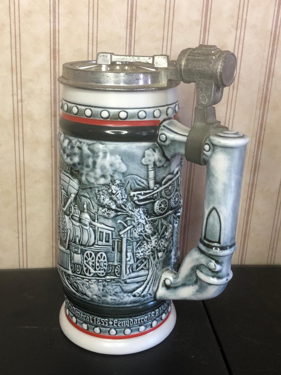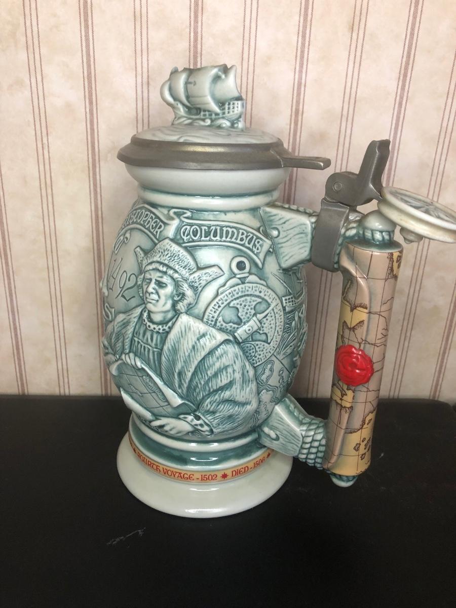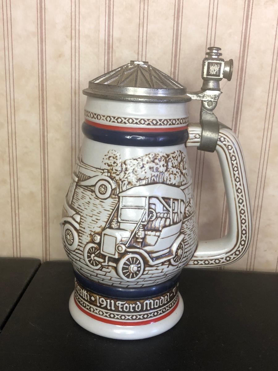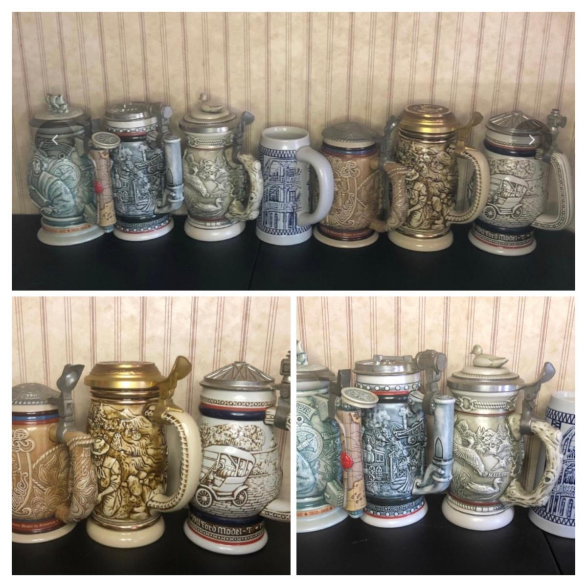 Includes seven steins: Christopher Columbus New World Stein (Avon 1992), Ducks of the American Wilderness Stein (Avon 1988), New Orleans Stein (possibly Avon), Train Stein (Avon 1982), Ford Stein (Avon 1979), Country & Western Music Stein (Avon 1994).