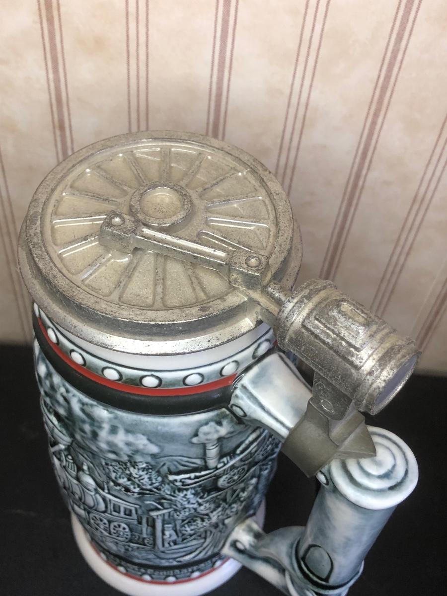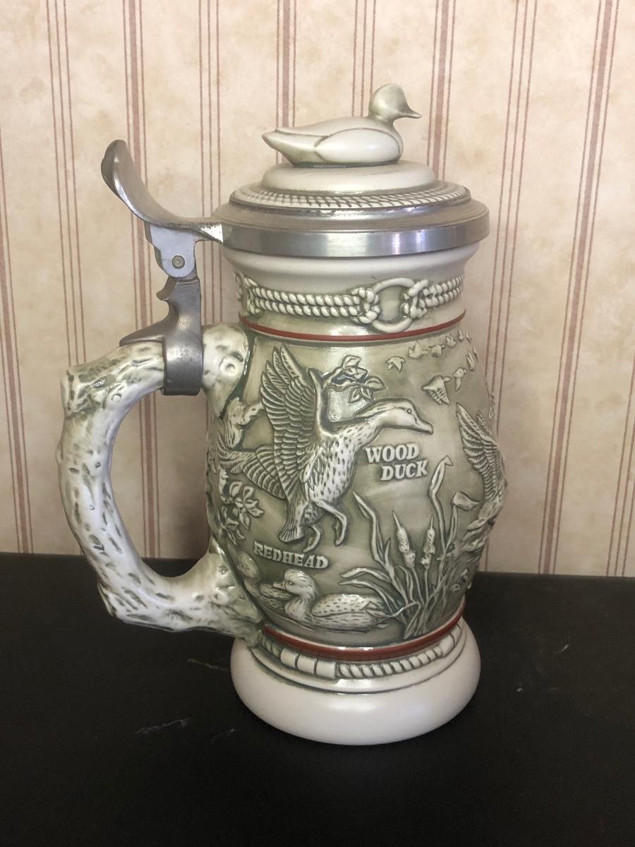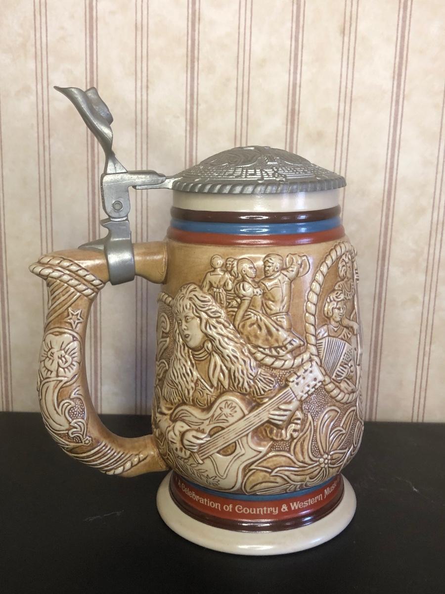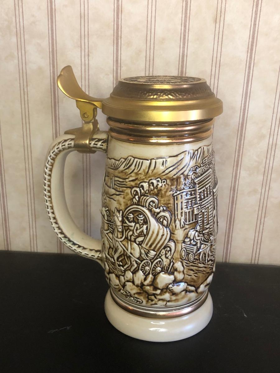Includes seven steins: Christopher Columbus New World Stein (Avon 1992), Ducks of the American Wilderness Stein (Avon 1988), New Orleans Stein (possibly Avon), Train Stein (Avon 1982), Ford Stein (Avon 1979), Country & Western Music Stein (Avon 1994).