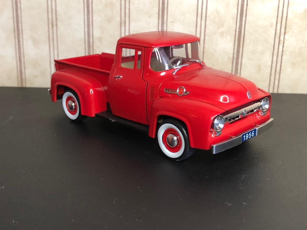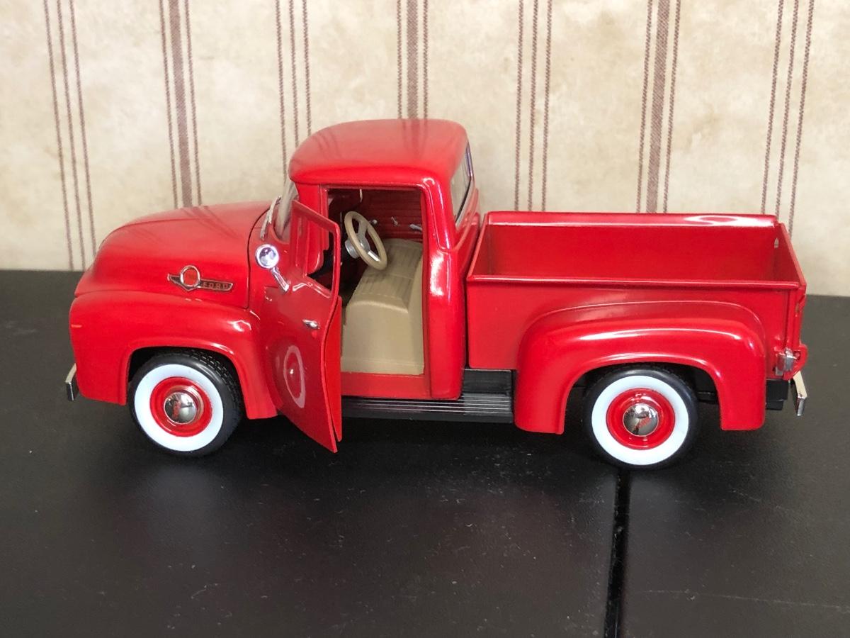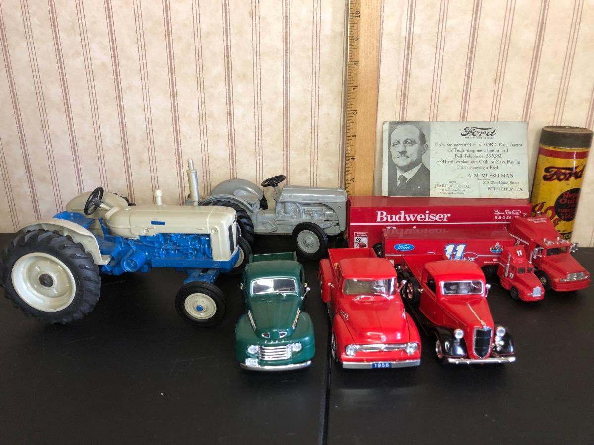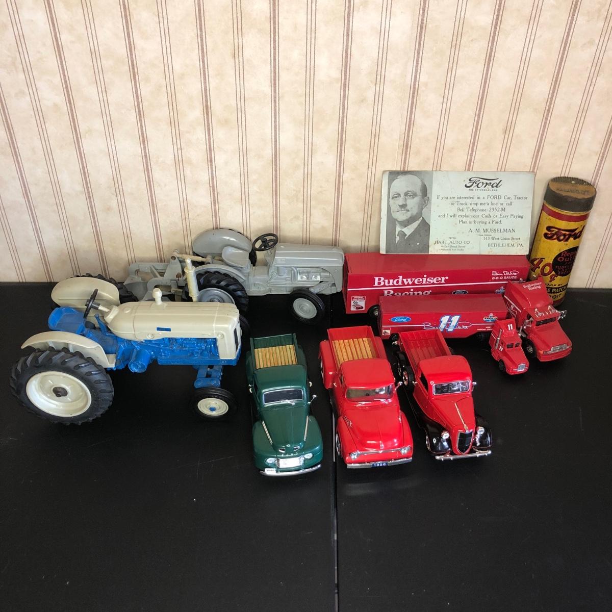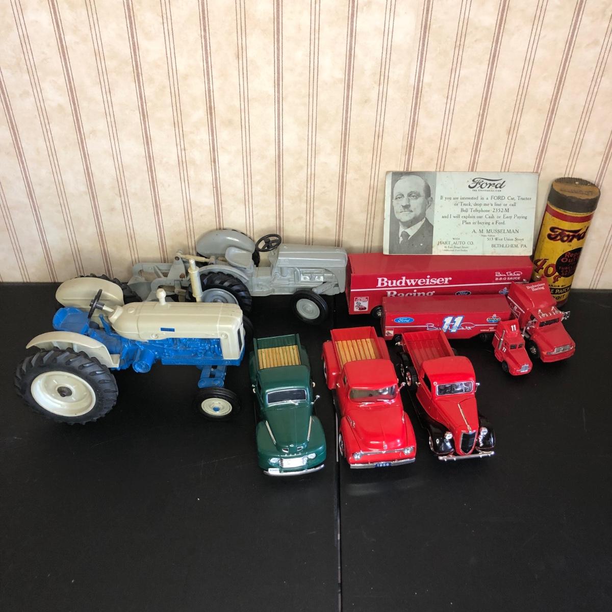 Includes a blue and white Ford 5000 model tractor, a 50th Anniversary Ford model tractor, three different Ford Pickup models (1948 F-1, 1956 F100, & 1936 Ford Pickup w/ COA), a Bill Elliot 1988 NASCAR Champion Ford model semi-truck, a Budweiser Racing Winston Cup Series Ford semi-truck made by Racing Champions, and a vintage can of Ford Repair Out-Fit.