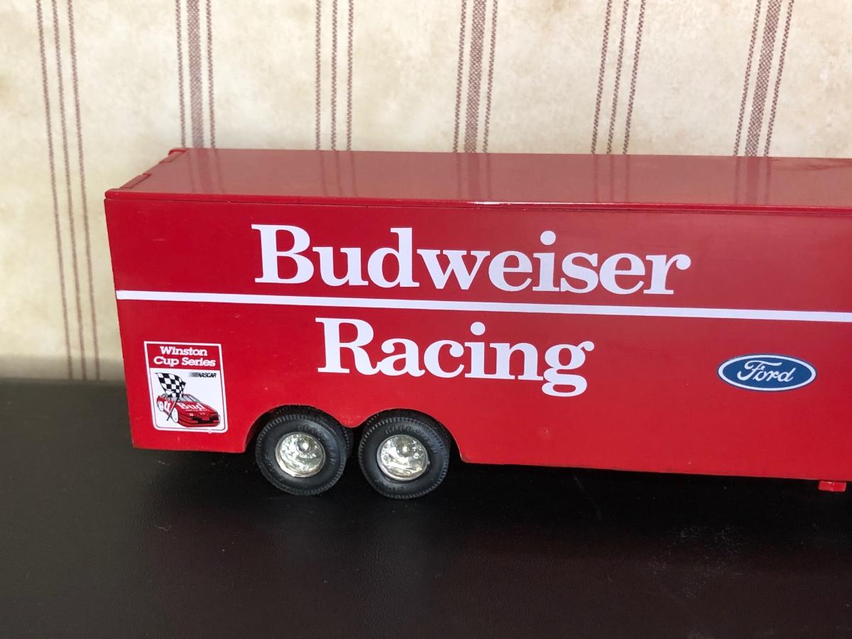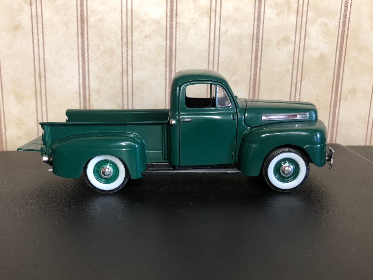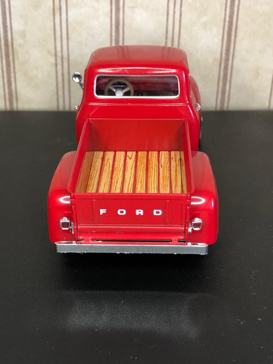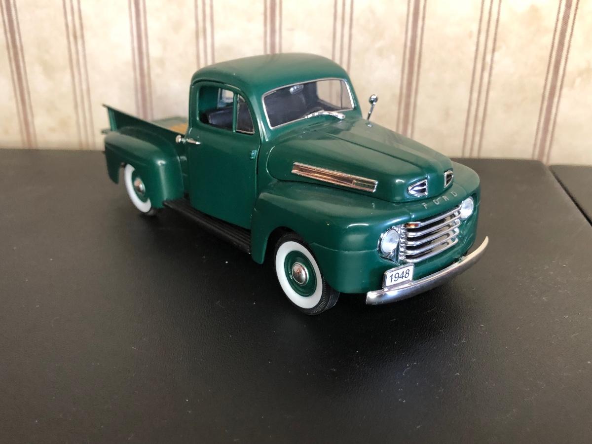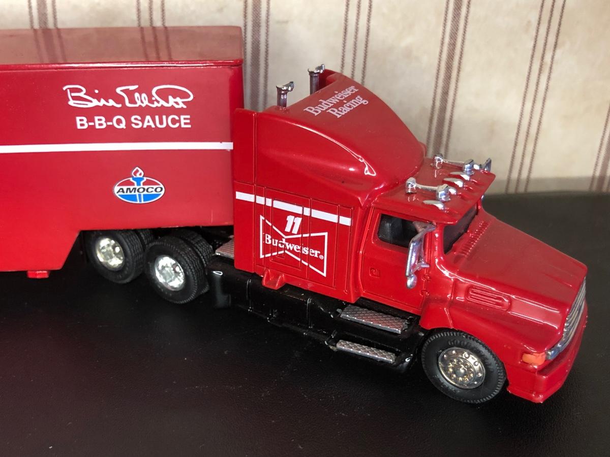 Includes a blue and white Ford 5000 model tractor, a 50th Anniversary Ford model tractor, three different Ford Pickup models (1948 F-1, 1956 F100, & 1936 Ford Pickup w/ COA), a Bill Elliot 1988 NASCAR Champion Ford model semi-truck, a Budweiser Racing Winston Cup Series Ford semi-truck made by Racing Champions, and a vintage can of Ford Repair Out-Fit.