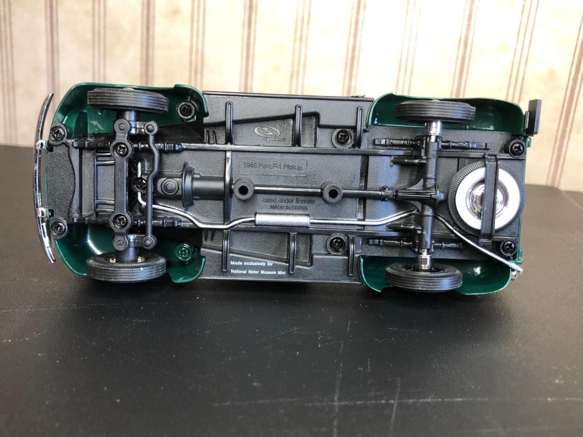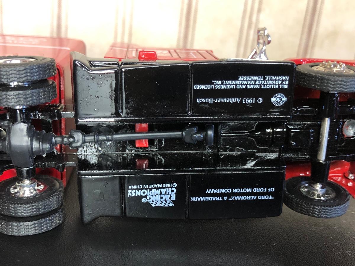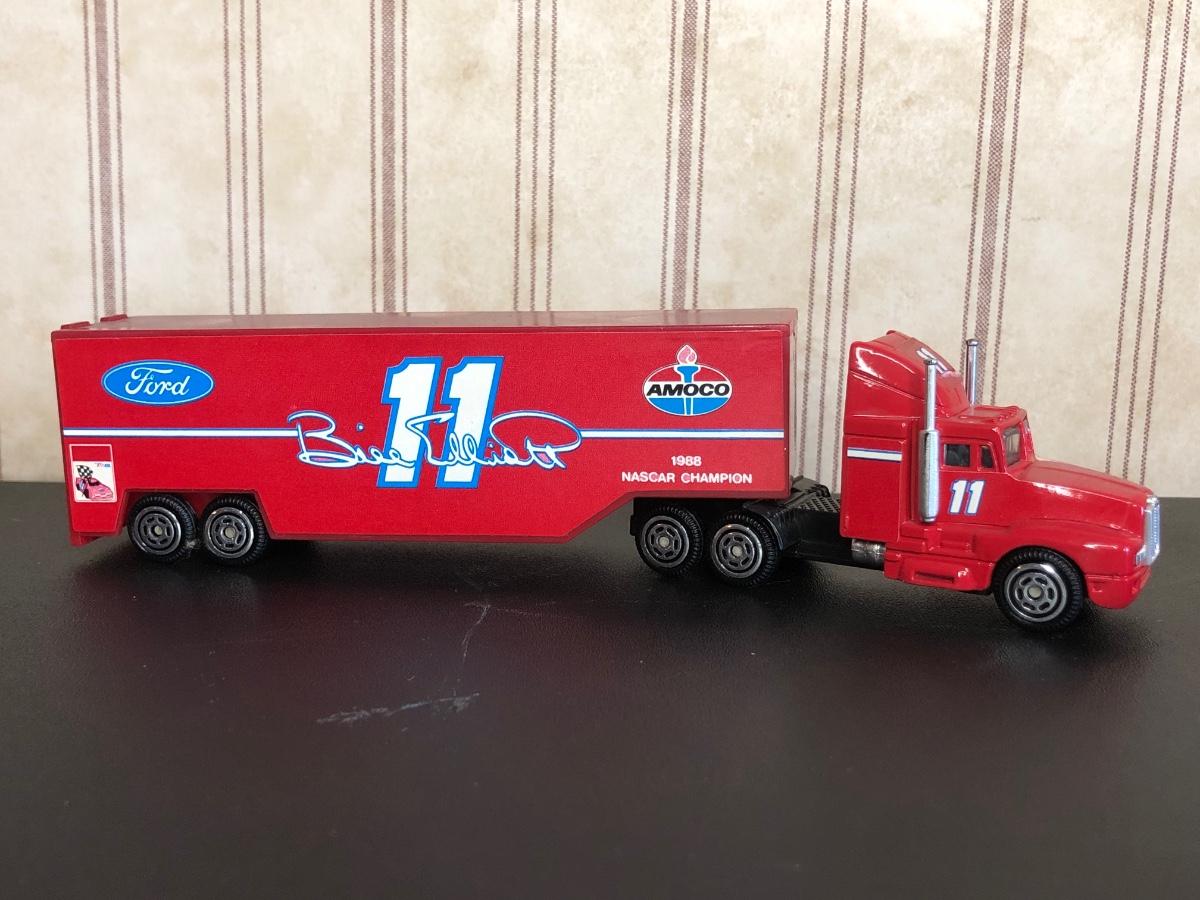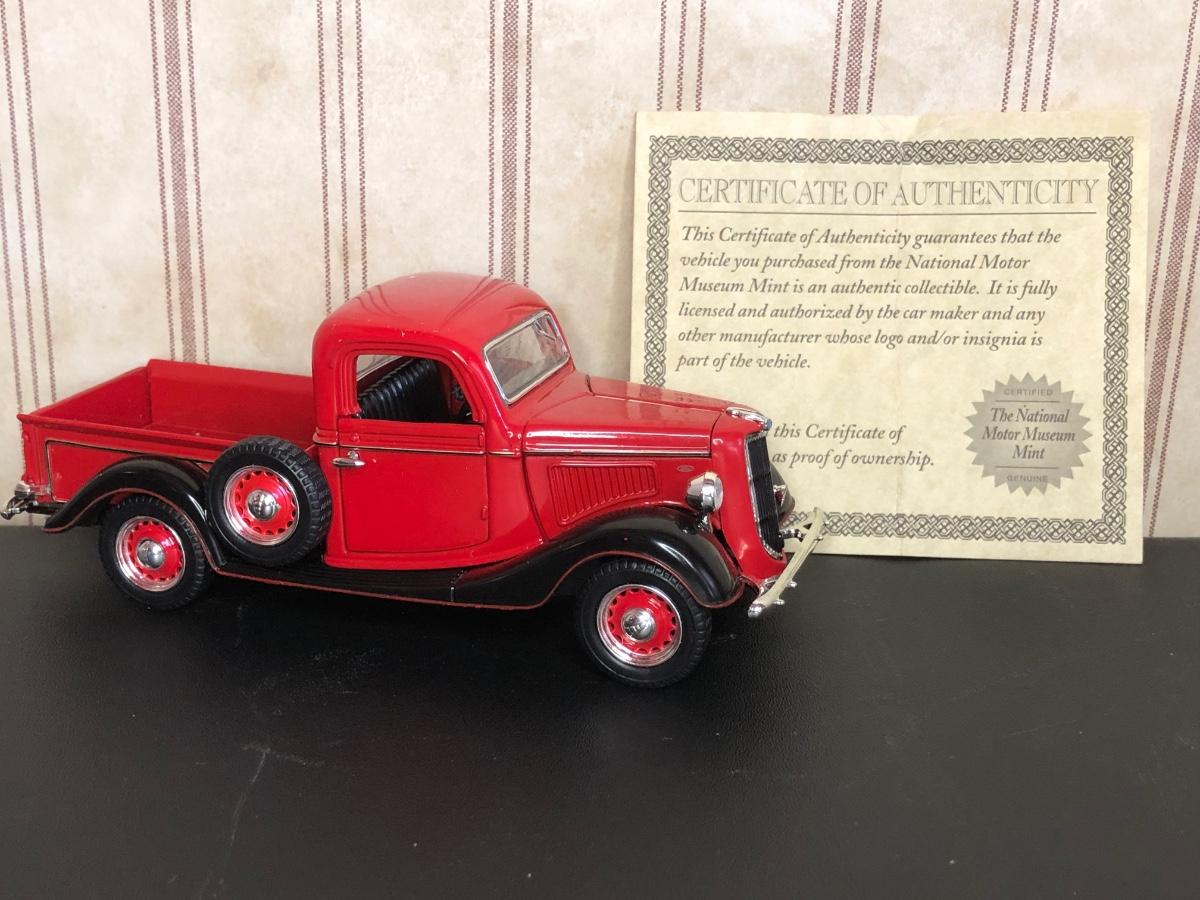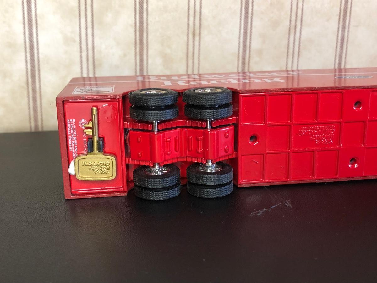 Includes a blue and white Ford 5000 model tractor, a 50th Anniversary Ford model tractor, three different Ford Pickup models (1948 F-1, 1956 F100, & 1936 Ford Pickup w/ COA), a Bill Elliot 1988 NASCAR Champion Ford model semi-truck, a Budweiser Racing Winston Cup Series Ford semi-truck made by Racing Champions, and a vintage can of Ford Repair Out-Fit.