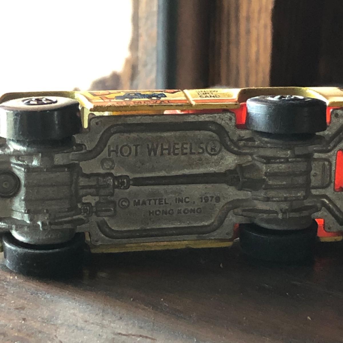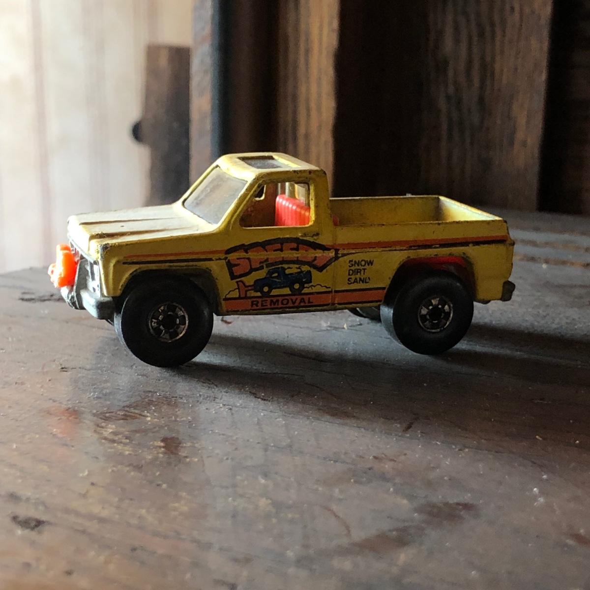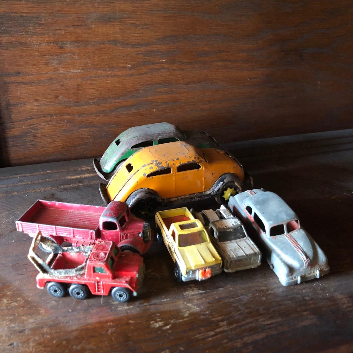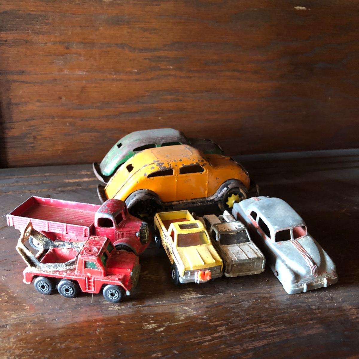 Includes seven models: Dinky Toys Mercano Austin Truck, 1979 Hot Wheels Speedy Removal Truck, a Tootsie Toy Car, 1974 Hot Wheels pickup, & more unlabeled cars.
