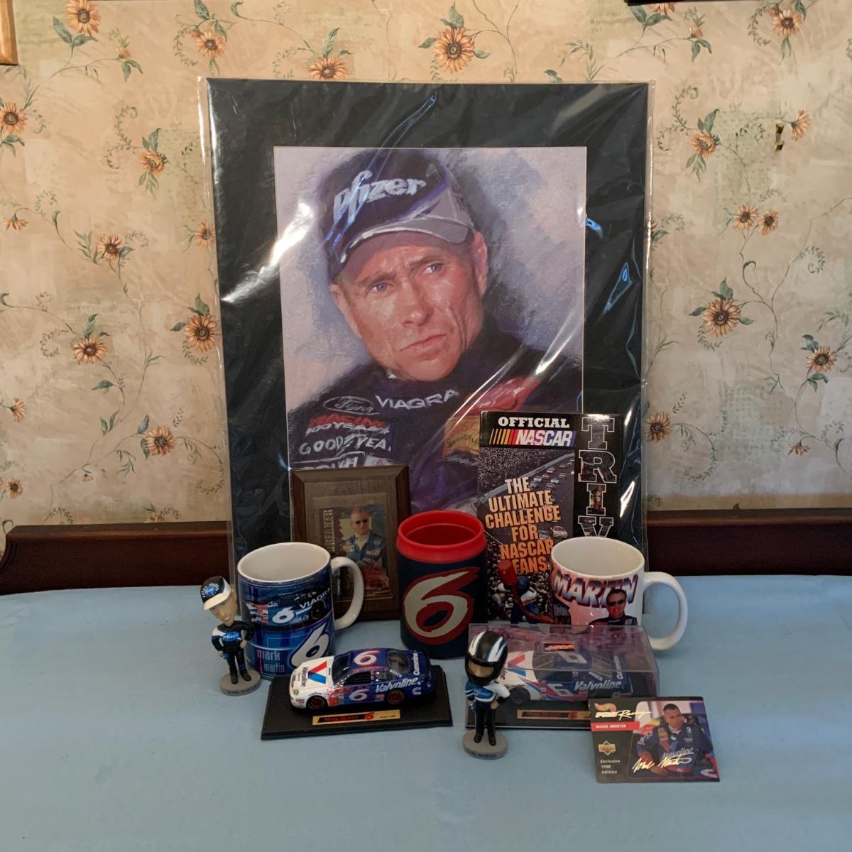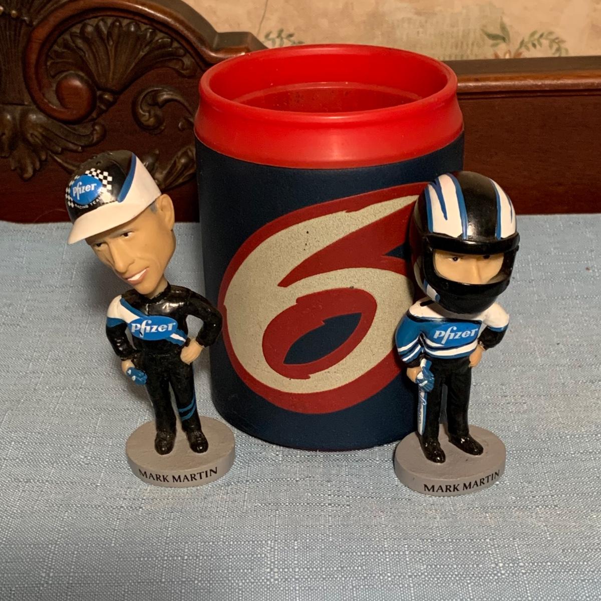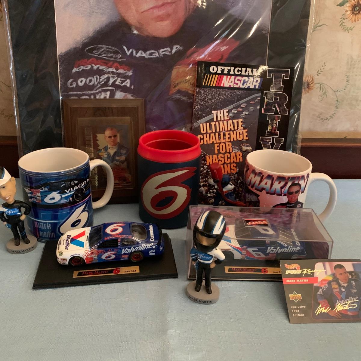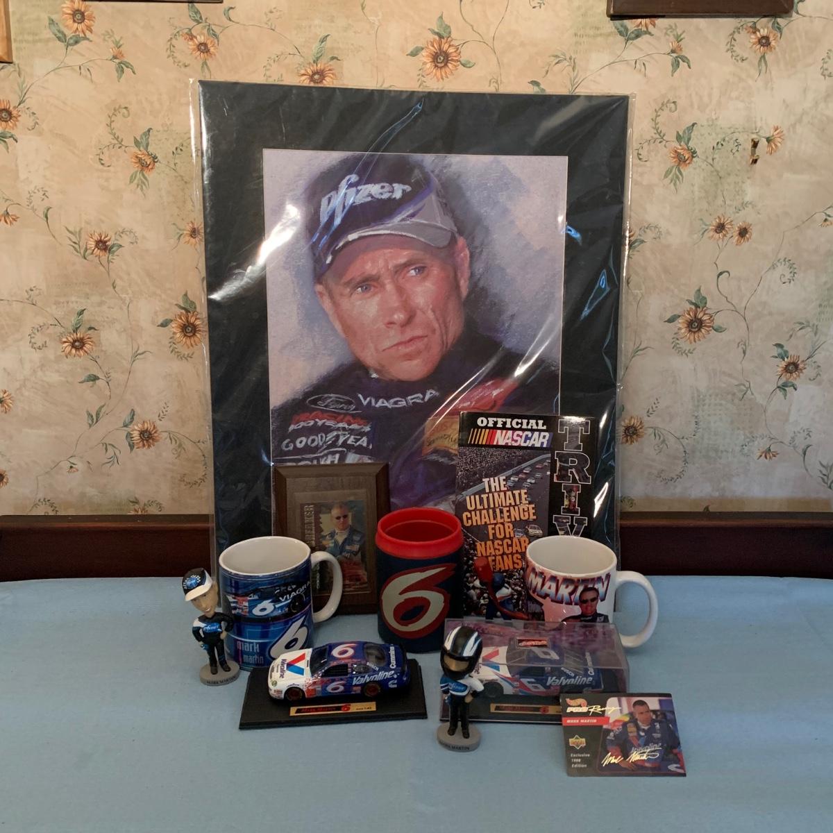 LOT 46R: Nascar Collectibles: Mugs, Mini Bobble Heads, Mark Martin Framed Card, Nascar Trivia Book & More