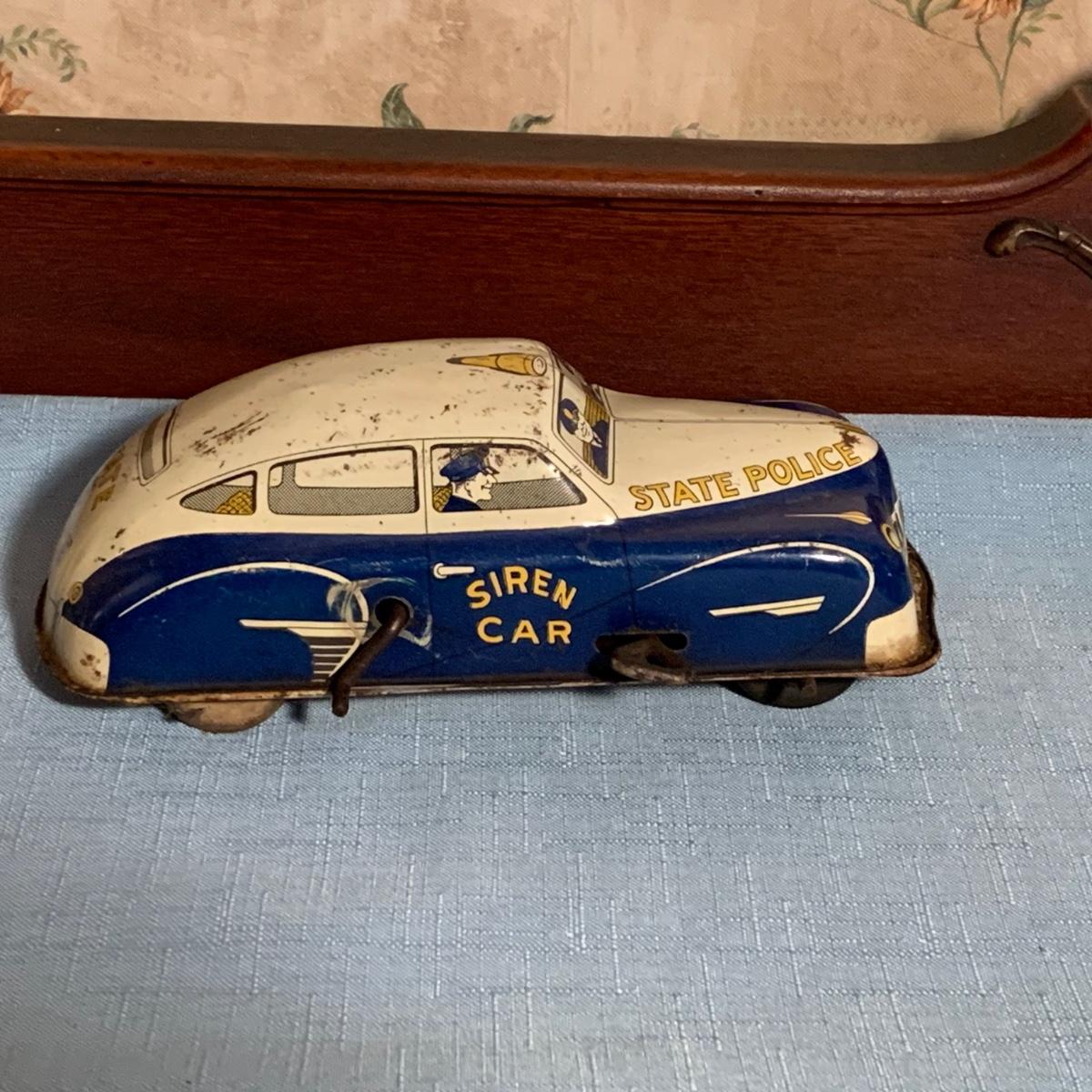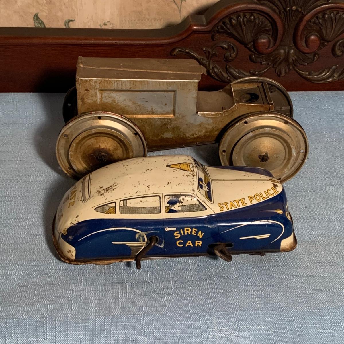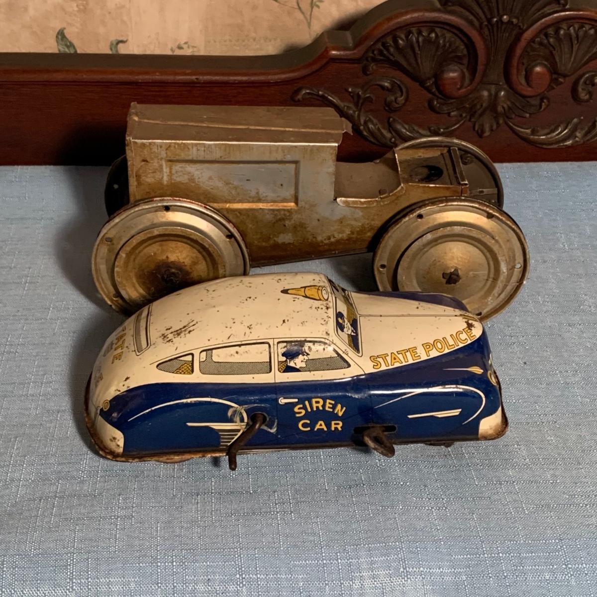 LOT 53R: Vintage 1950s Siren Police Car Windup Tin Taxi Walt Reach Toy Cortland & Vintage Tin "Animate Toy" Tractortor