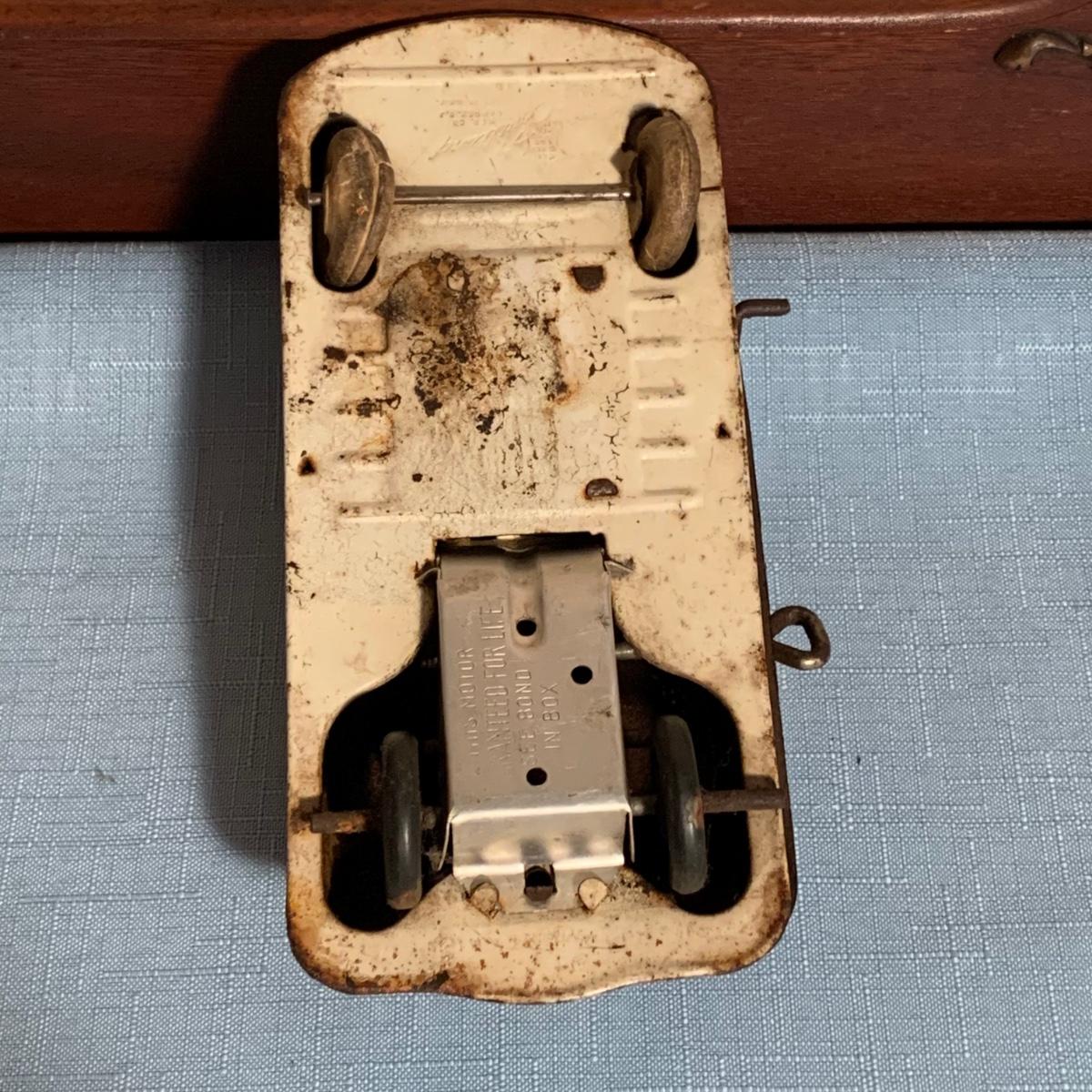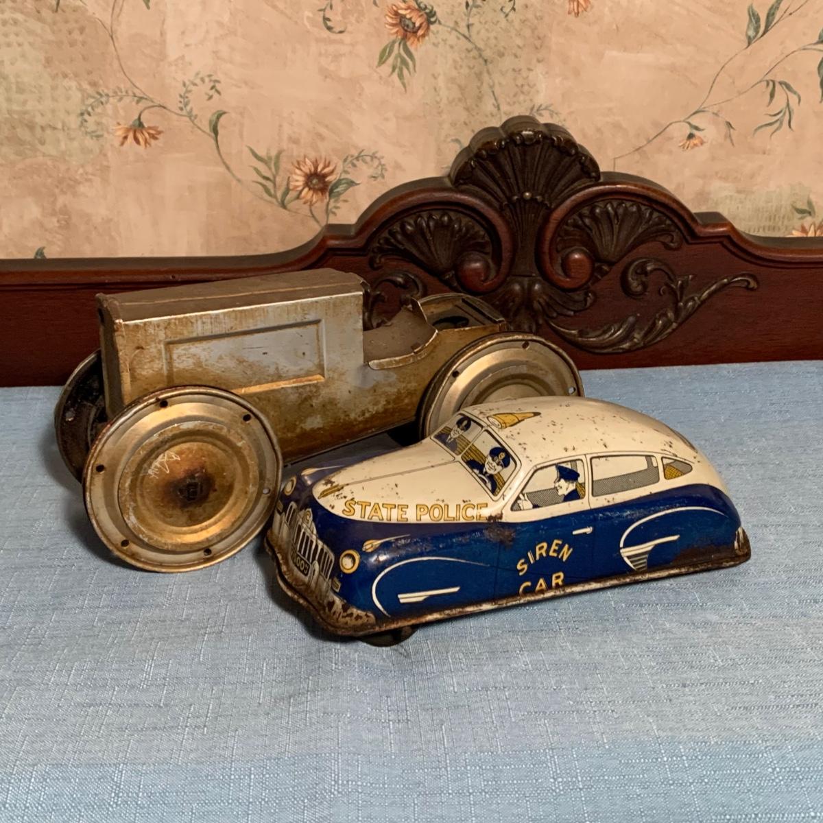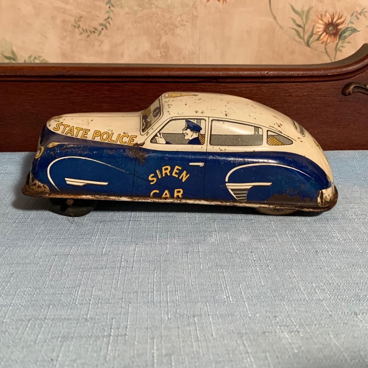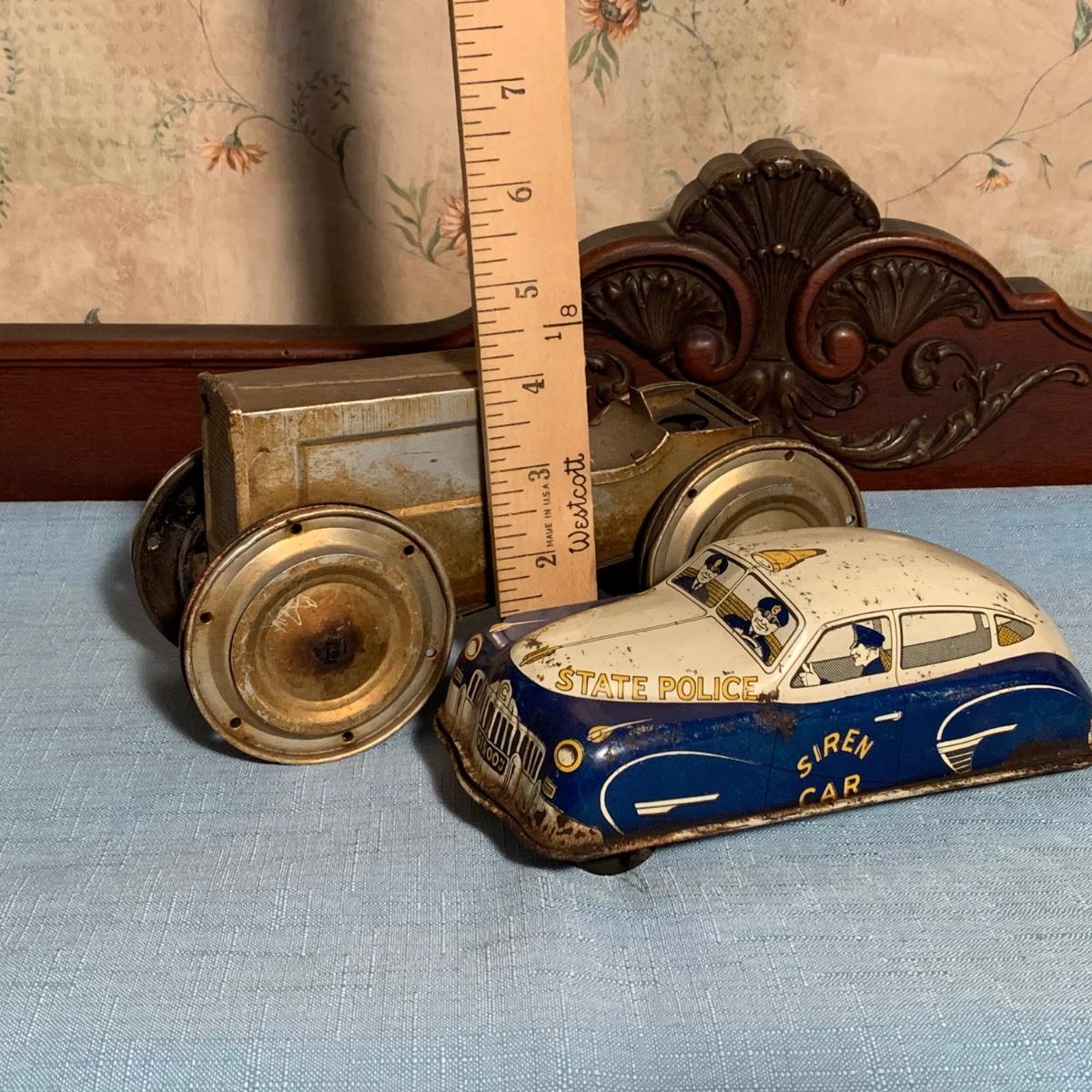 LOT 53R: Vintage 1950s Siren Police Car Windup Tin Taxi Walt Reach Toy Cortland & Vintage Tin "Animate Toy" Tractortor
