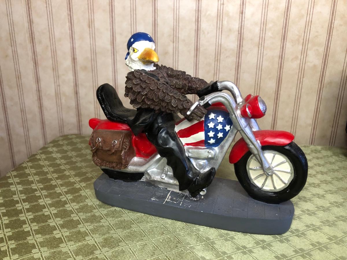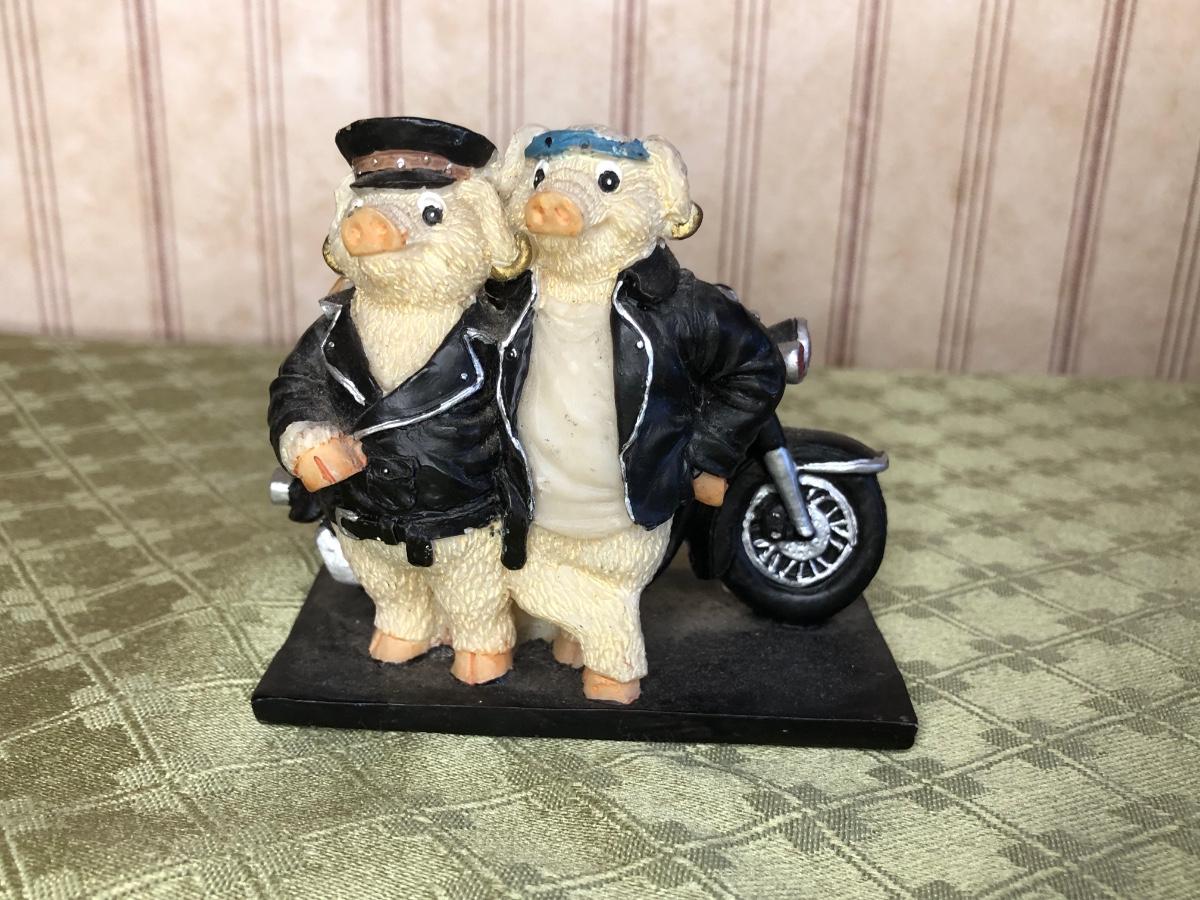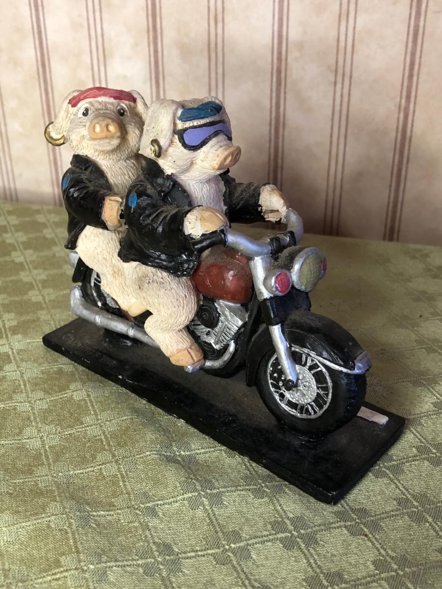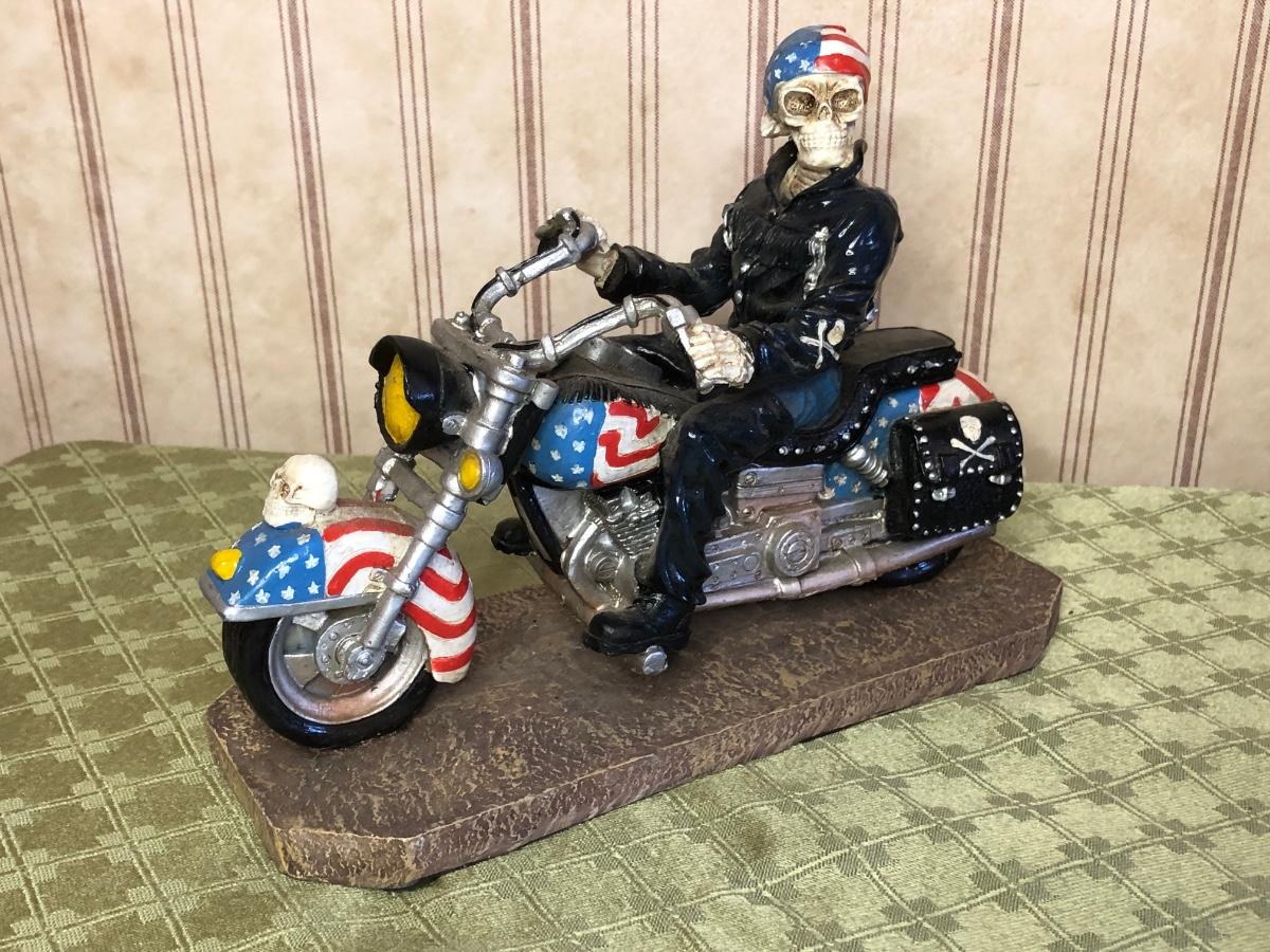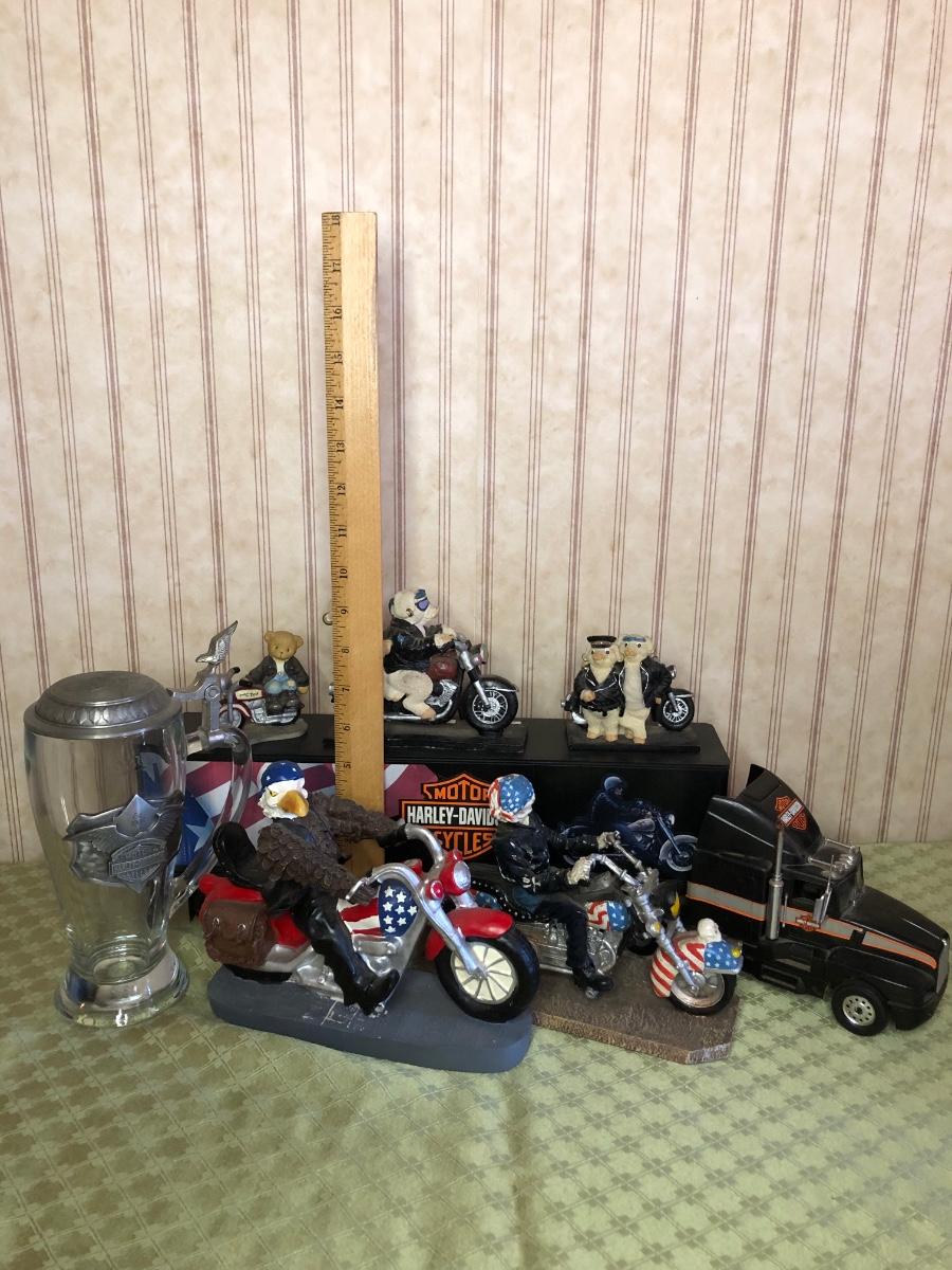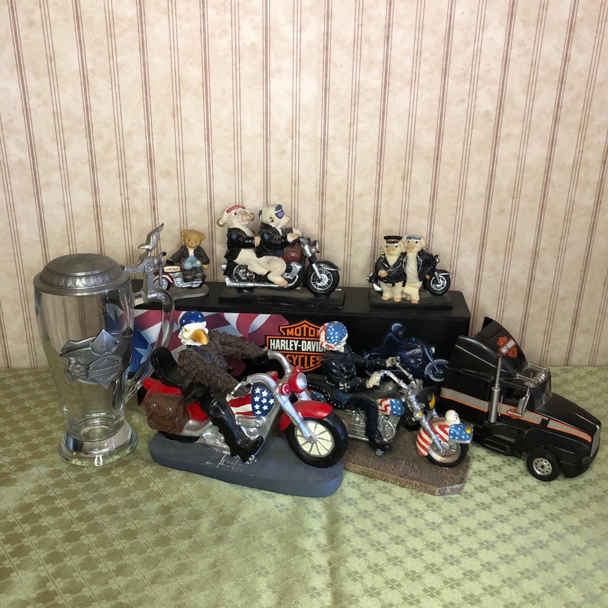 Includes a glass Harley-Davidson stein, two pigs on hogs sculptures made by Young's, a 2004 Cherished Teddies named Rocky, an eagle riding a motorcycle, a skeleton on a motorcycle with the American flag, and a Harley-Davidson semi-truck model. The semi-truck model is missing a small window attachment (see closeup photos).