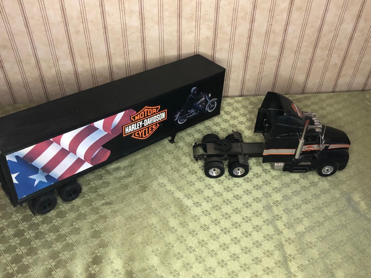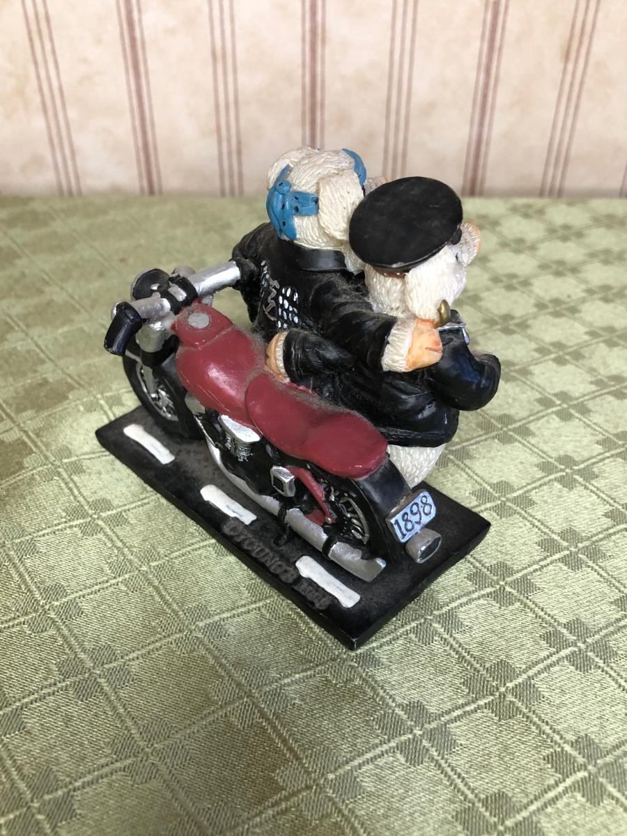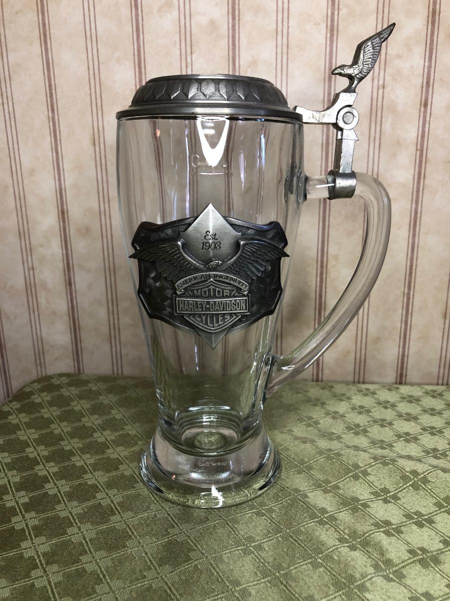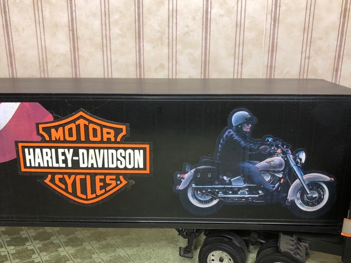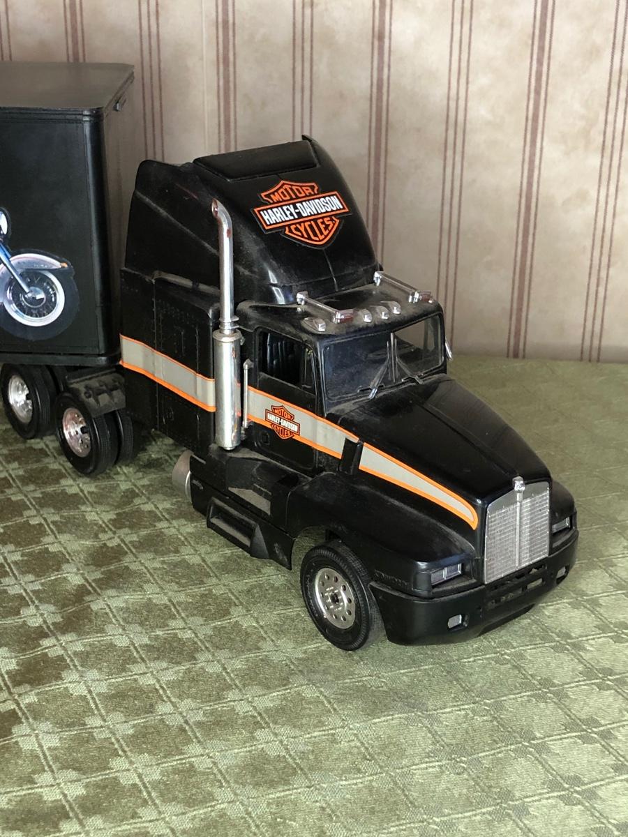 Includes a glass Harley-Davidson stein, two pigs on hogs sculptures made by Young's, a 2004 Cherished Teddies named Rocky, an eagle riding a motorcycle, a skeleton on a motorcycle with the American flag, and a Harley-Davidson semi-truck model. The semi-truck model is missing a small window attachment (see closeup photos).