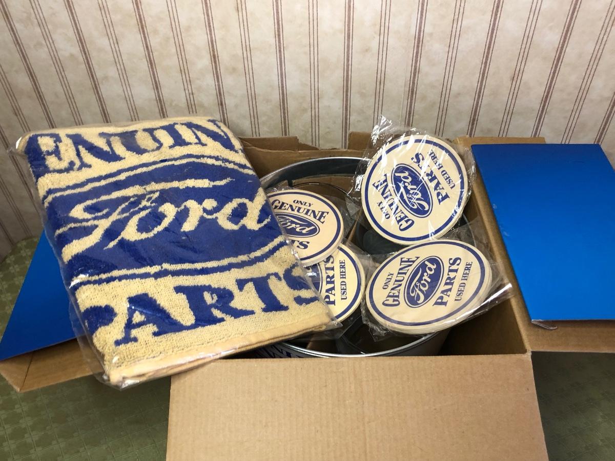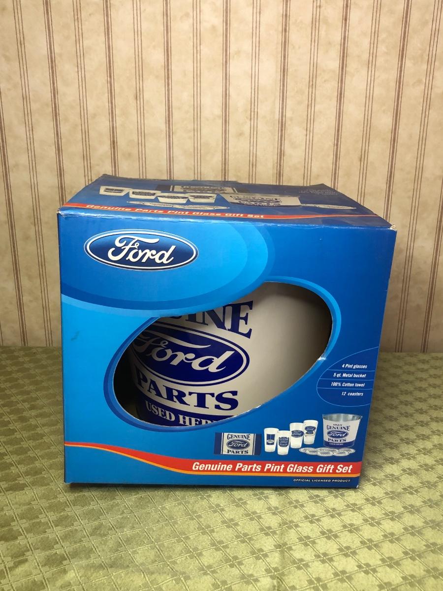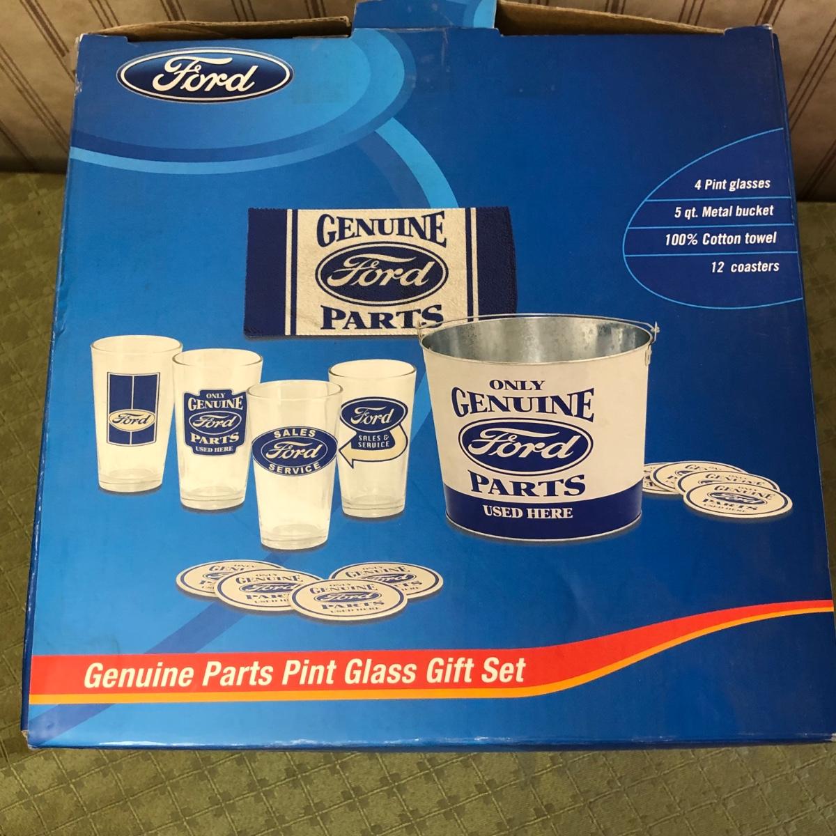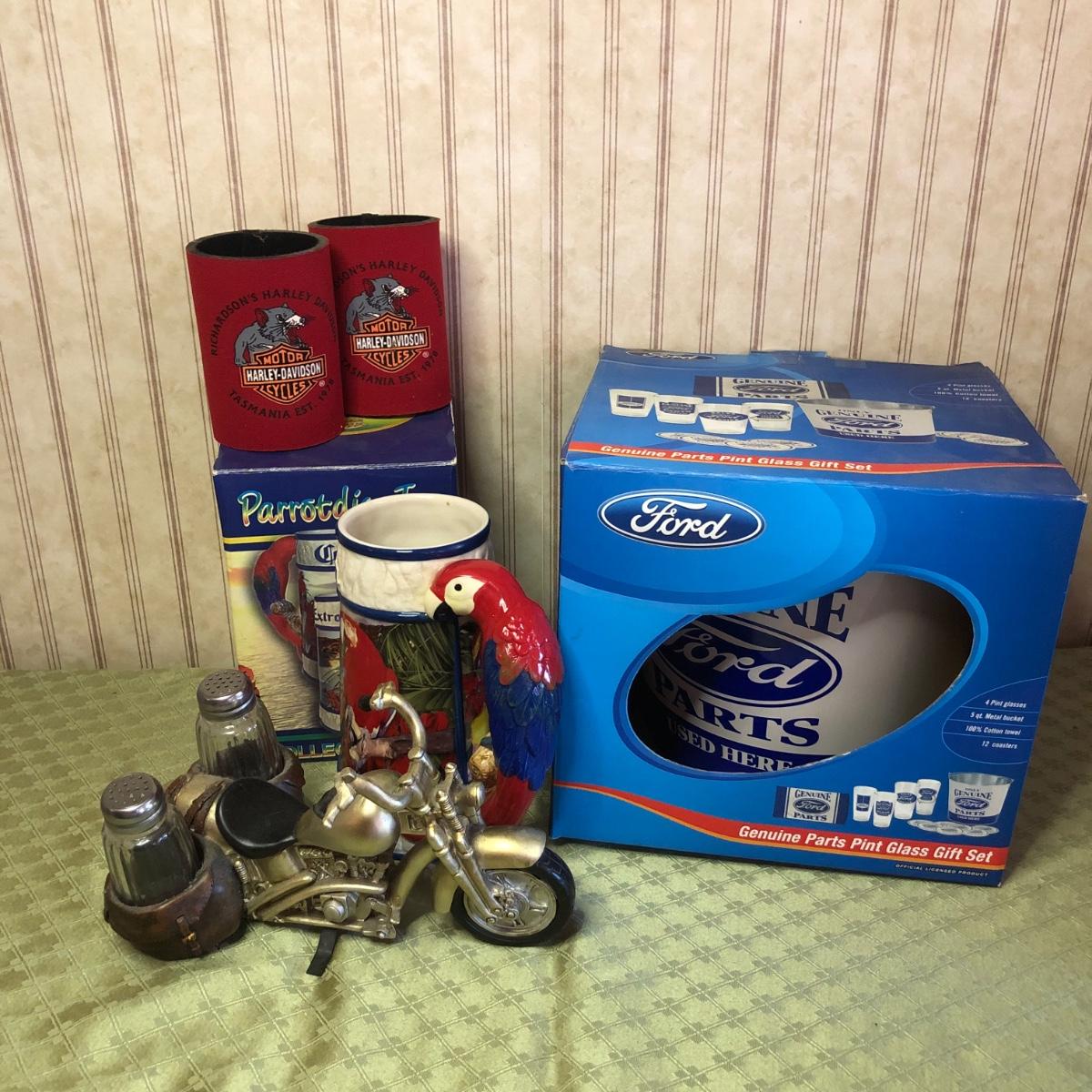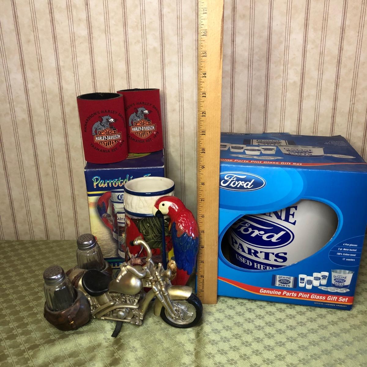 Ford Promotional Drink Bucket includes ice bucket, four pint glasses, coasters, and a bar towel. All items are in the box. Corona Extra stein comes with its original box & a Certificate of Authenticity. Also includes two Richardson's Harley-Davidson drink koozies and a motorcycle salt & pepper holder.