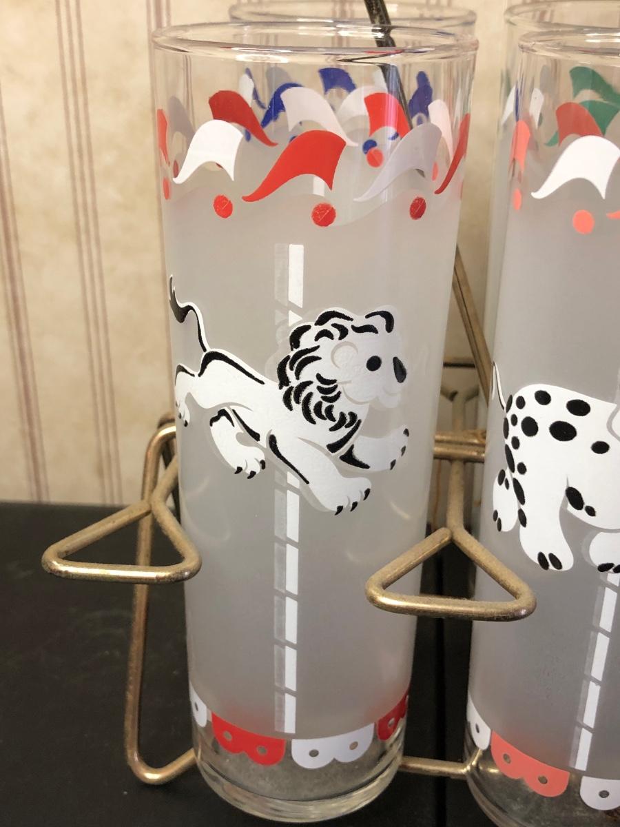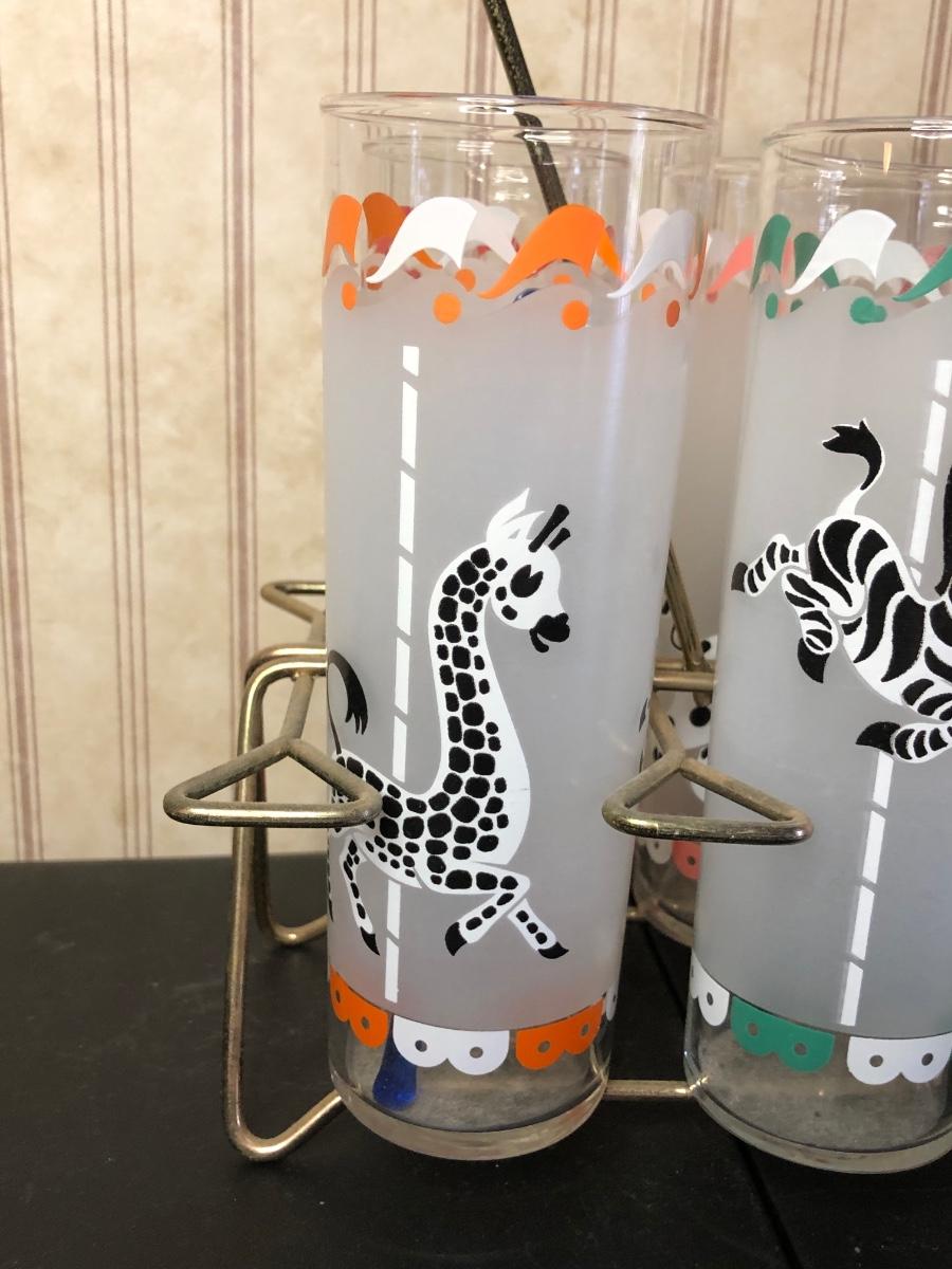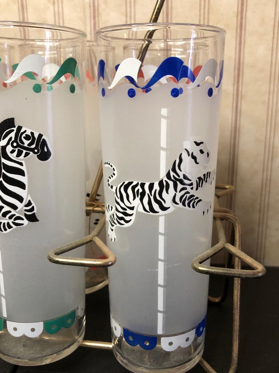 Includes a set of six glasses with different carousel-themed animals on them.
