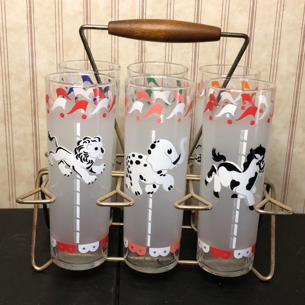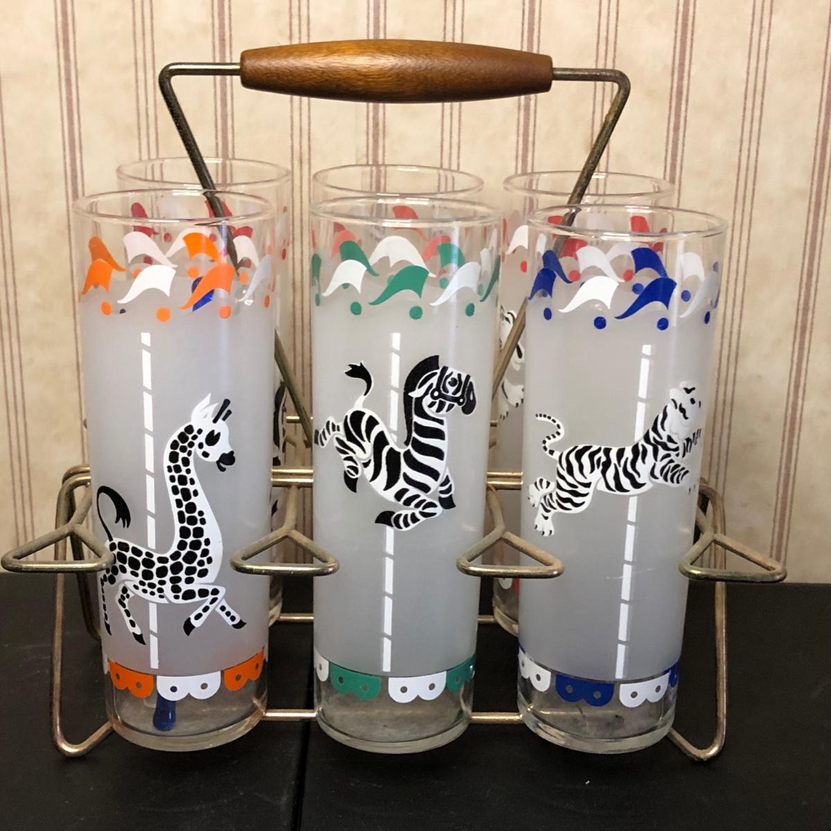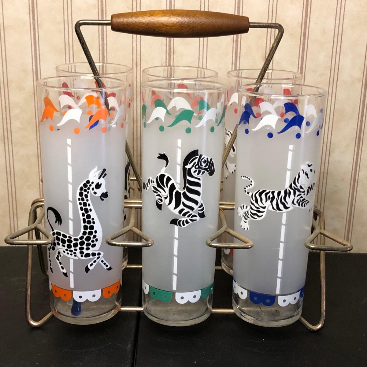 Includes a set of six glasses with different carousel-themed animals on them.