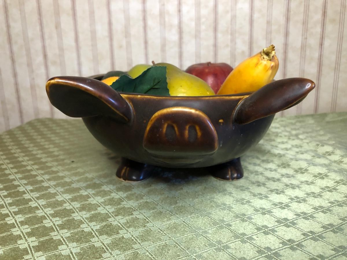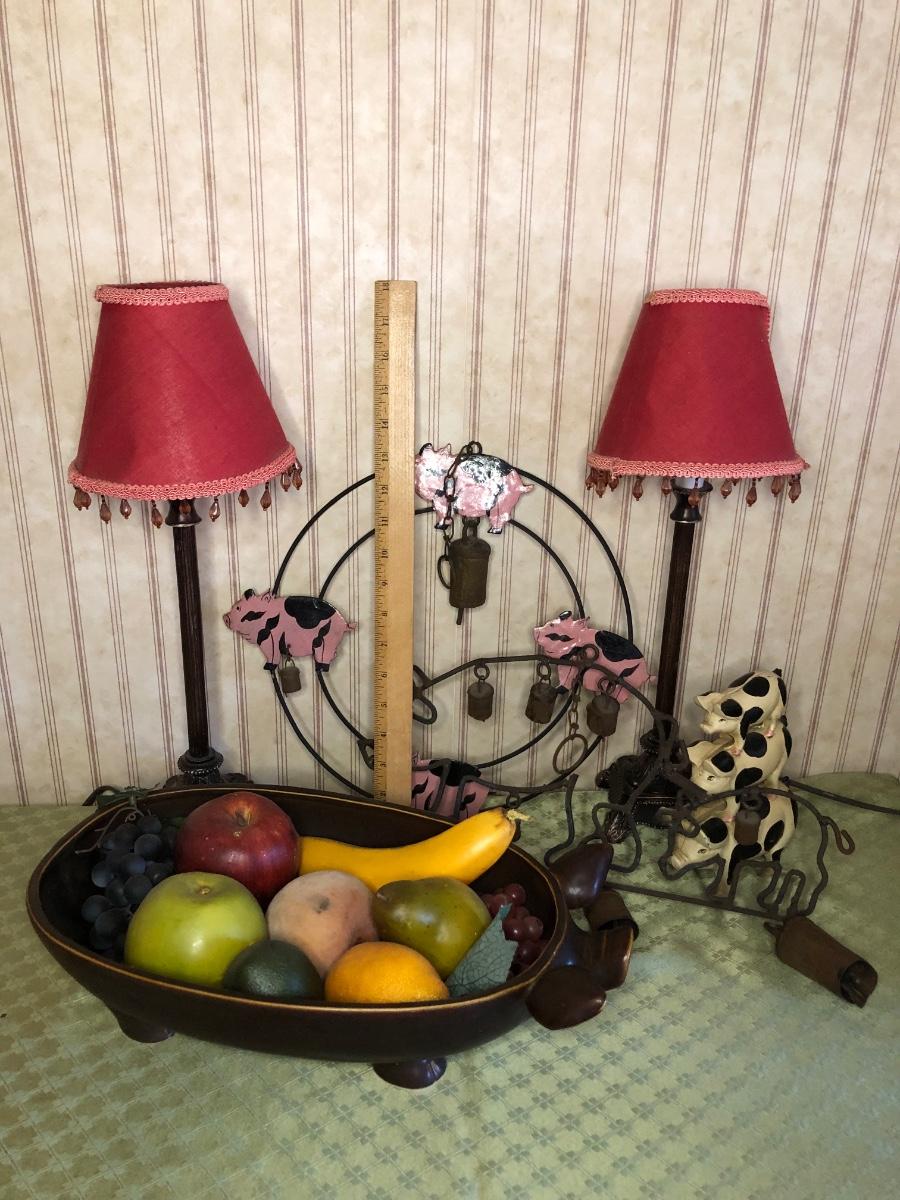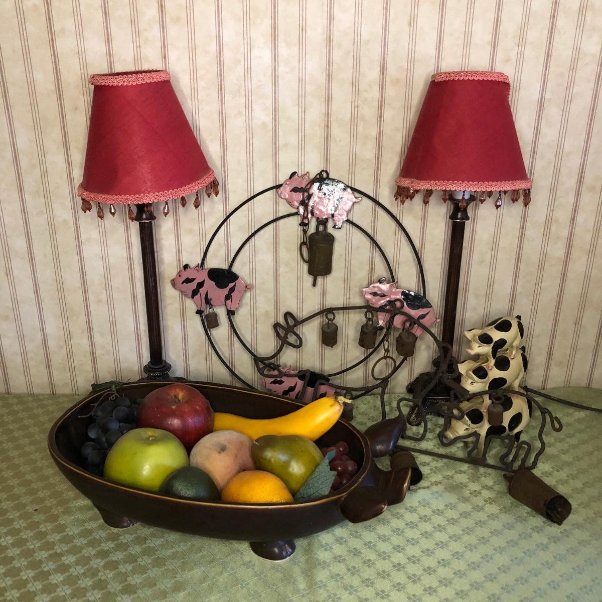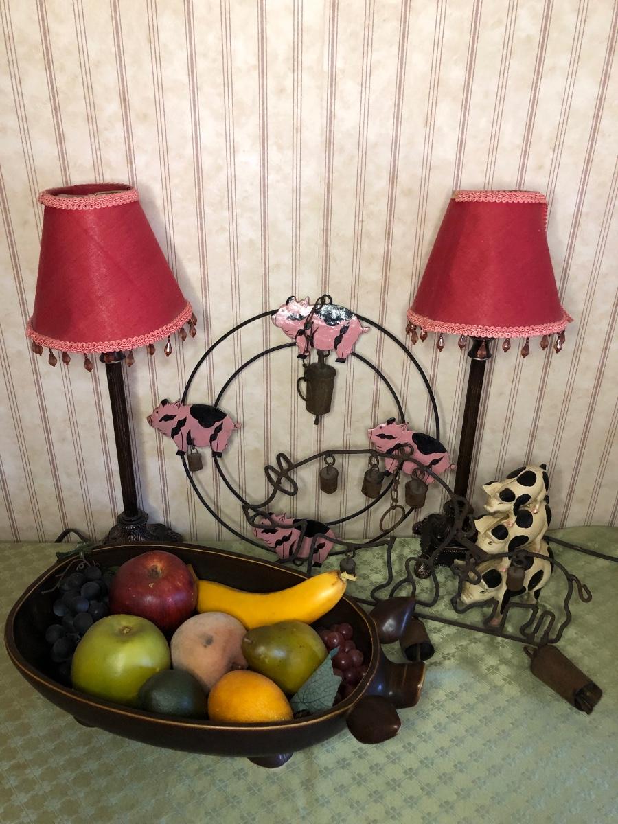 Includes a bowl shaped like a pig with faux fruit in it, two wall hangings with pig motif, a small stacked pig statue, and a pair of matching lamps with red shades. The ribbon on one of the lampshades is falling off (see photos).
