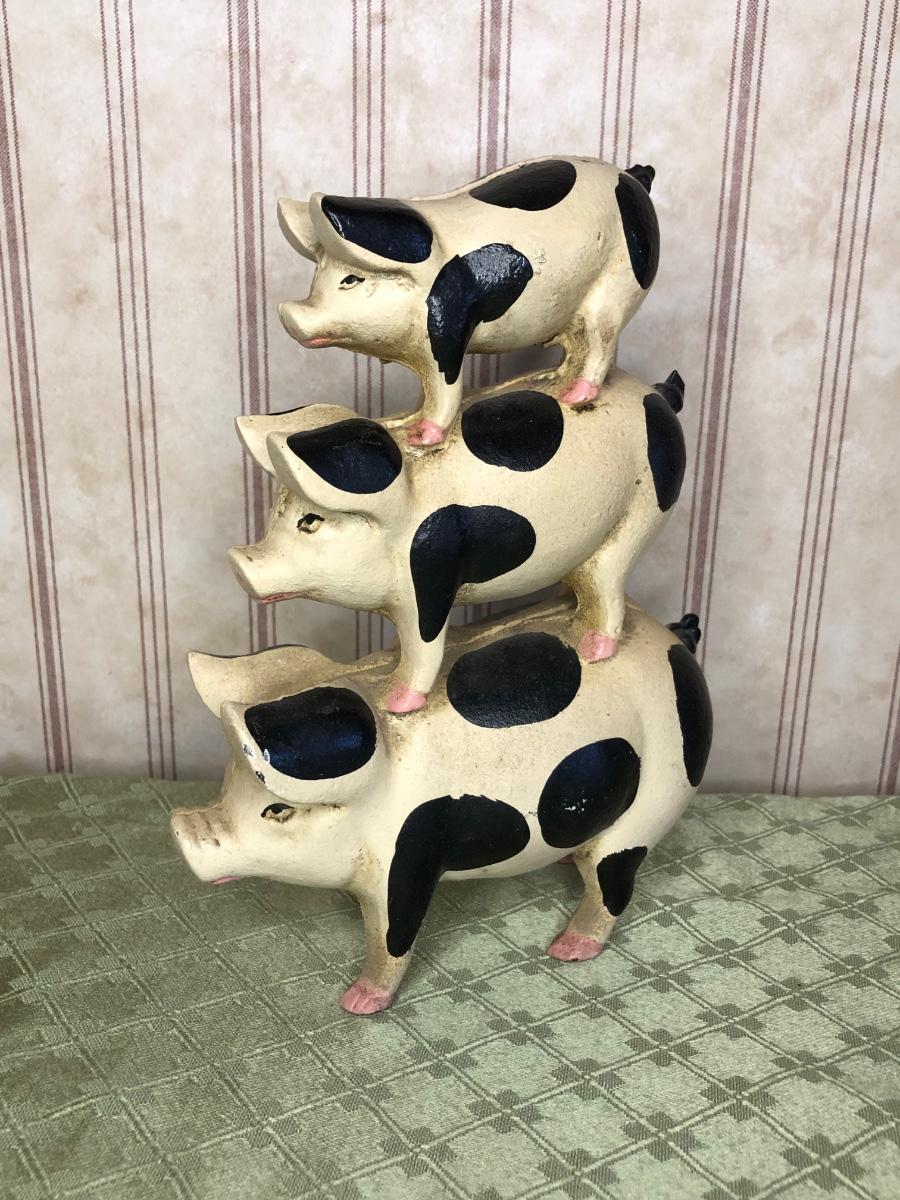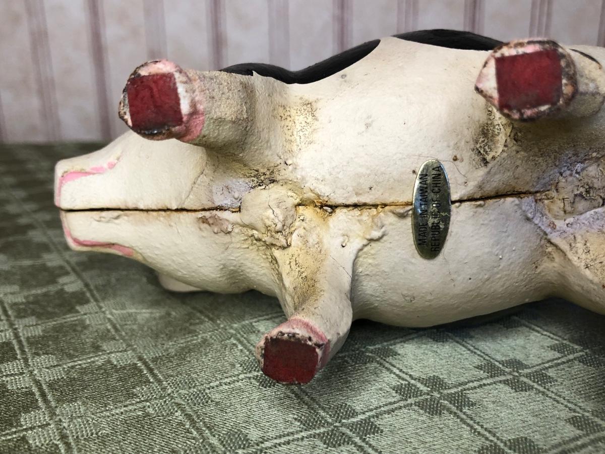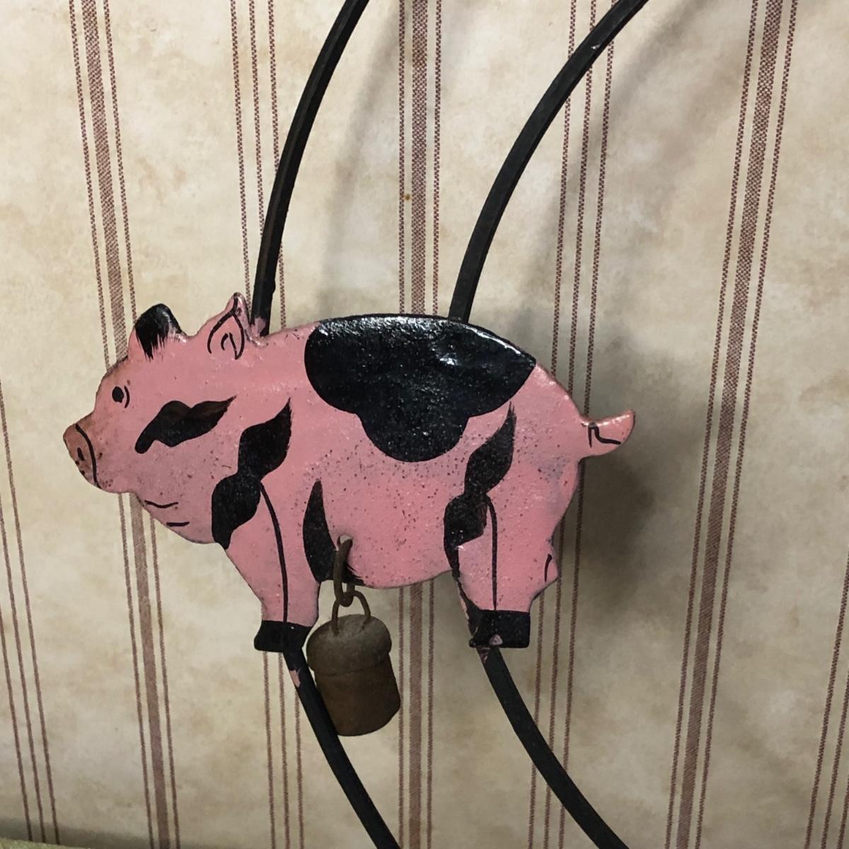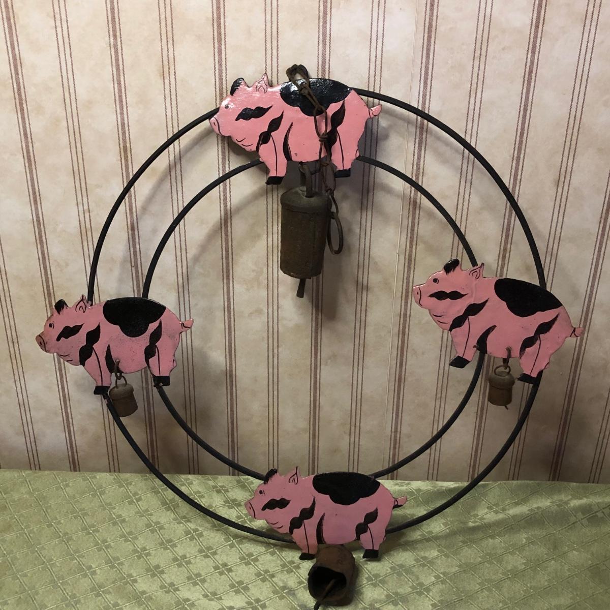 Includes a bowl shaped like a pig with faux fruit in it, two wall hangings with pig motif, a small stacked pig statue, and a pair of matching lamps with red shades. The ribbon on one of the lampshades is falling off (see photos).