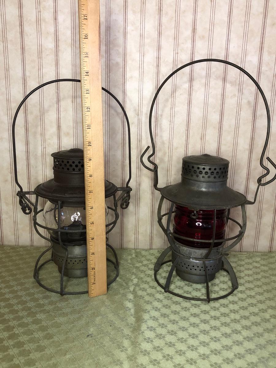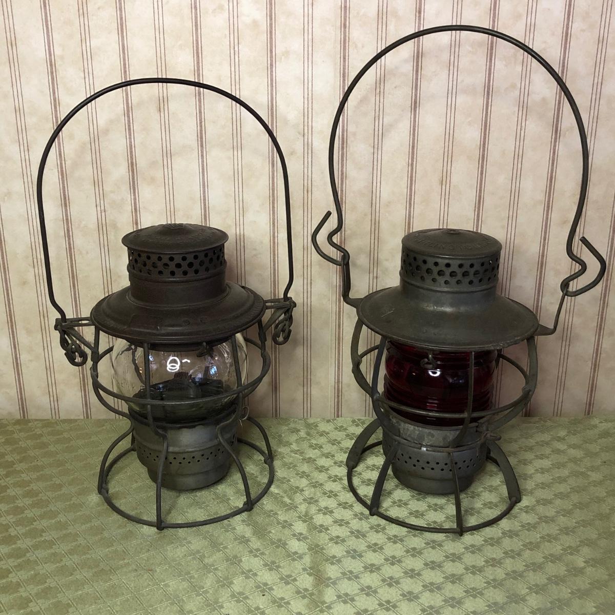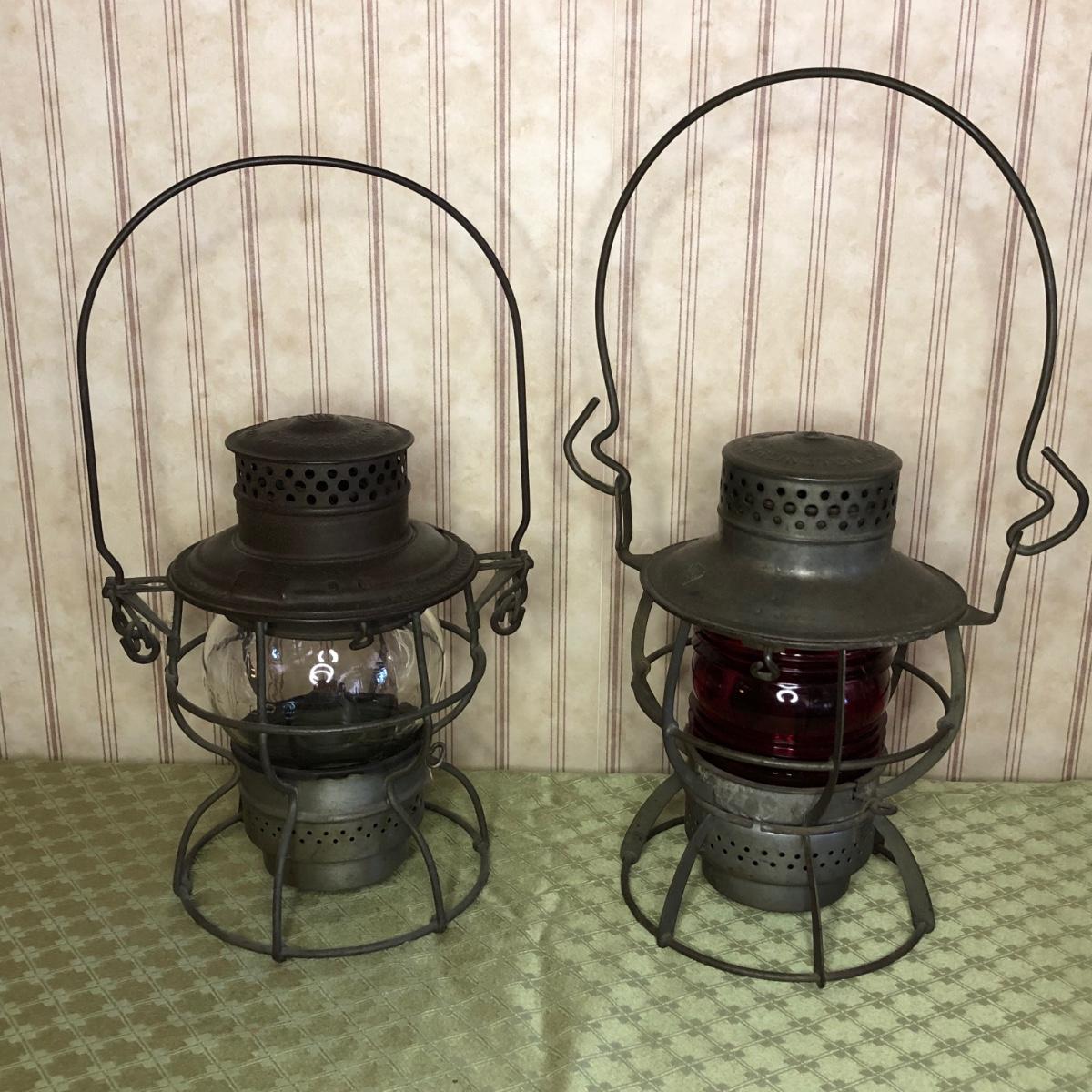 Includes two railroad lanterns, one with a red globe and one with a clear glass one. The Dressel is labeled Arlington, Virginia and the Adams is labeled New York-Chicago.