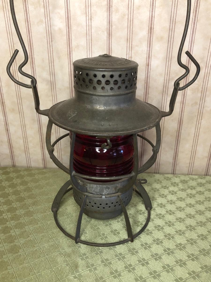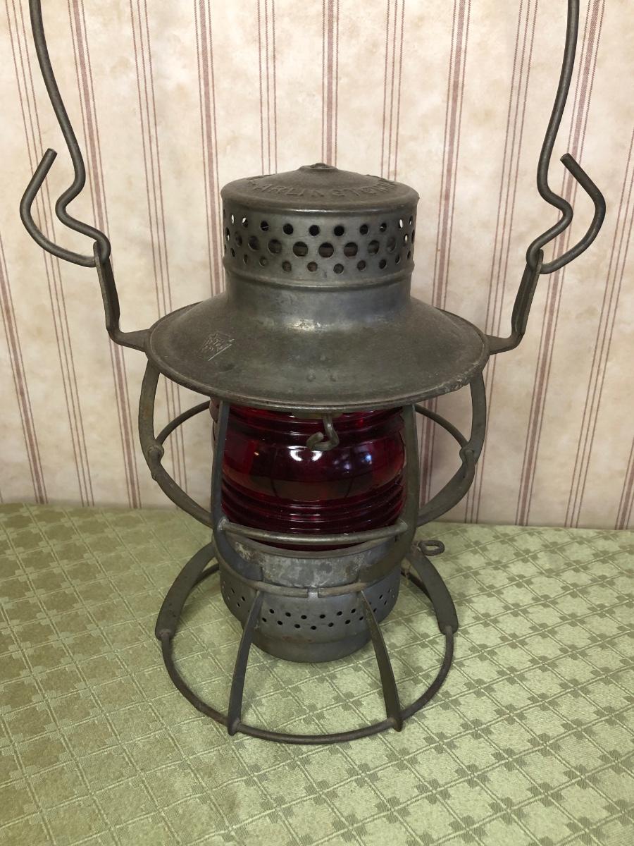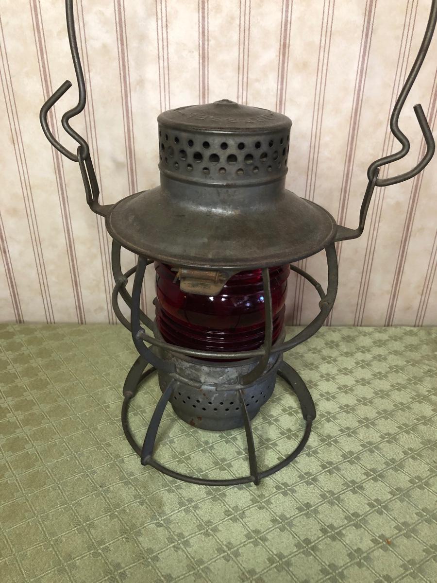 Includes two railroad lanterns, one with a red globe and one with a clear glass one. The Dressel is labeled Arlington, Virginia and the Adams is labeled New York-Chicago.