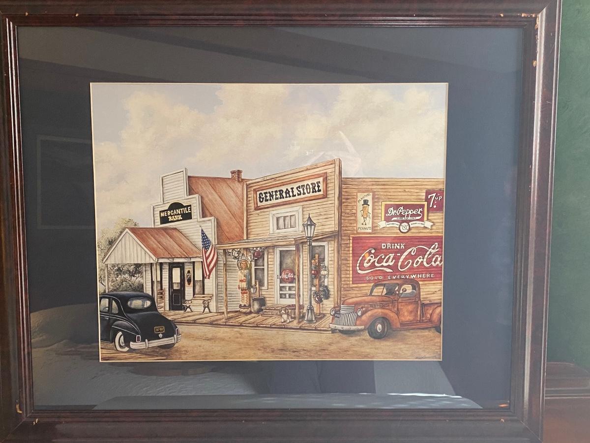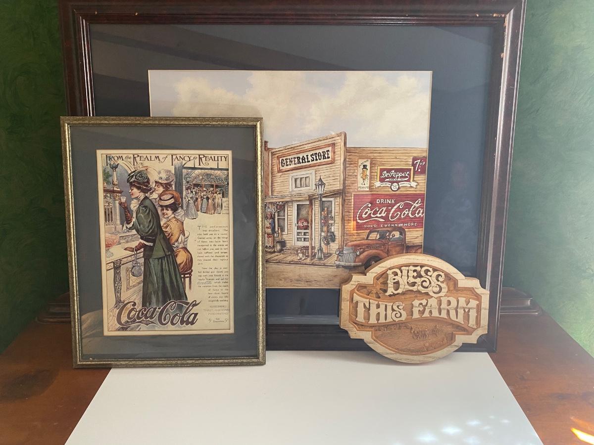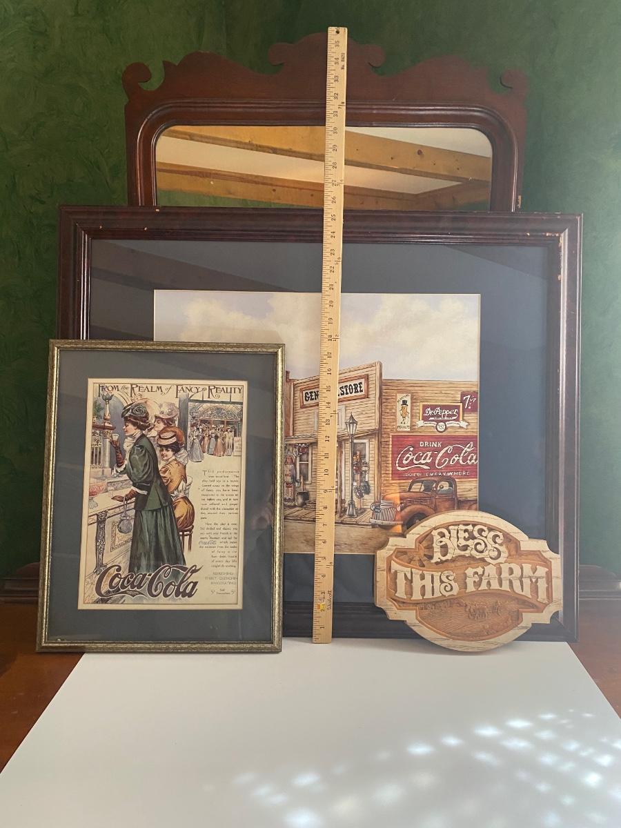 Three wall art pieces. Two framed Coca-Cola prints. “Bess This Farm” wall hanging. Please see all pictures as they are the best representation of the items. The pictures show condition, measurements if taken, and what is included in the lot. Due to the large amount that we photograph and the time frame, we are not always able to take measurements. All items unless noted, are pre-owned and have been used. If you purchased furniture, you must bring help. We do not allow one person to carry large furniture out on their own. Bring help, tools and a truck for the safety of our client’s homes, and your personal safety. Any damages that result to the property including walls, and floors due to moving of the furniture will be charged to the buyer. Company policy. Thank you.