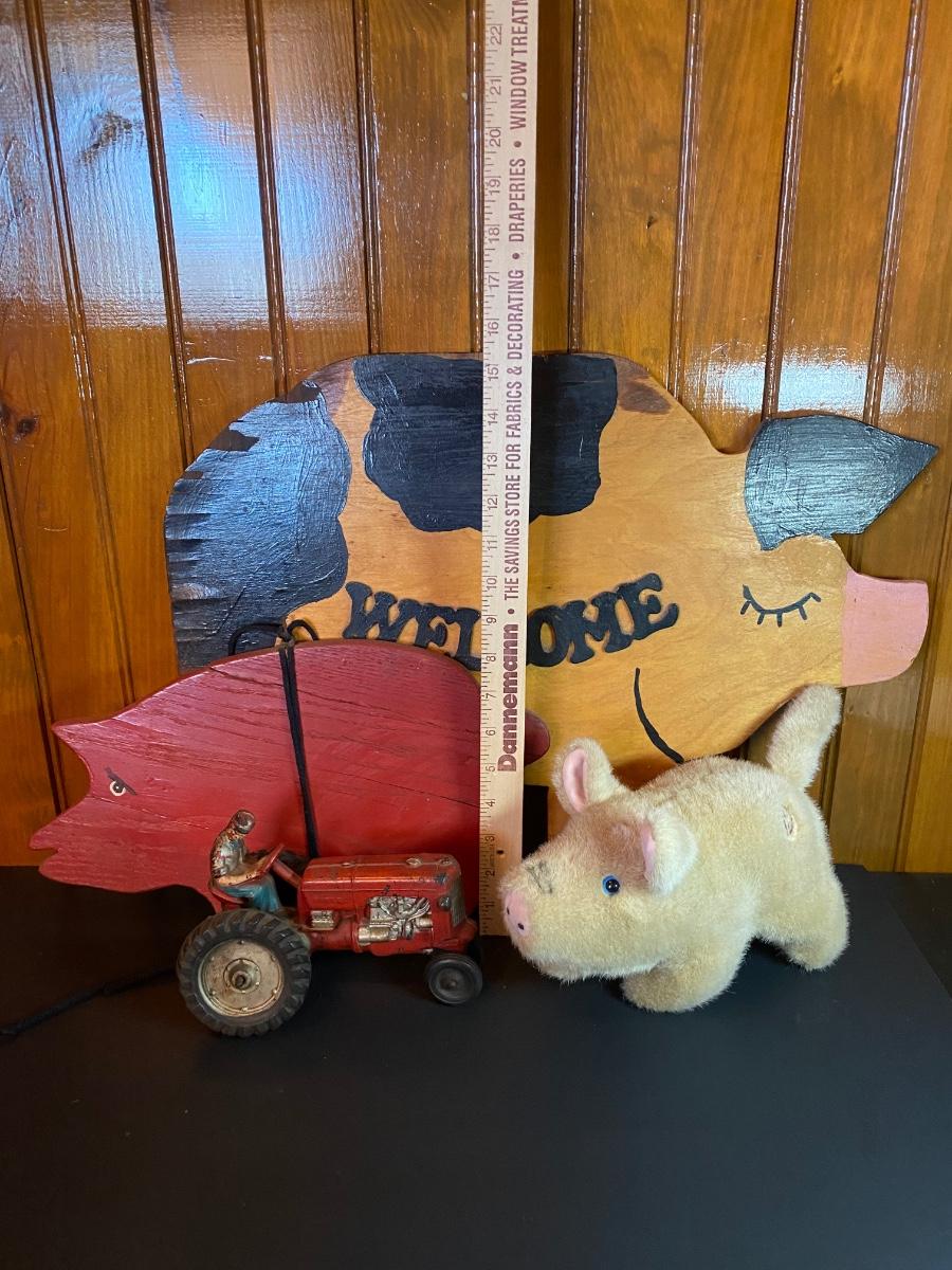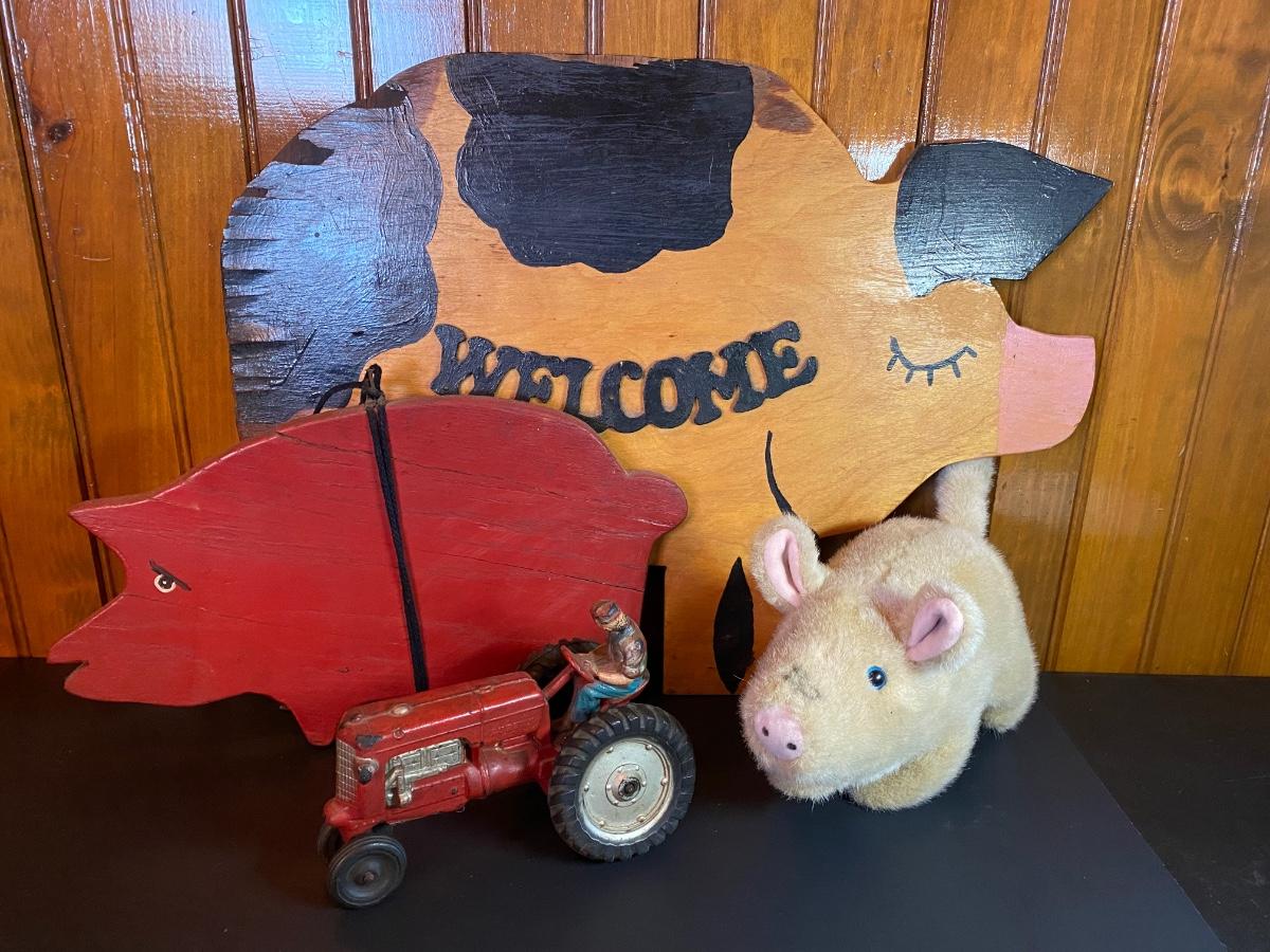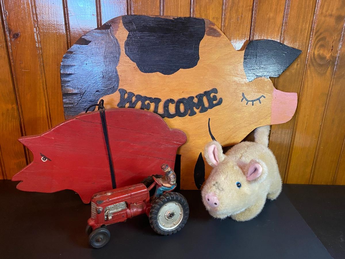 LOT 136C: Pig Wood Signs, Plush Pig and Tractor Toy