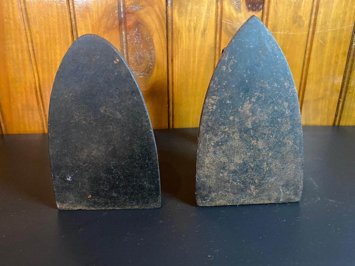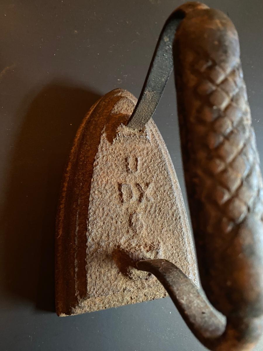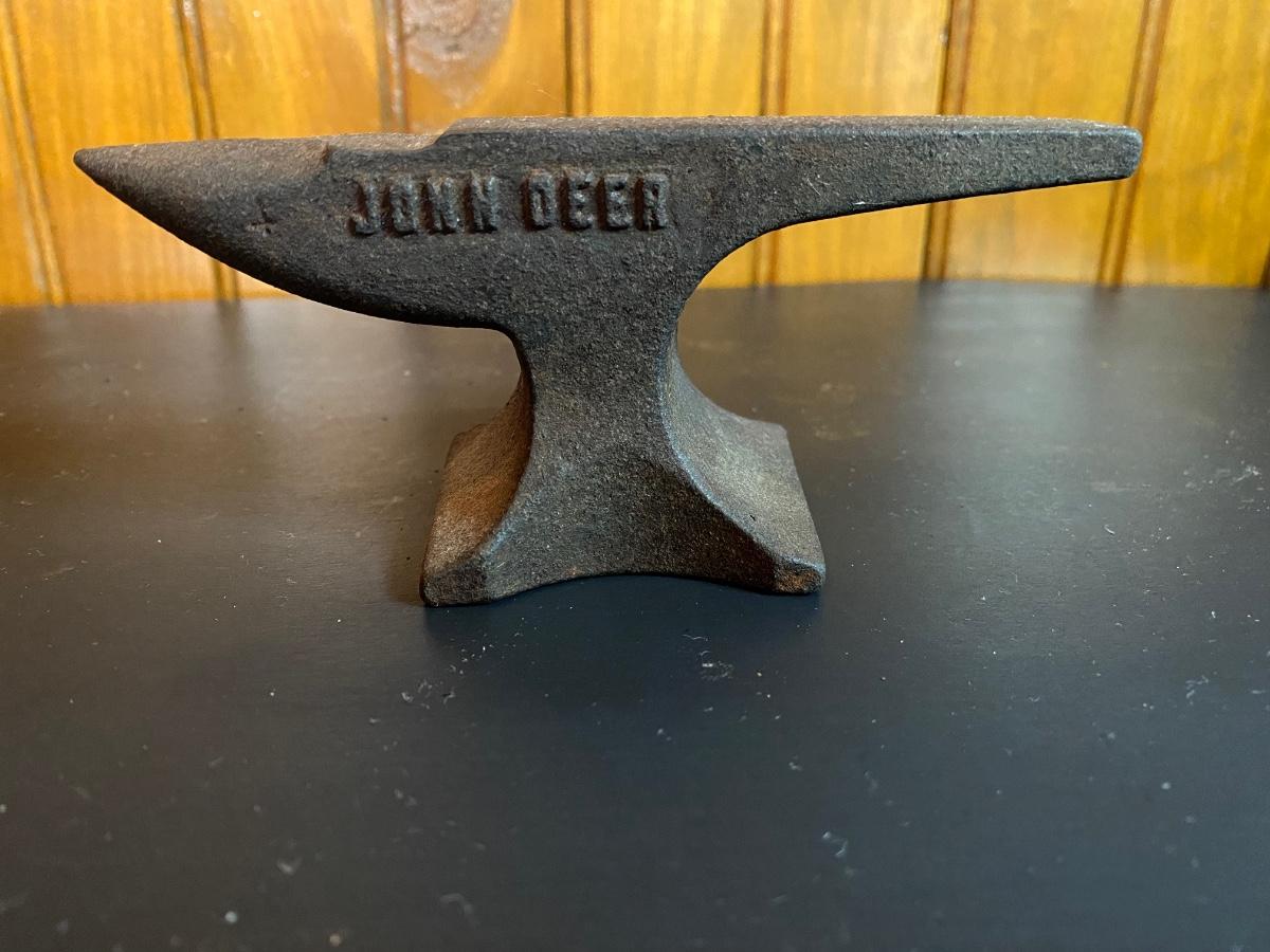 Lot 138: Vintage Cast Iron Flat Iron #C6 &  U-DX #6 Iron, Cast Iron Melting Pot, John Deere Advertising Anvil Paperweight, Mini Jeweler Repair Anvil