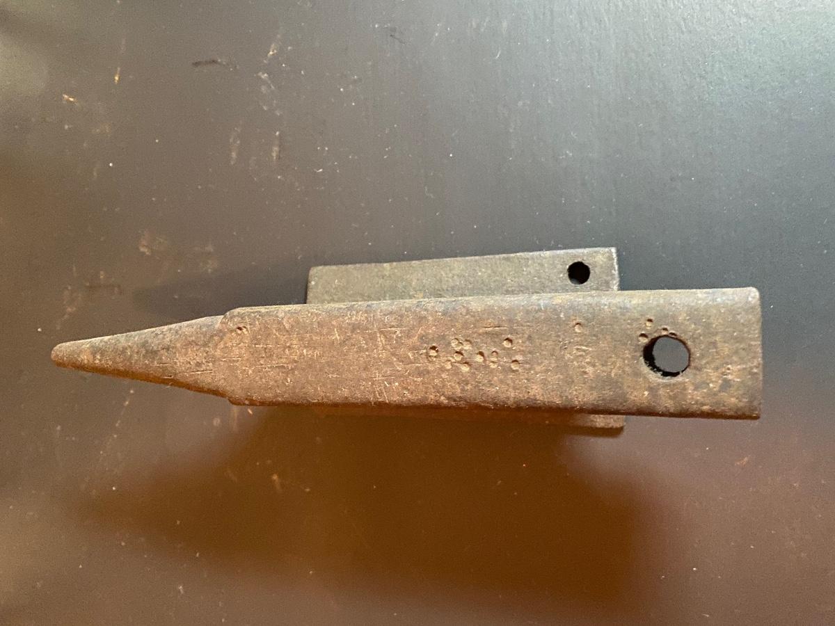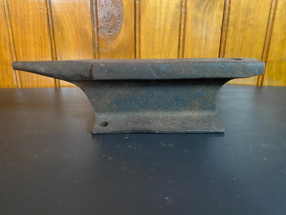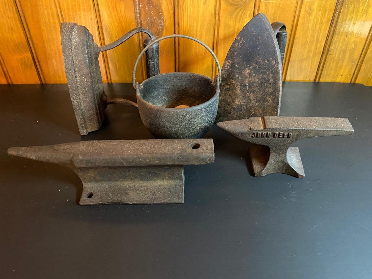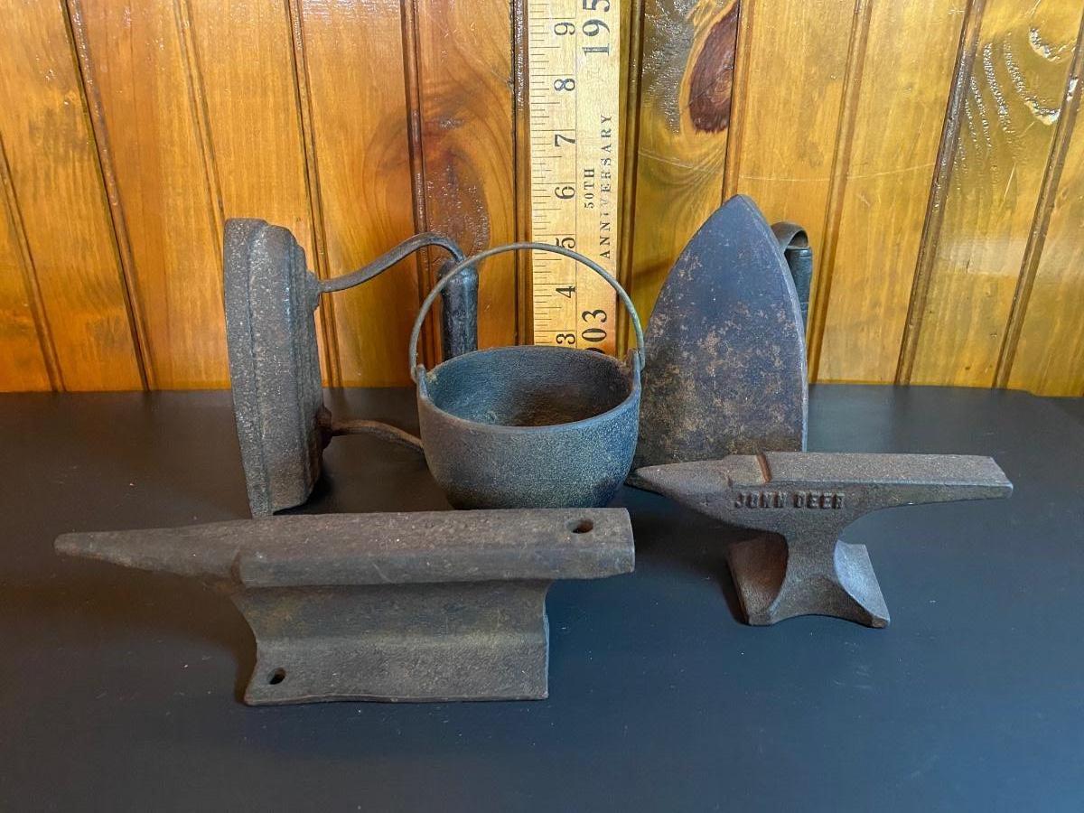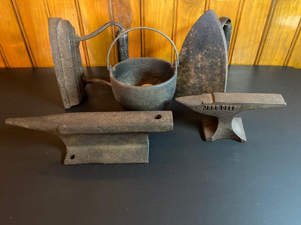 Lot 138: Vintage Cast Iron Flat Iron #C6 & U-DX #6 Iron, Cast Iron Melting Pot, John Deere Advertising Anvil Paperweight, Mini Jeweler Repair Anvil