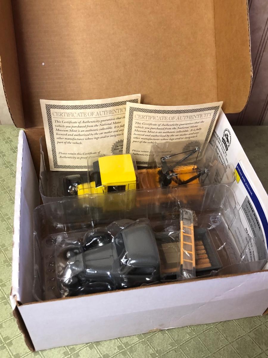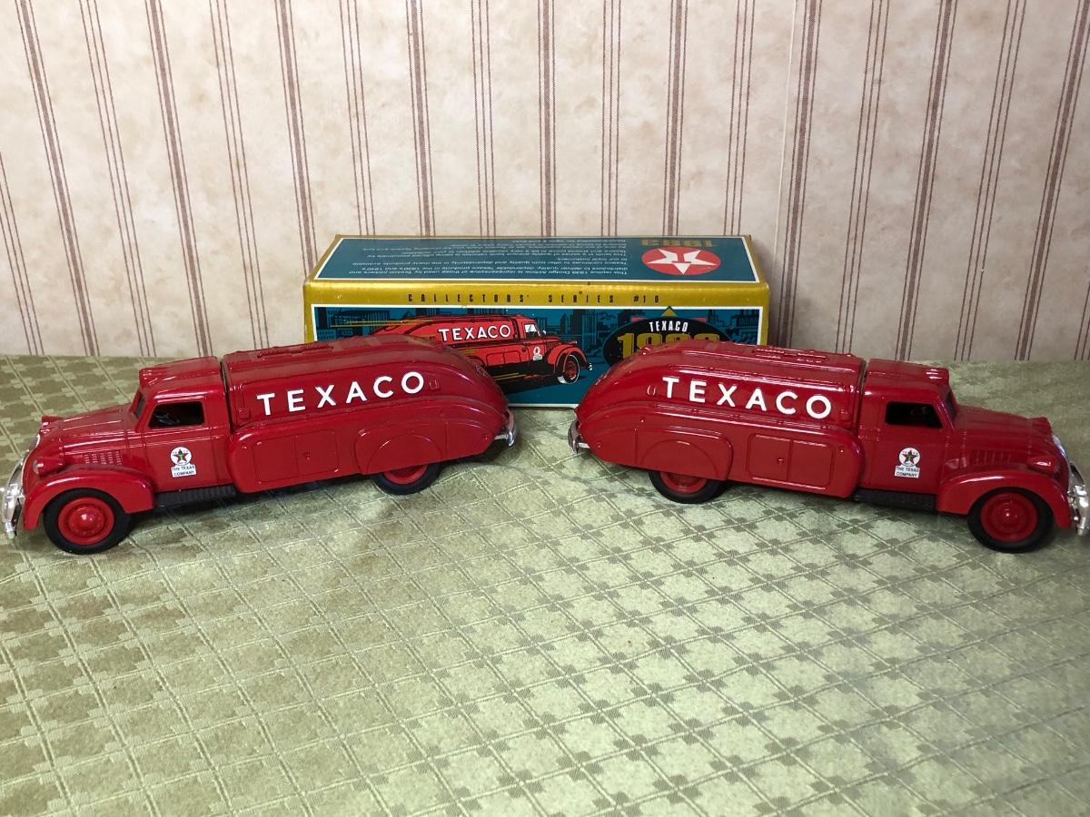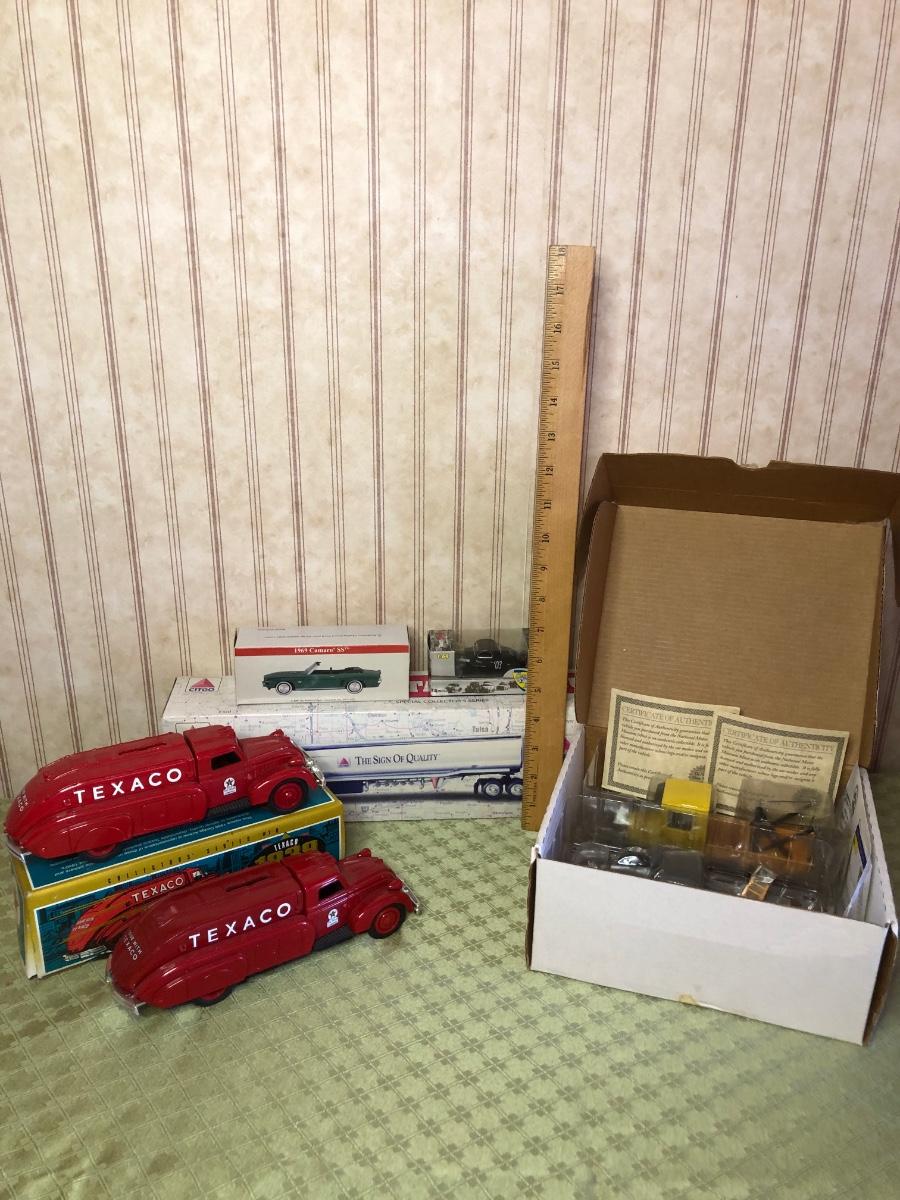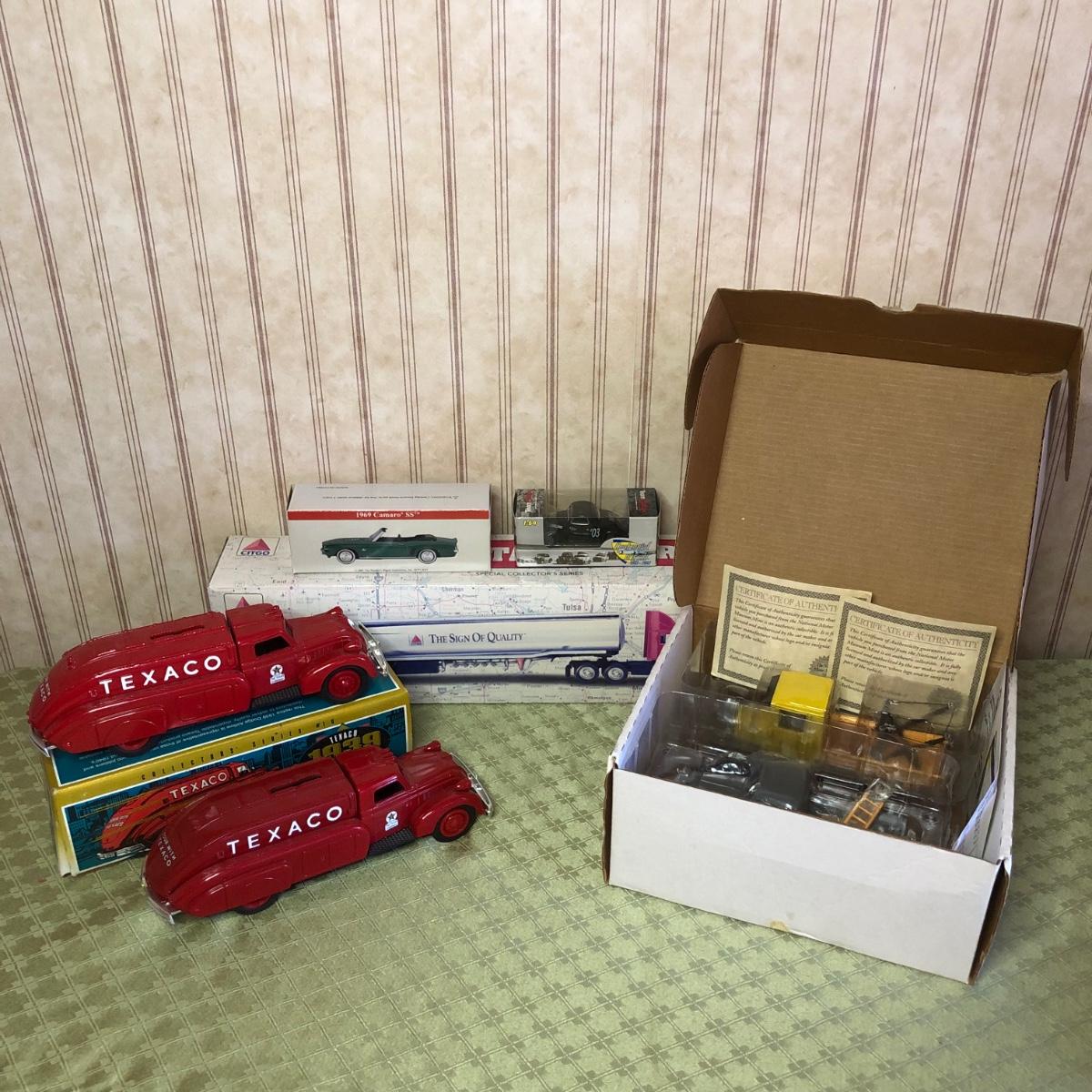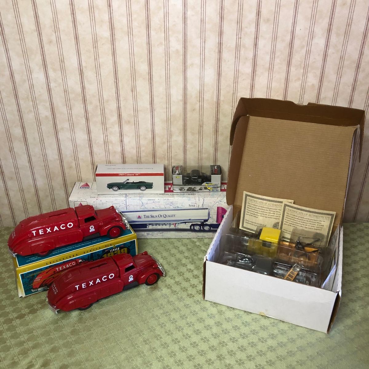 Includes Citgo Tanker Truck in box, Camaro model in box, two Texaco Airstream banks (Collectors series #10), two National Motor Mint Museum pickup truck models, and a Team Caliber Centennial Collection '03 model in box.