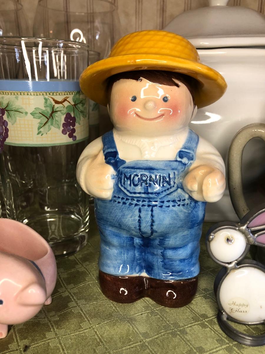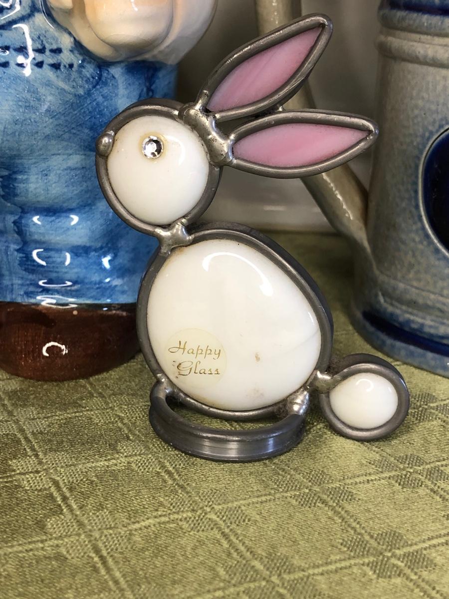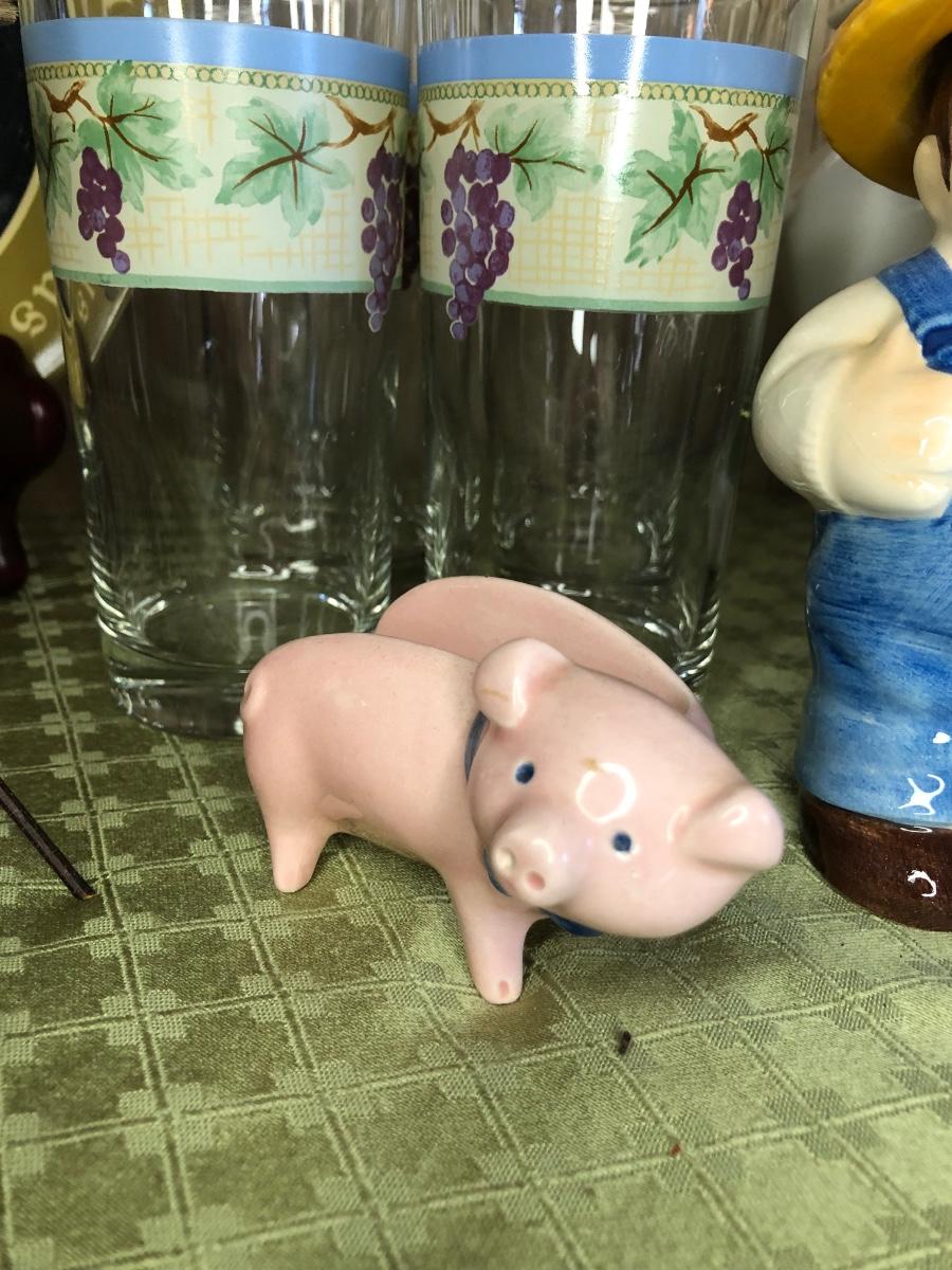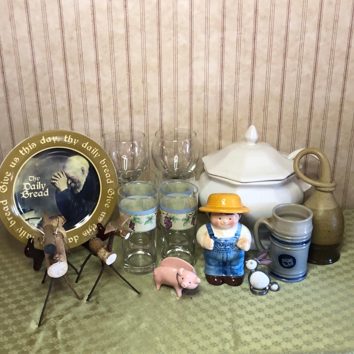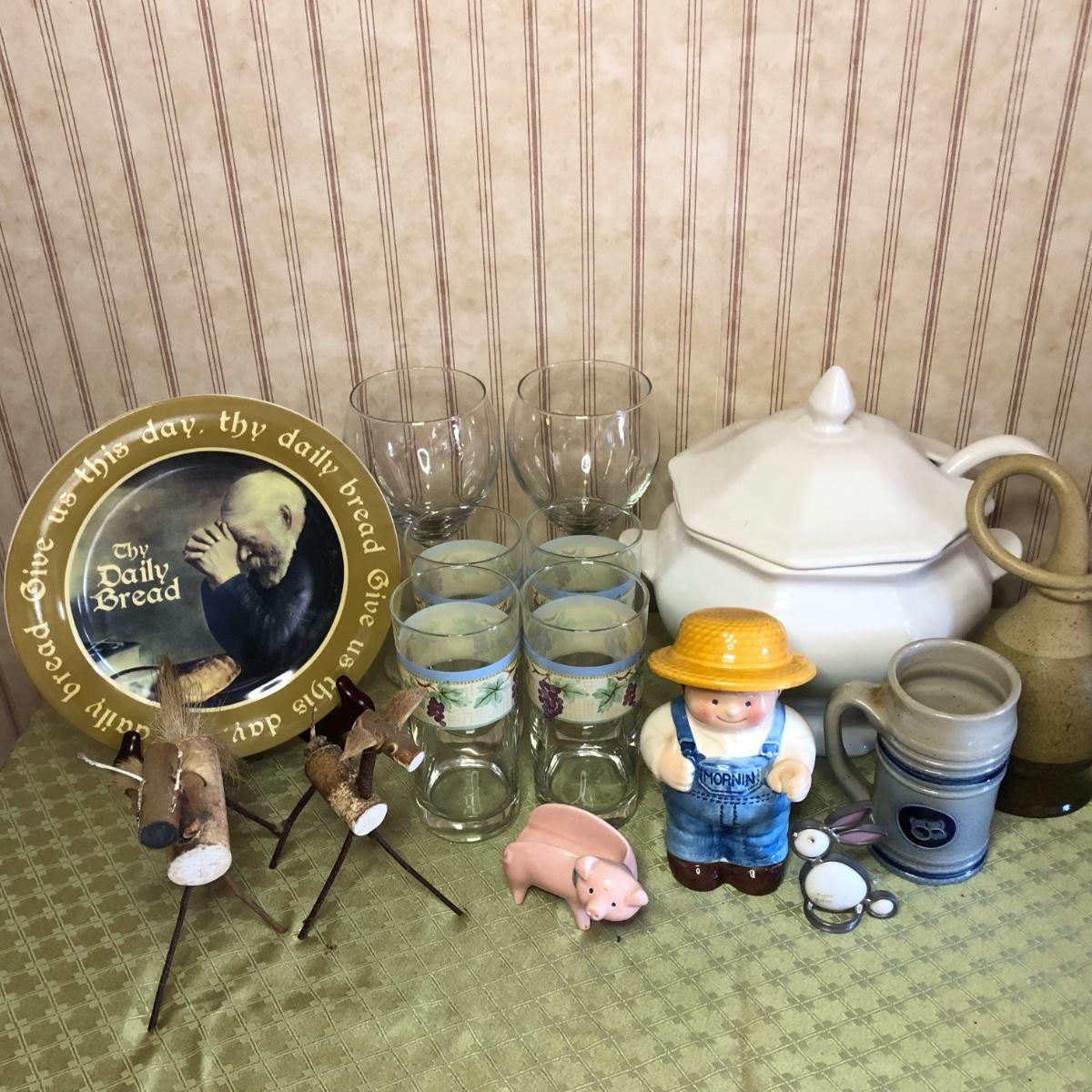Includes farm themed decorations, a large ceramic soup bowl, a vintage Irish Drinking horn, two wine glasses, four glasses with grape design, wooden deer sculptures, pottery farmer sculpture, and a Happy Glass rabbit.