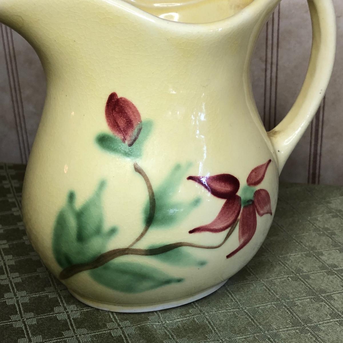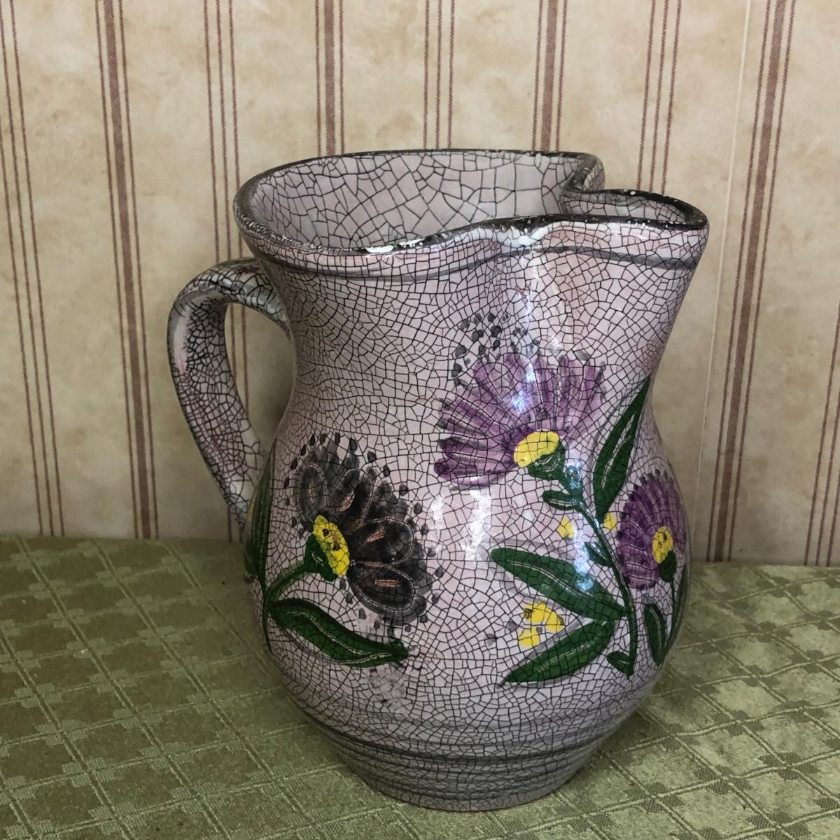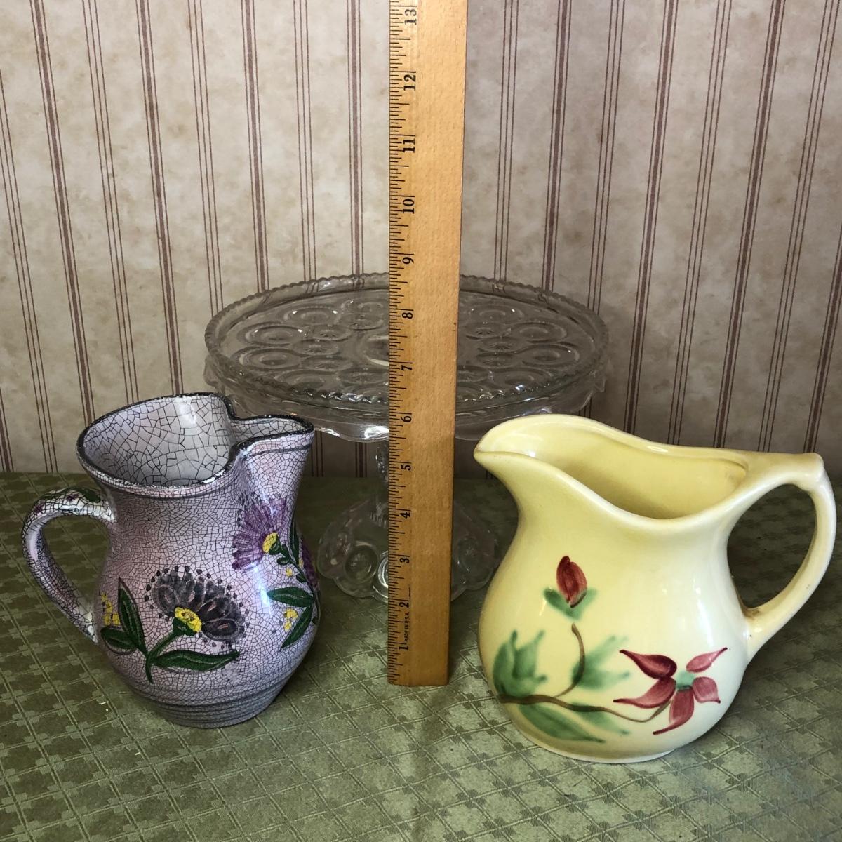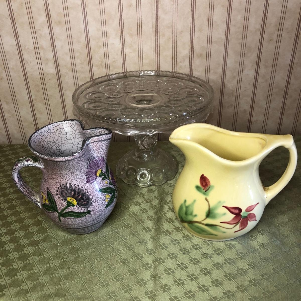 LOT 176M: Small Roseville Pitcher, Cut Glass Cake Stand, & Purple Pottery Pitcher