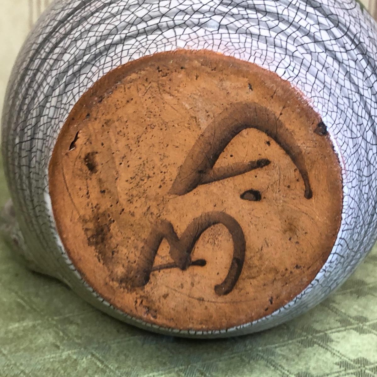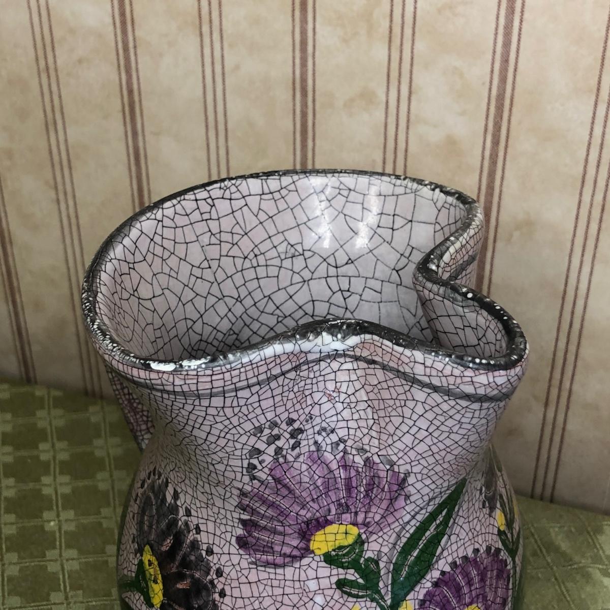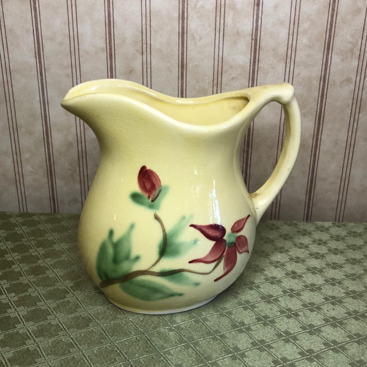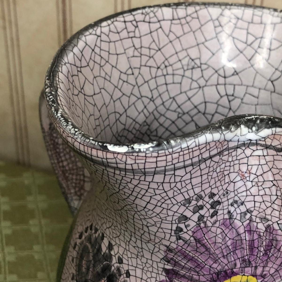 LOT 176M: Small Roseville Pitcher, Cut Glass Cake Stand, & Purple Pottery Pitcher