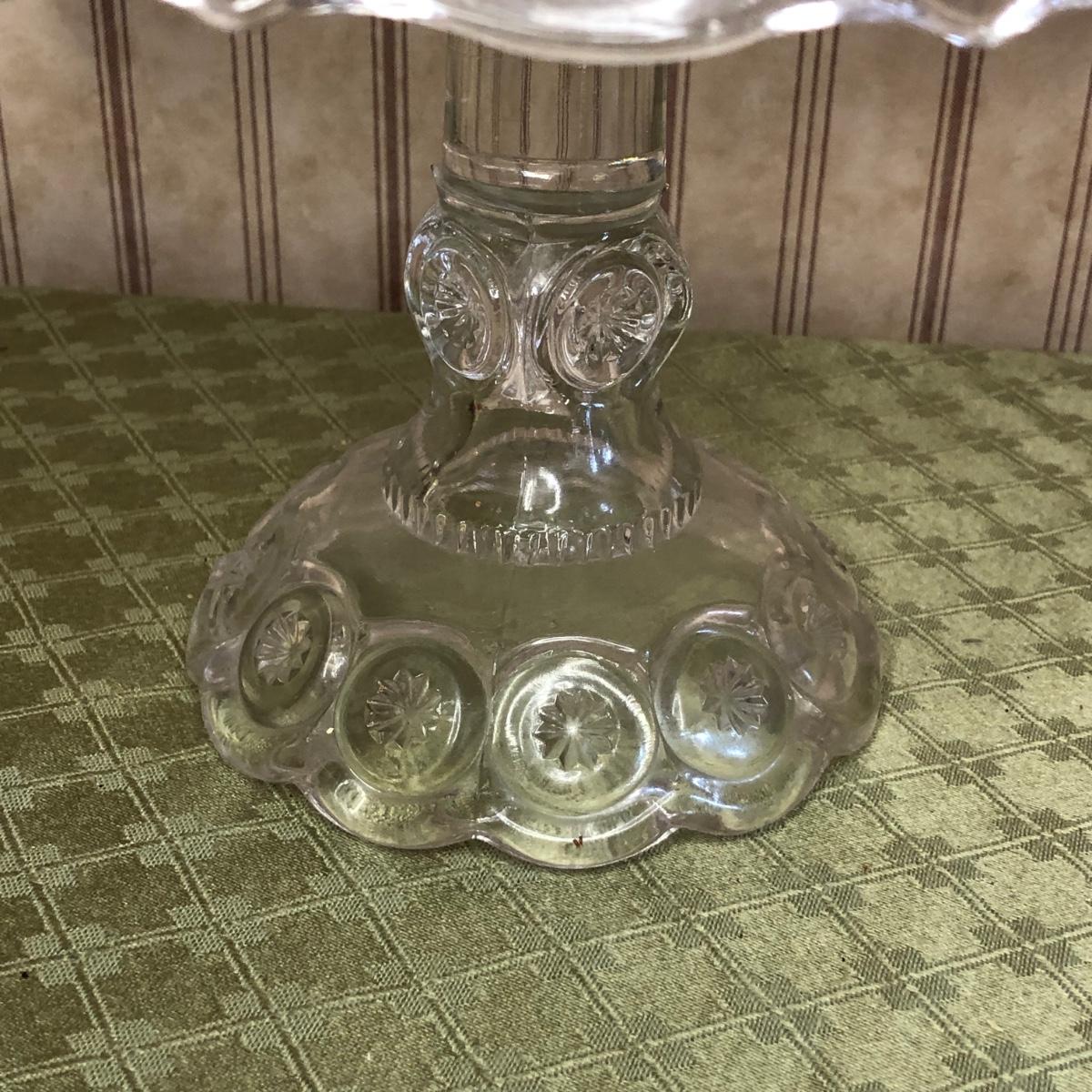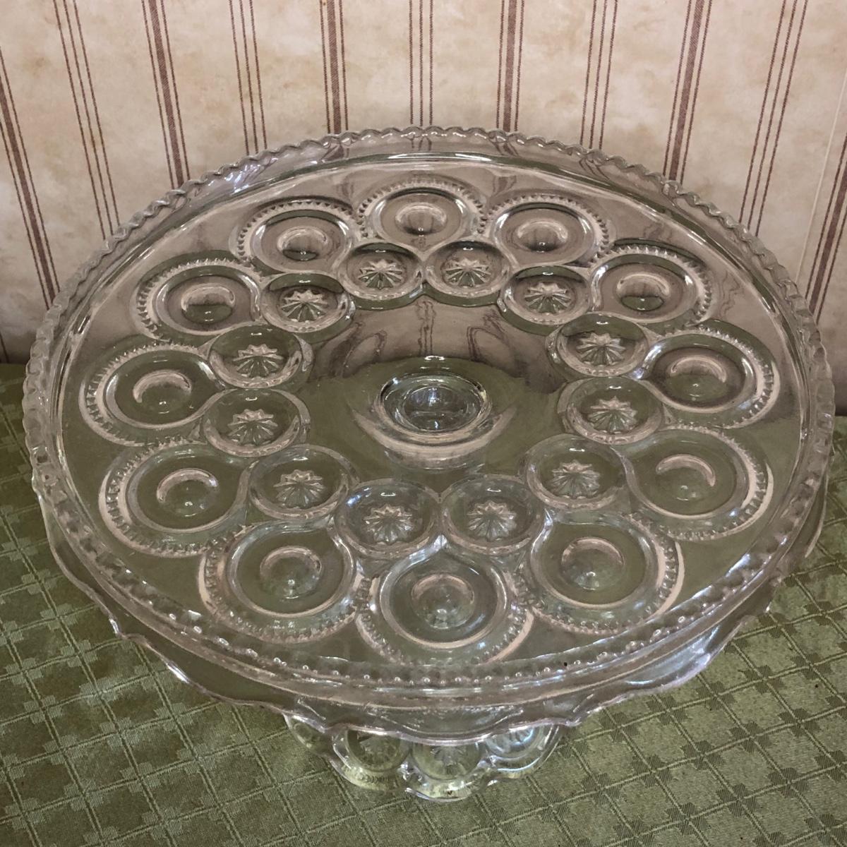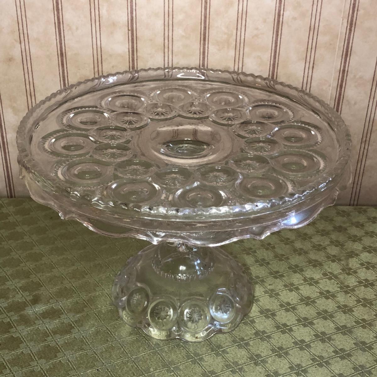 Includes two small pitchers and a cake stand with a unique circle design on it.